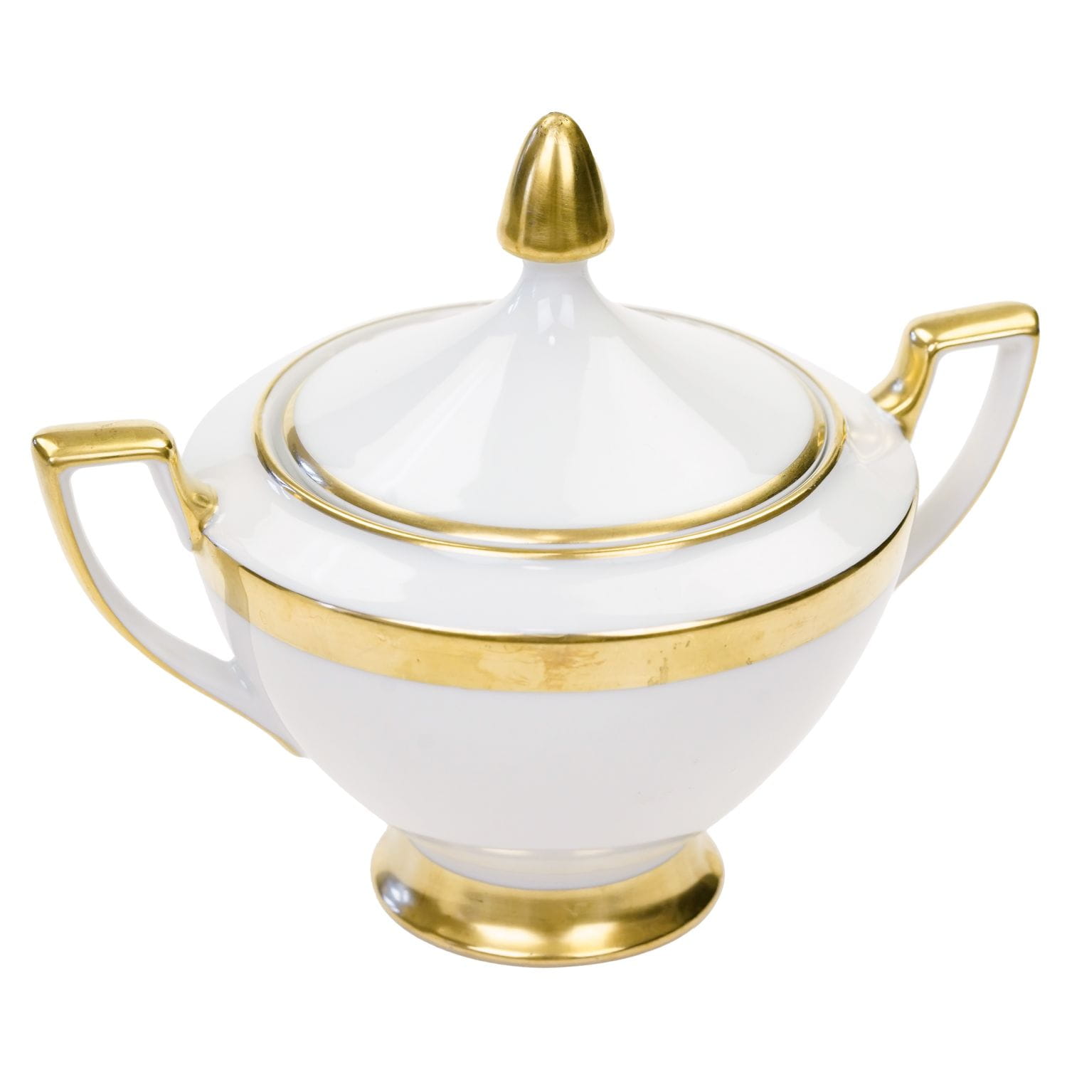 Pochodzi z Selb z Heinrich & Co. KG. Fason Empire. Sygnowana znakiem stosowanym od 1939 roku. Porcelana w kolorze bieli, o prostej, ale tradycyjnej formie, osadzona na praktycznej stopie. Ranty, uszy i sterczynka złocone.