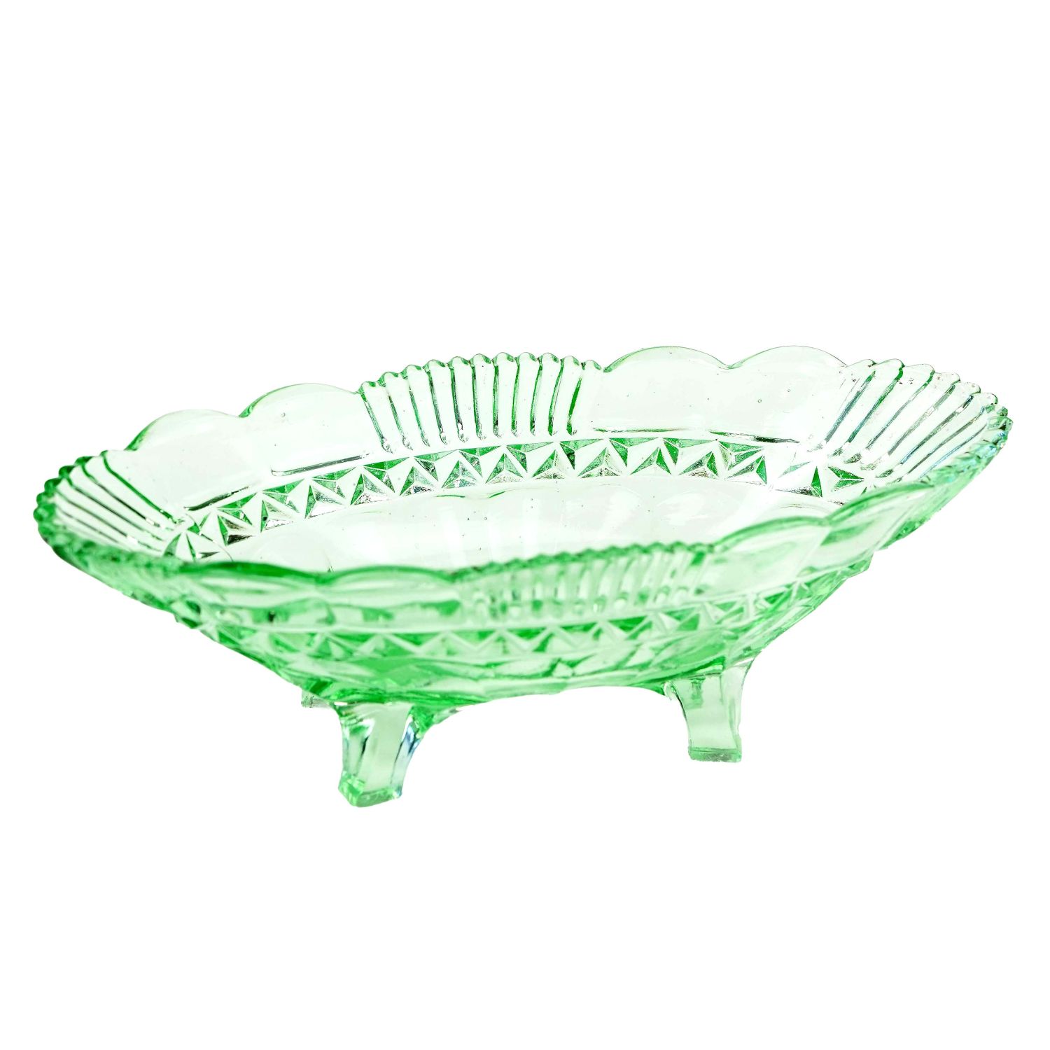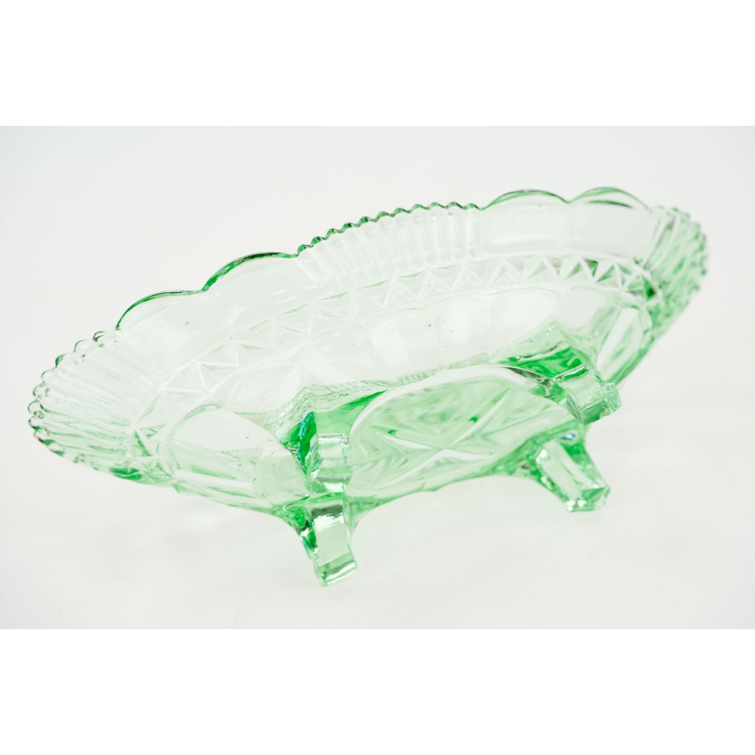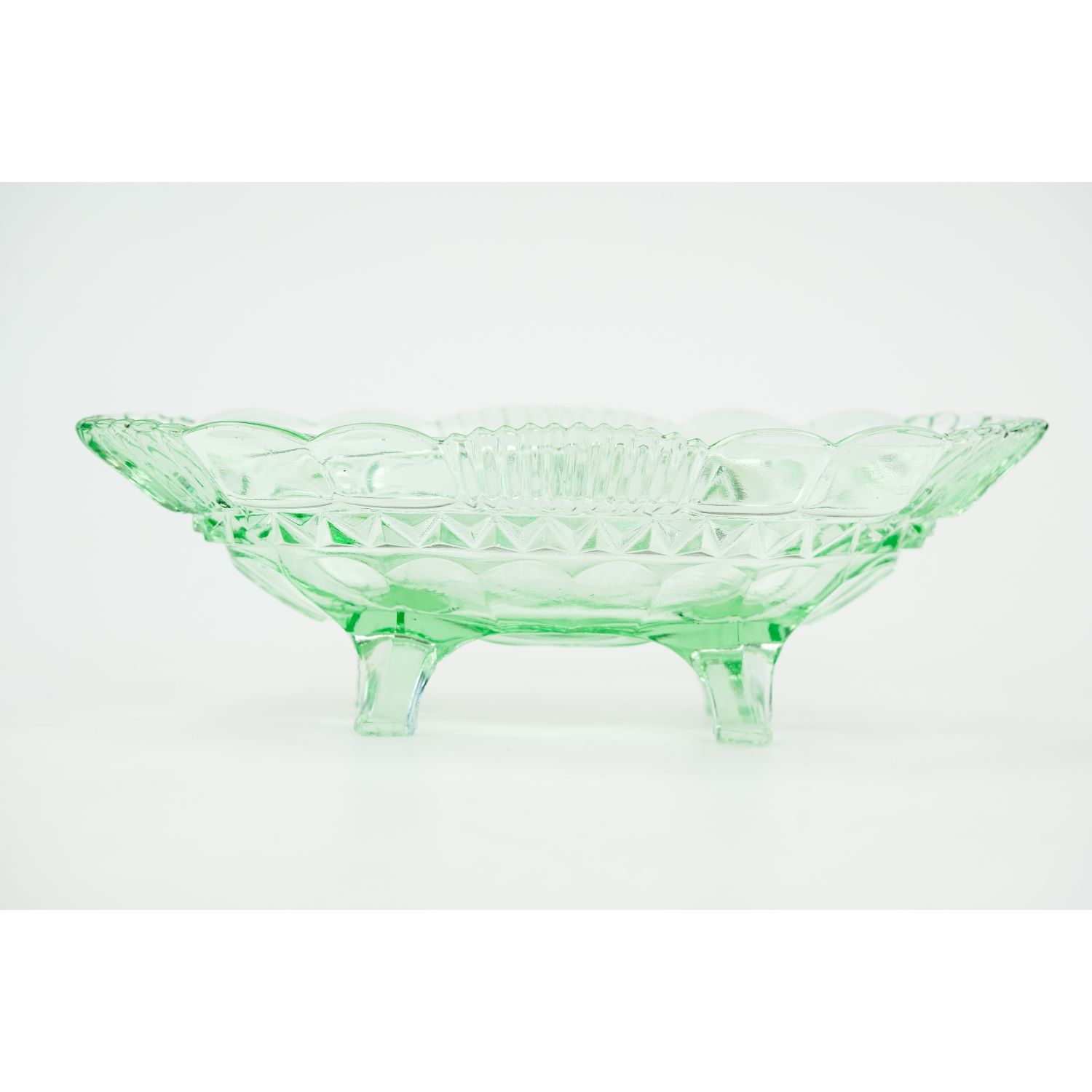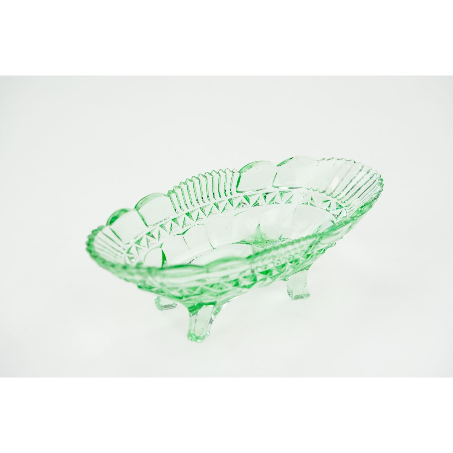 Pochodzi z huty szkła Hortensja z Piotrkowa Trybunalskiego, numer katalogowy z 1936 roku, to 355. Szkło prasowane w odcieniu uranowej zieleni. Dekorowana tłoczeniami w stylu Art-Deco. Paterka ma owalny kształt, osadzona na czterech nóżkach.