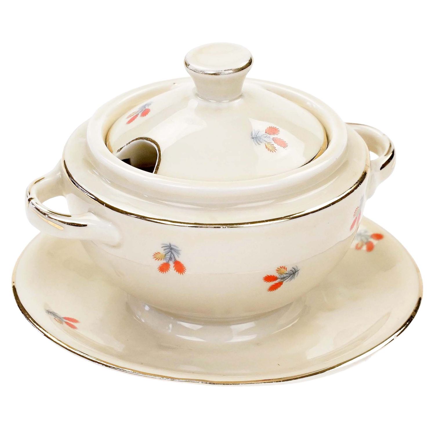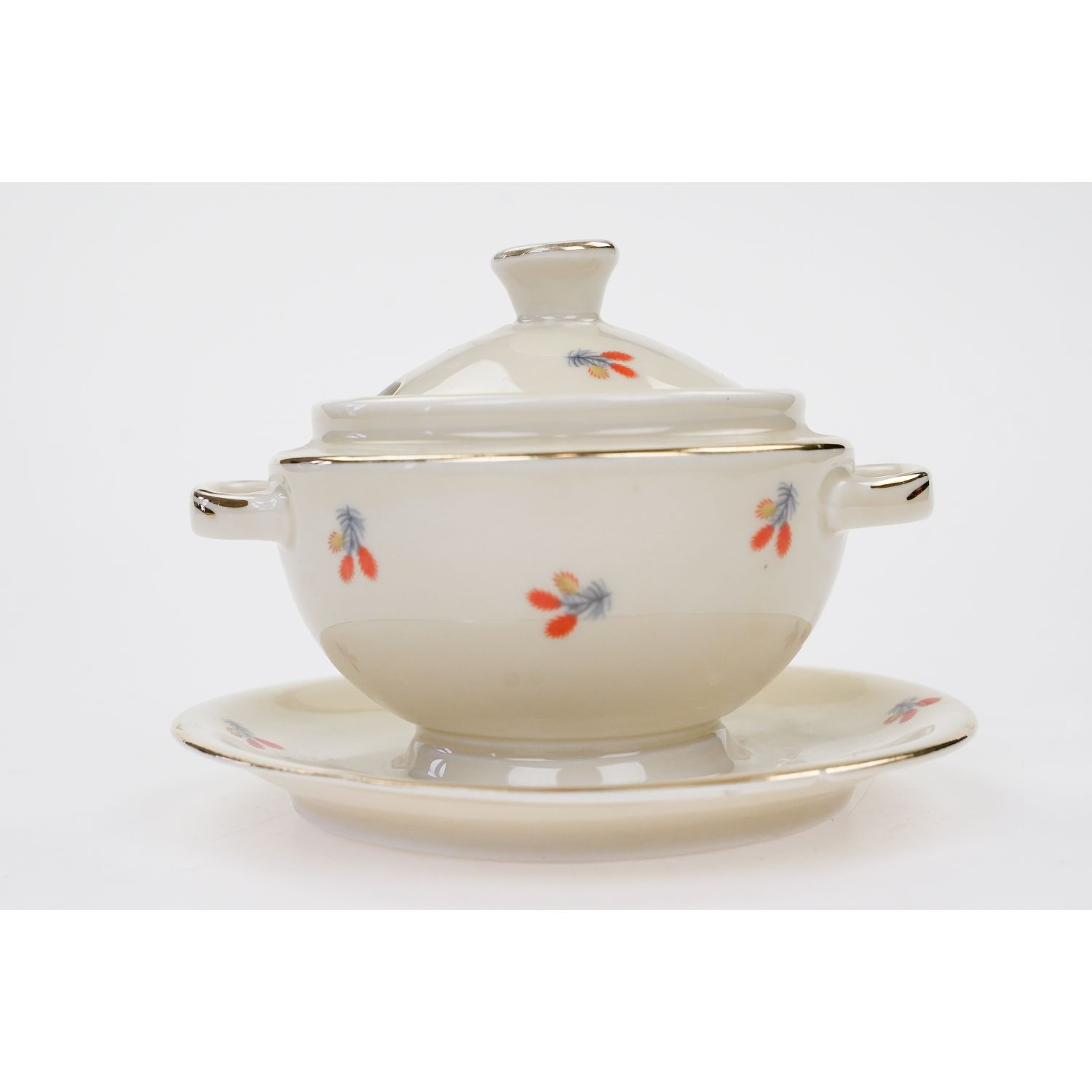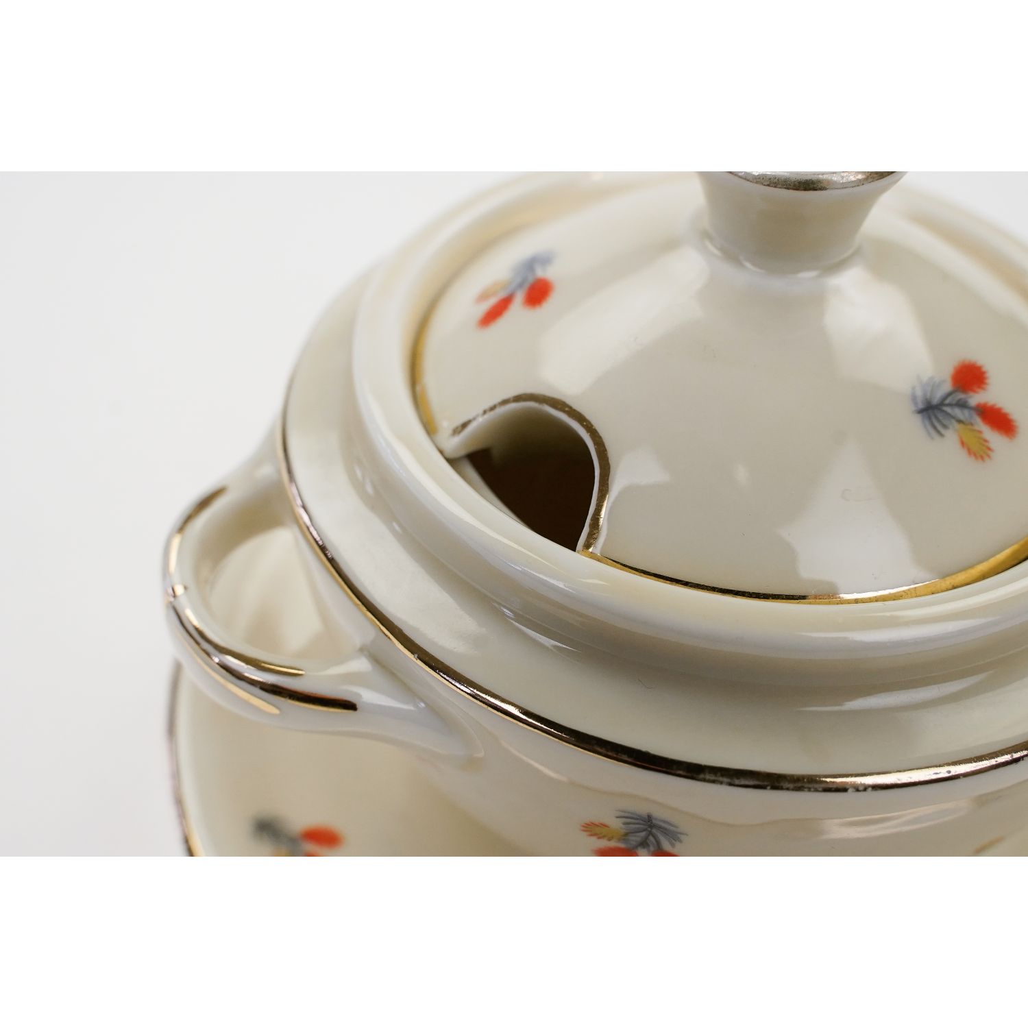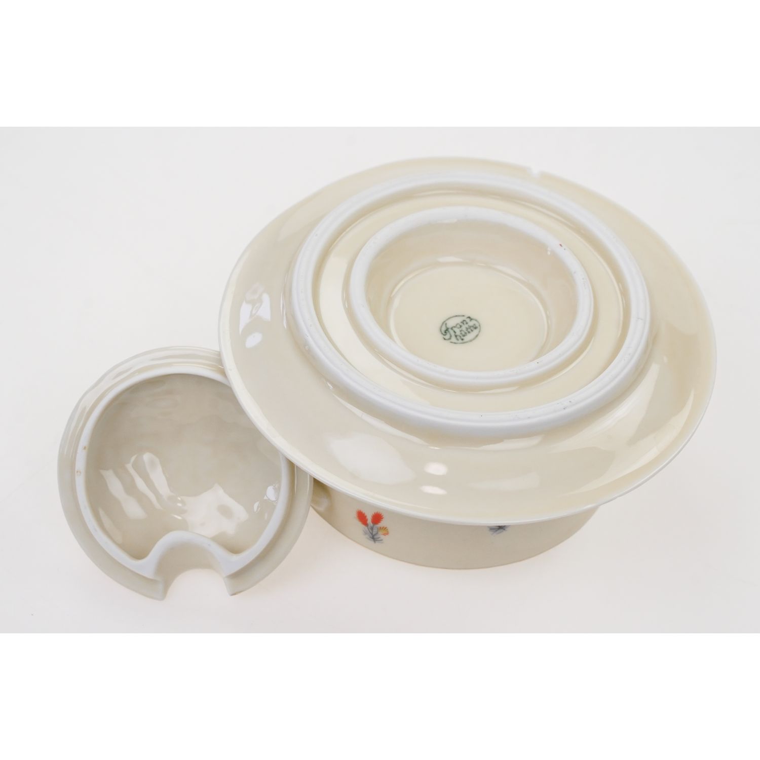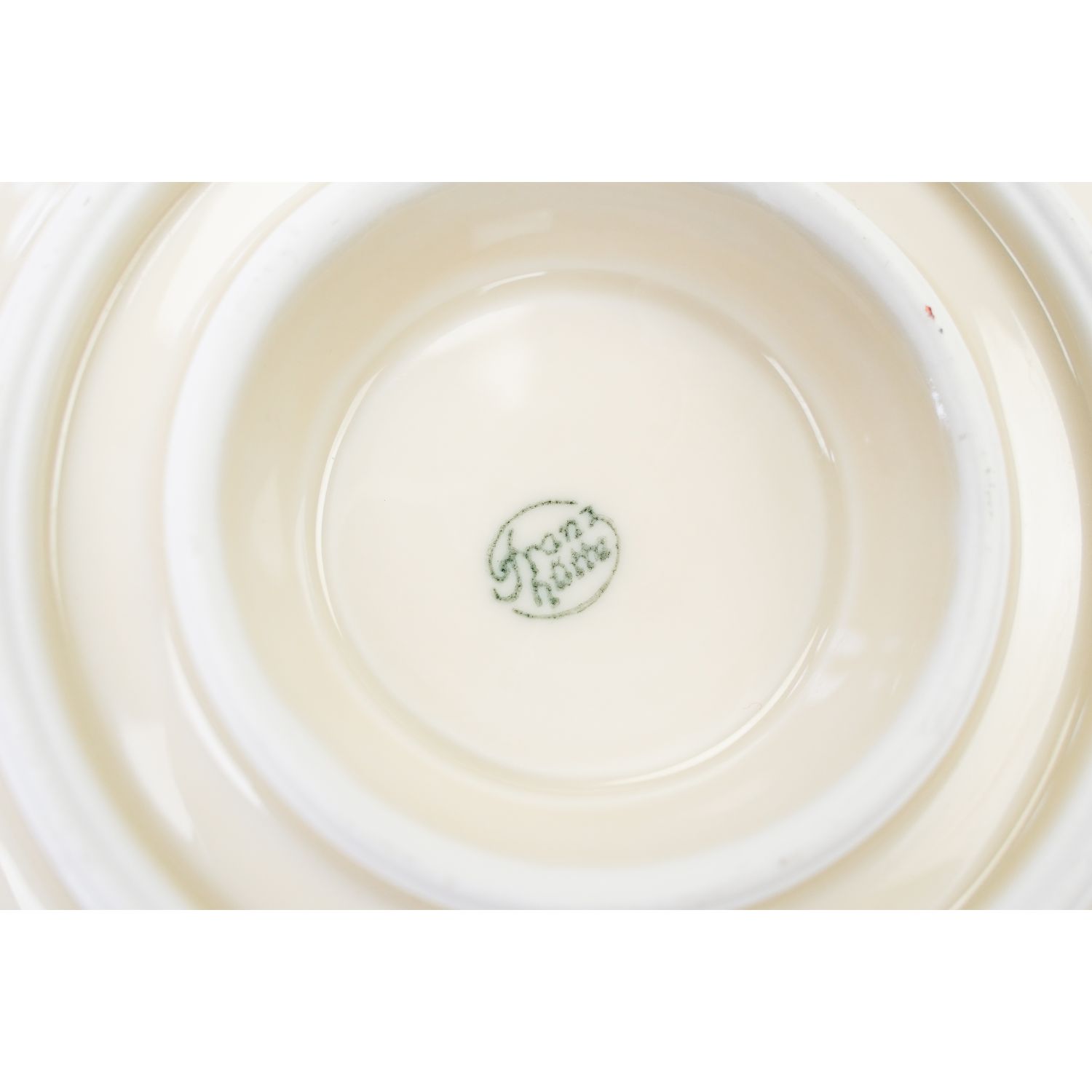 Pochodzi z Górnego Śląska z Rudy Śląskiej-Bykowiny z Franzhütte Porzellanfabrik GmbH. Sygnatura z okresu drugiej wojny światowej. Na porcelanie pomarańczowe kwiatuszki. Kontury kiedyś obwiedzione złotą obwódką, obecnie w śladowej ilości.