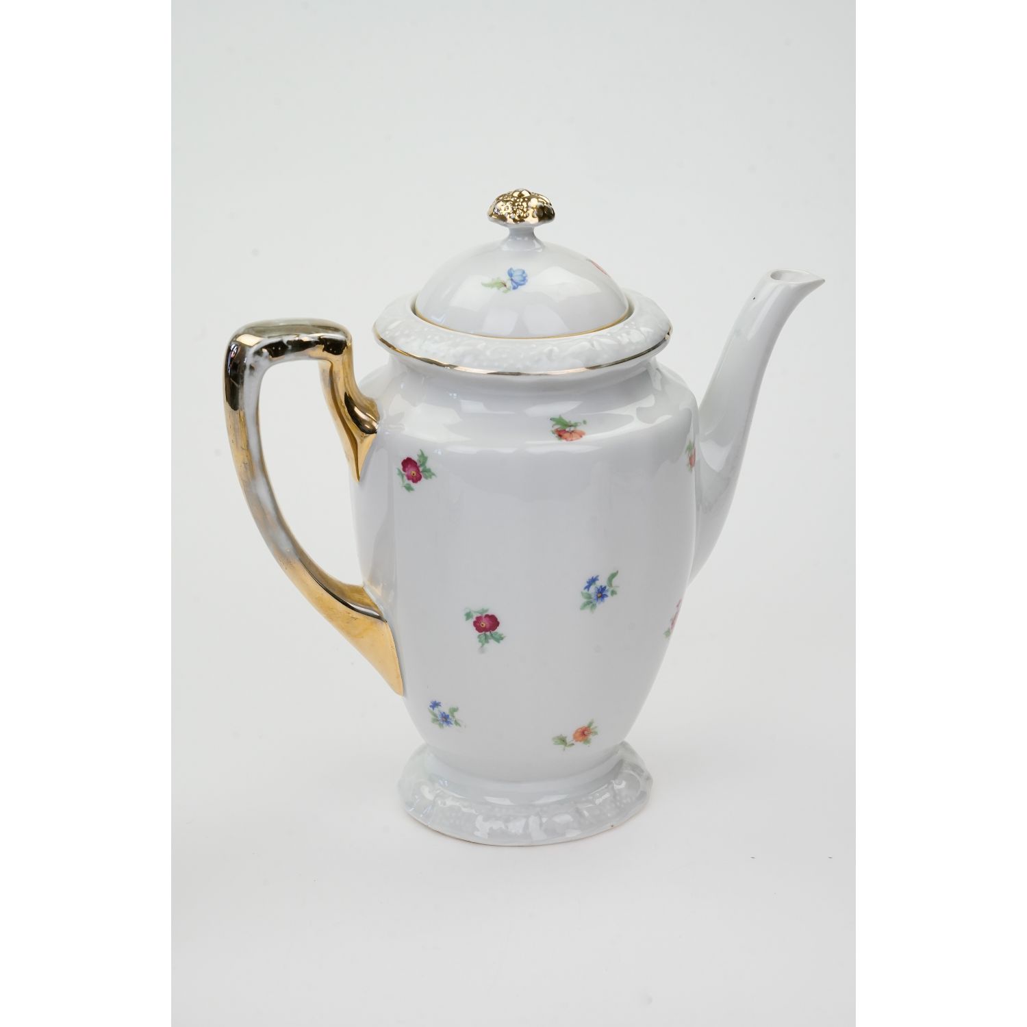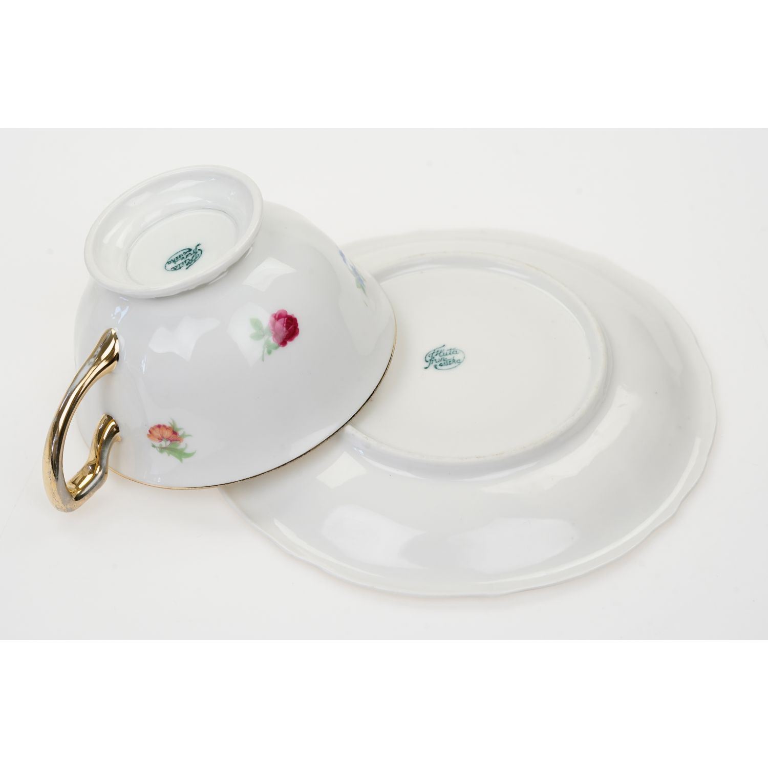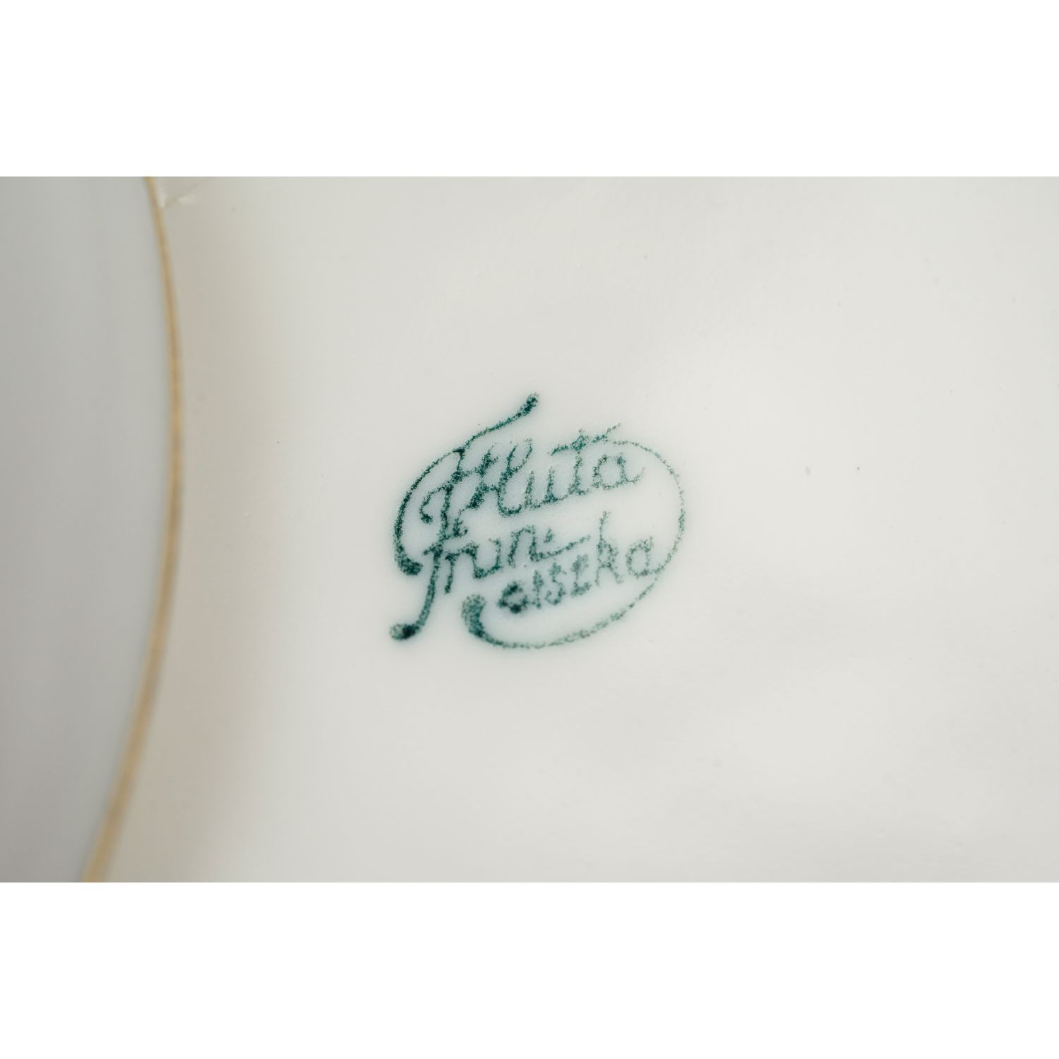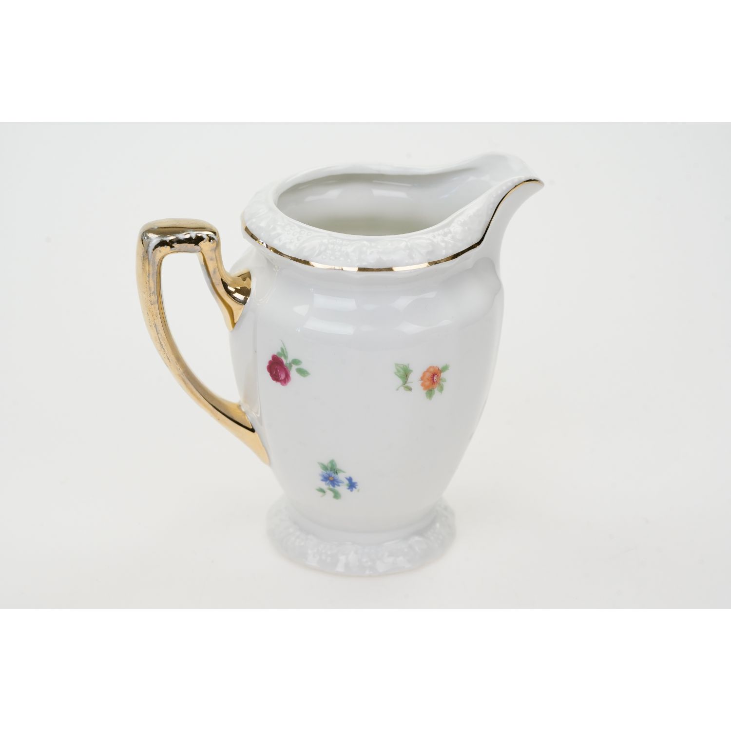 Pochodzi z Górnego Śląska z Rudy Śląskiej-Bykowiny z Franzhütte Porzellanfabrik GmbH. Sygnatura z okresu 1935 do 1939 roku. Fason Potsdam. Porcelana biała dekorowana ślicznymi, kwiatowymi, wyrazistymi reliefami. Na porcelanie rozrzucone barwne, różnorodne kwiatuszki. Kontury obwiedzione złotą obwódką i w pełni złocone uszka.