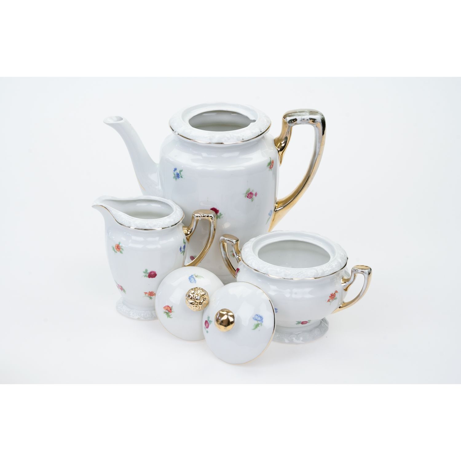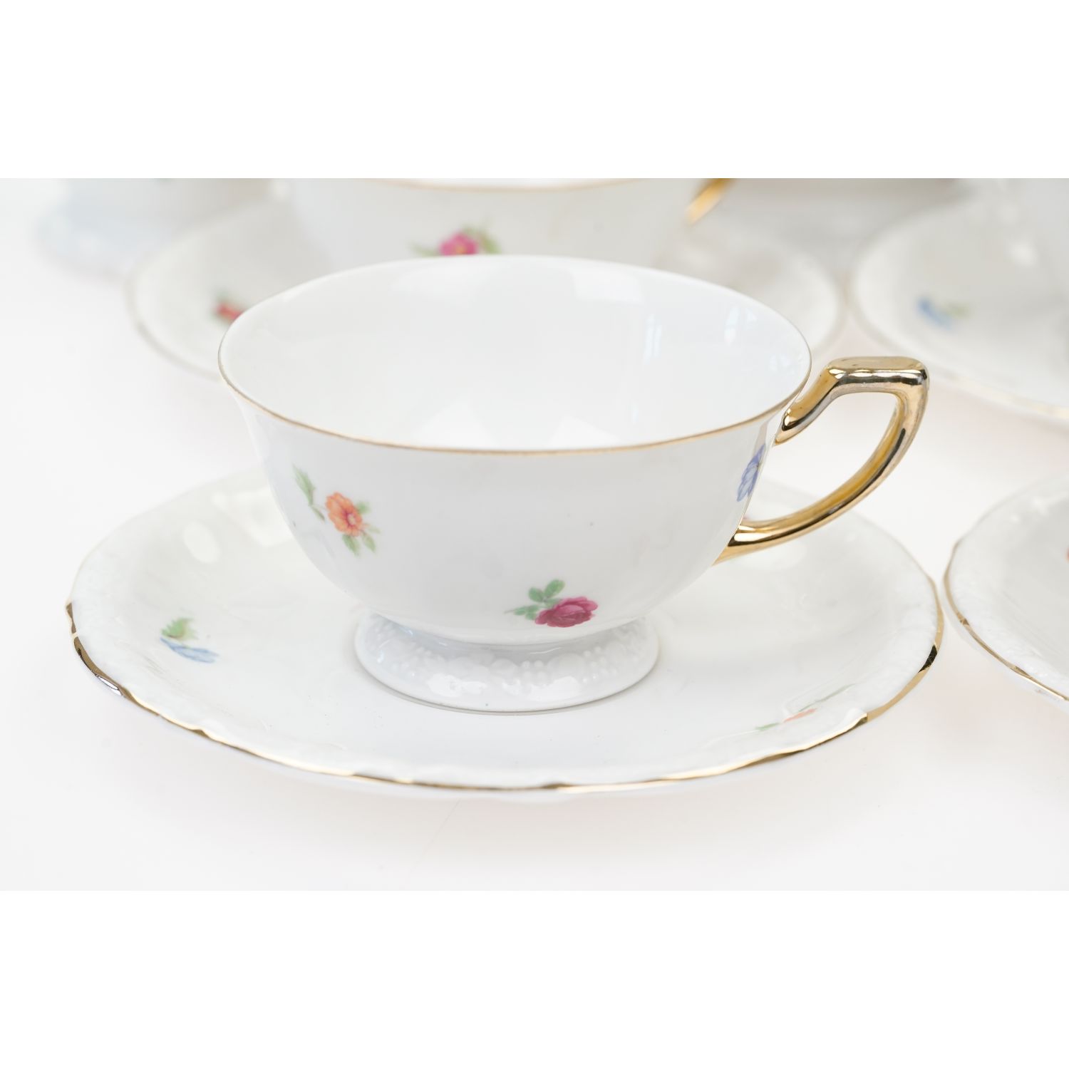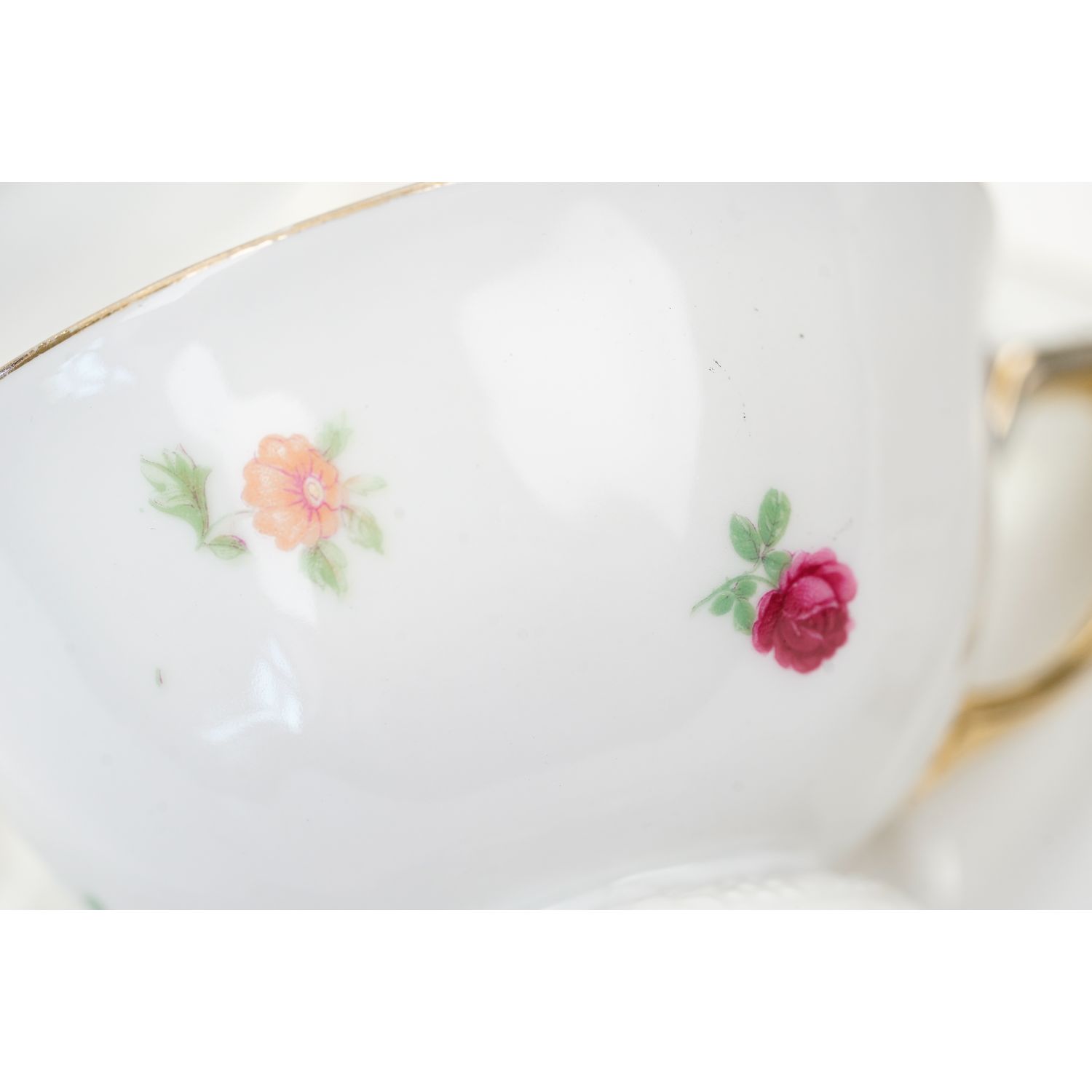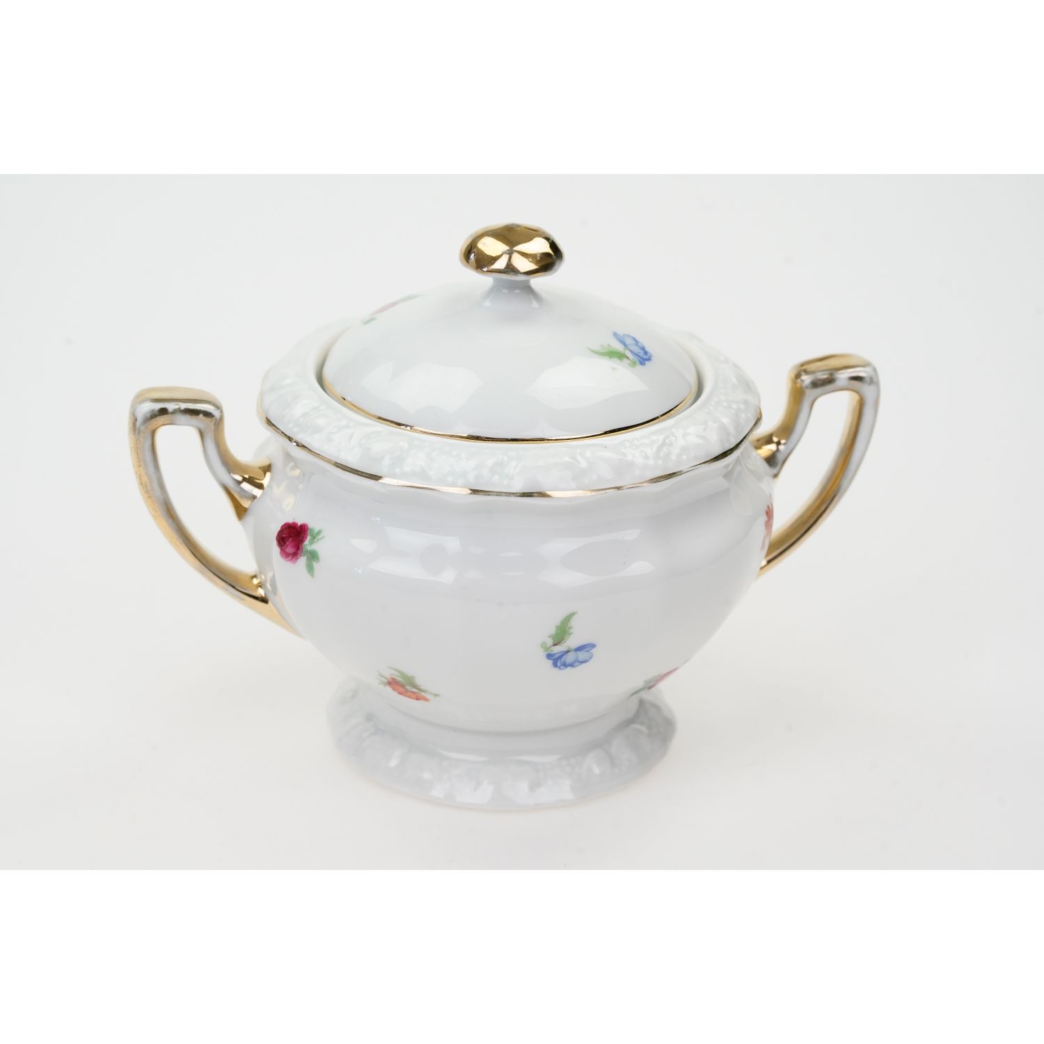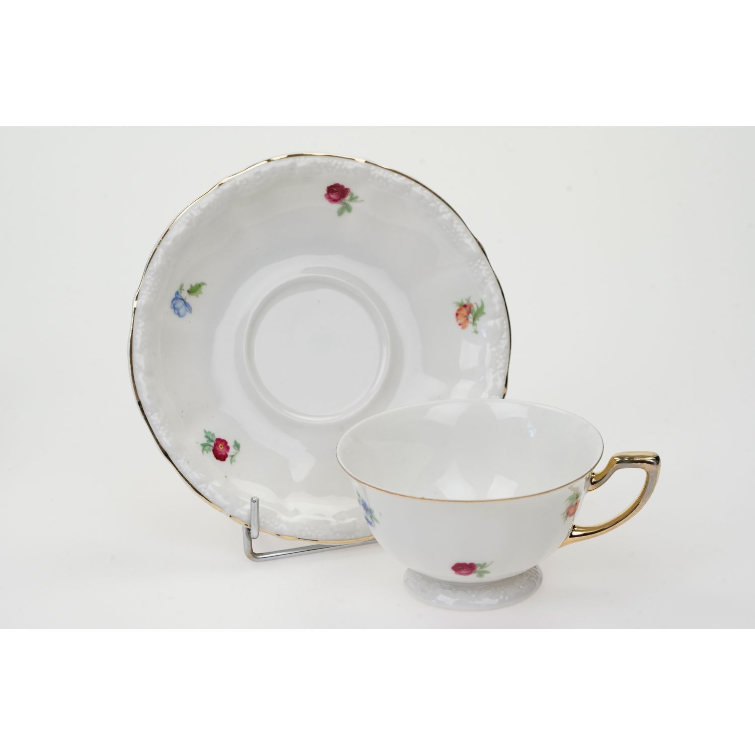 Pochodzi z Górnego Śląska z Rudy Śląskiej-Bykowiny z Franzhütte Porzellanfabrik GmbH. Sygnatura z okresu 1935 do 1939 roku. Fason Potsdam. Porcelana biała dekorowana ślicznymi, kwiatowymi, wyrazistymi reliefami. Na porcelanie rozrzucone barwne, różnorodne kwiatuszki. Kontury obwiedzione złotą obwódką i w pełni złocone uszka.