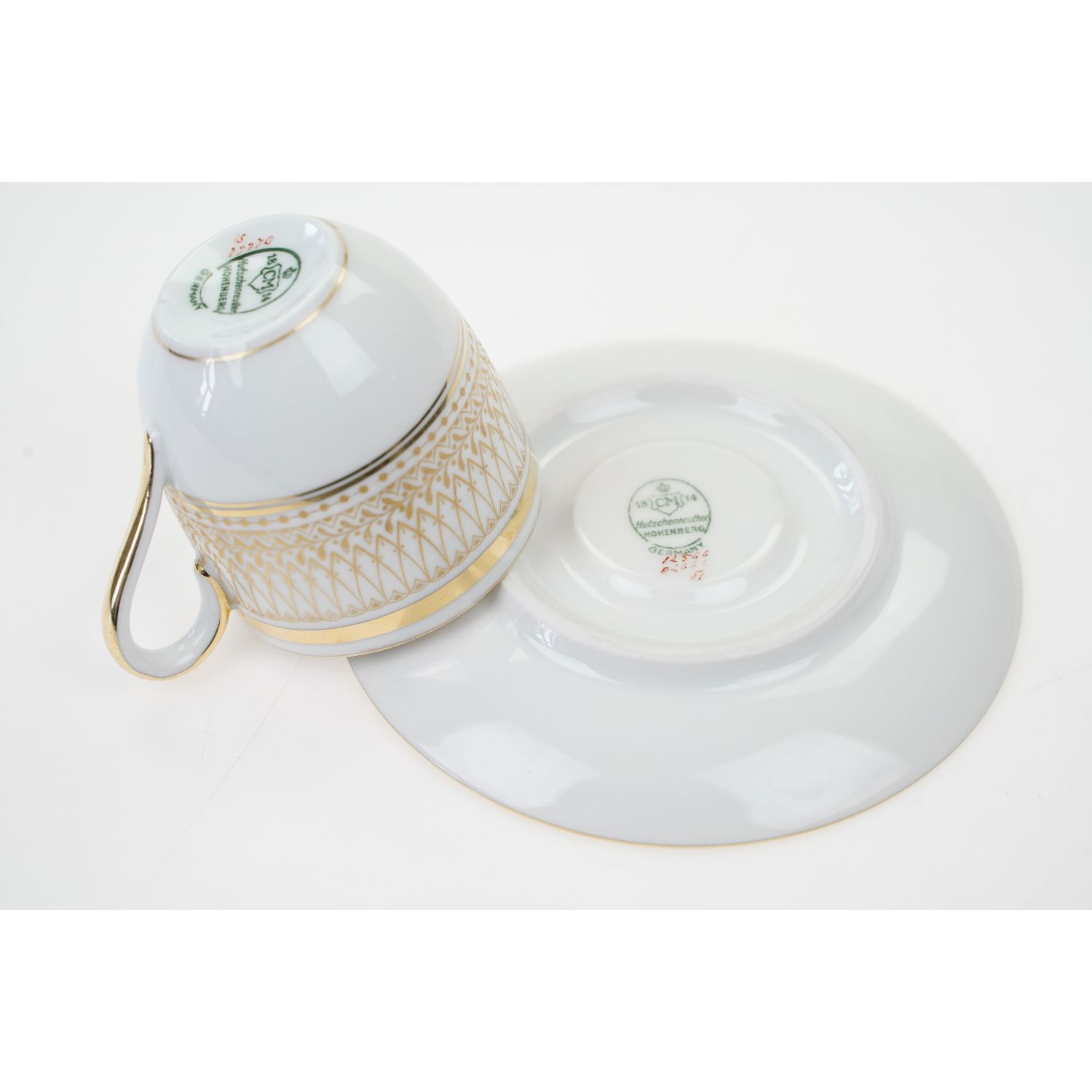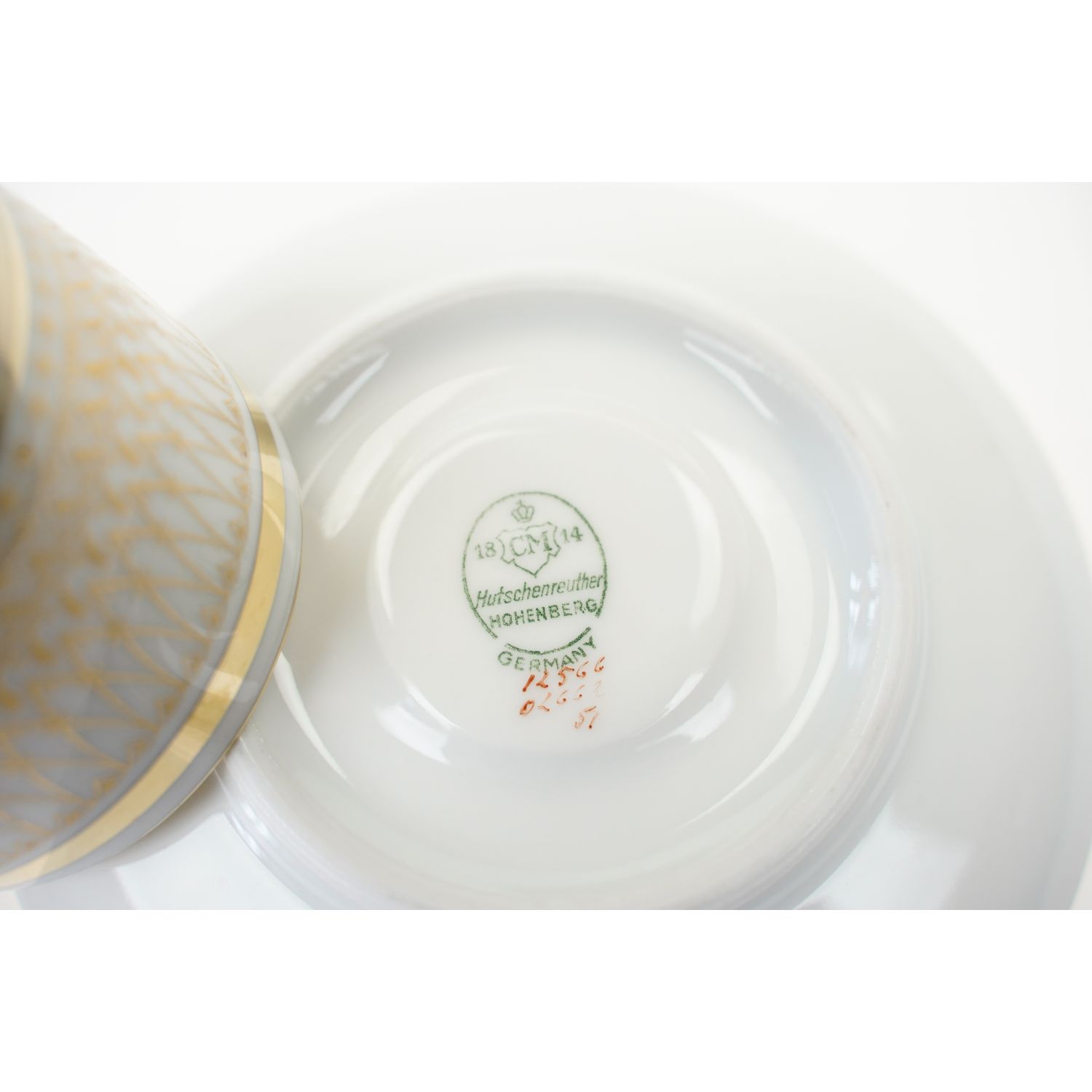 Pochodzi z Porzellanfabrik C. M. Hutschenreuther z miejscowości Hohenberg. Sygnowana znakiem stosowanym od 1948 do 1970 roku. Wykonana z porcelany w kolorze białym. Na obu elementach misterne złote wzory. Kontury okraszone delikatnymi złoceniami.