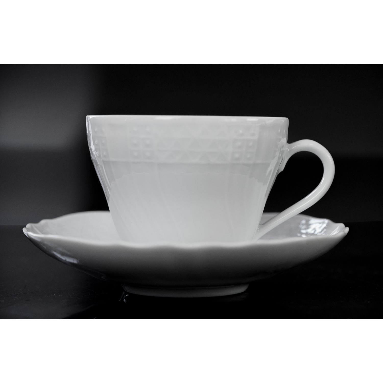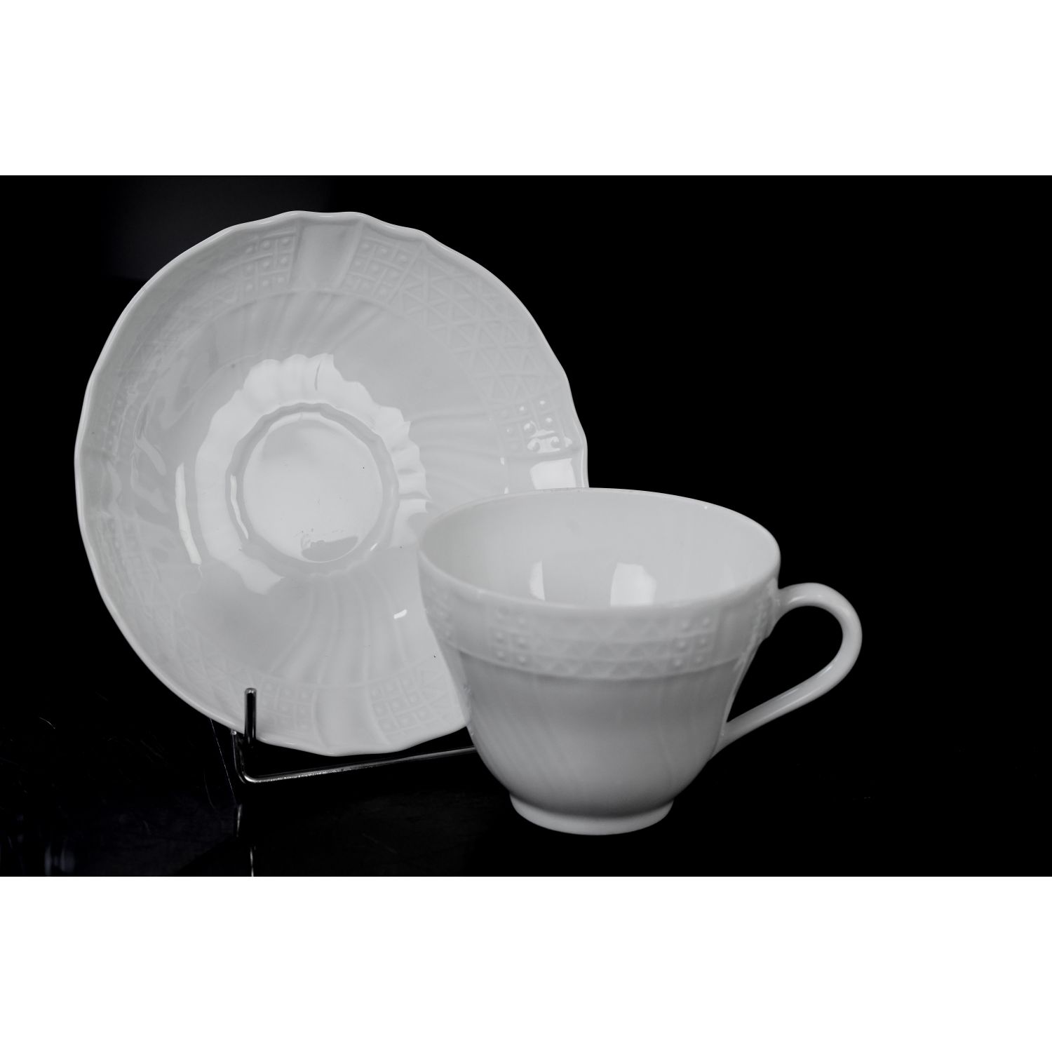 Przepiękny zestaw z białej porcelany, składający się z filiżanki i spodka.