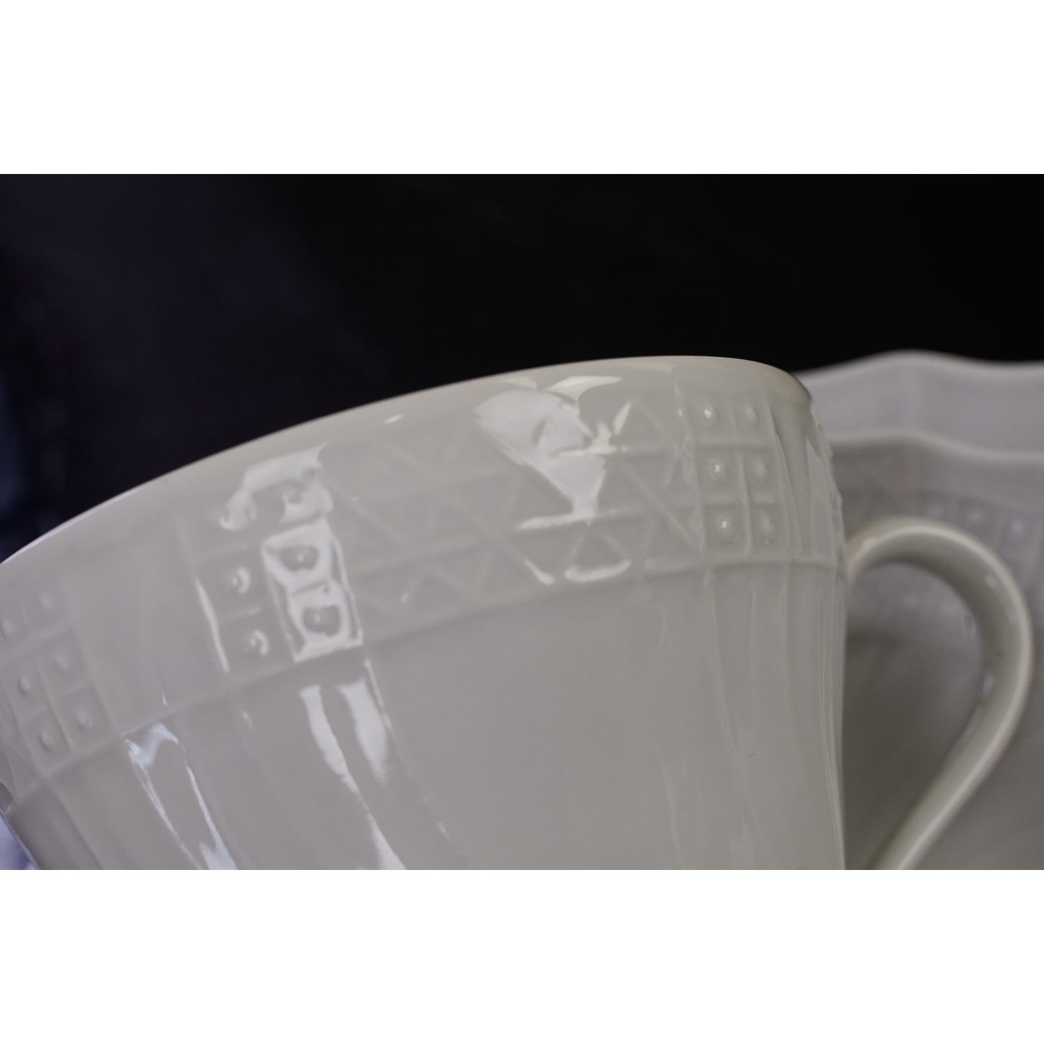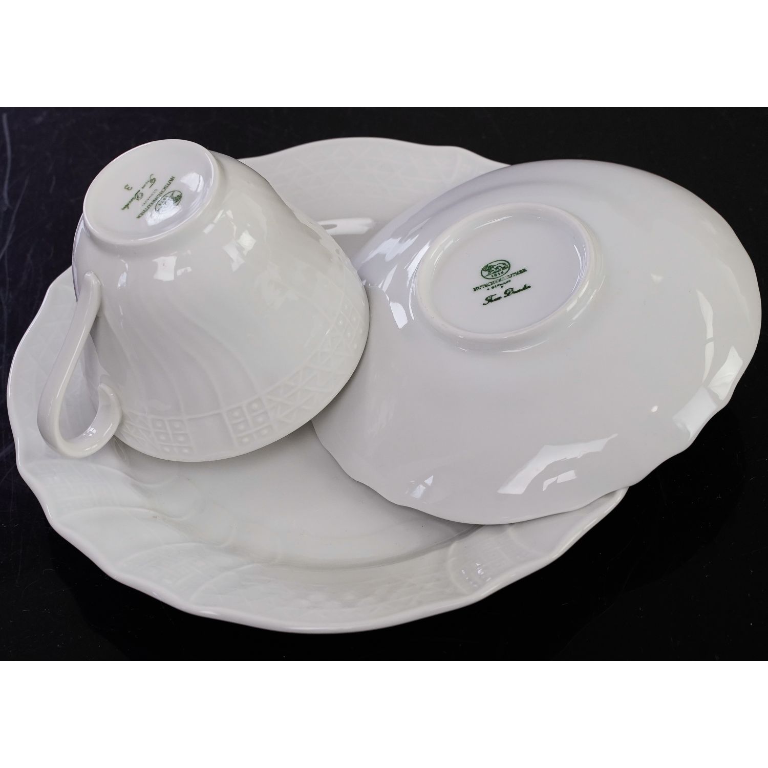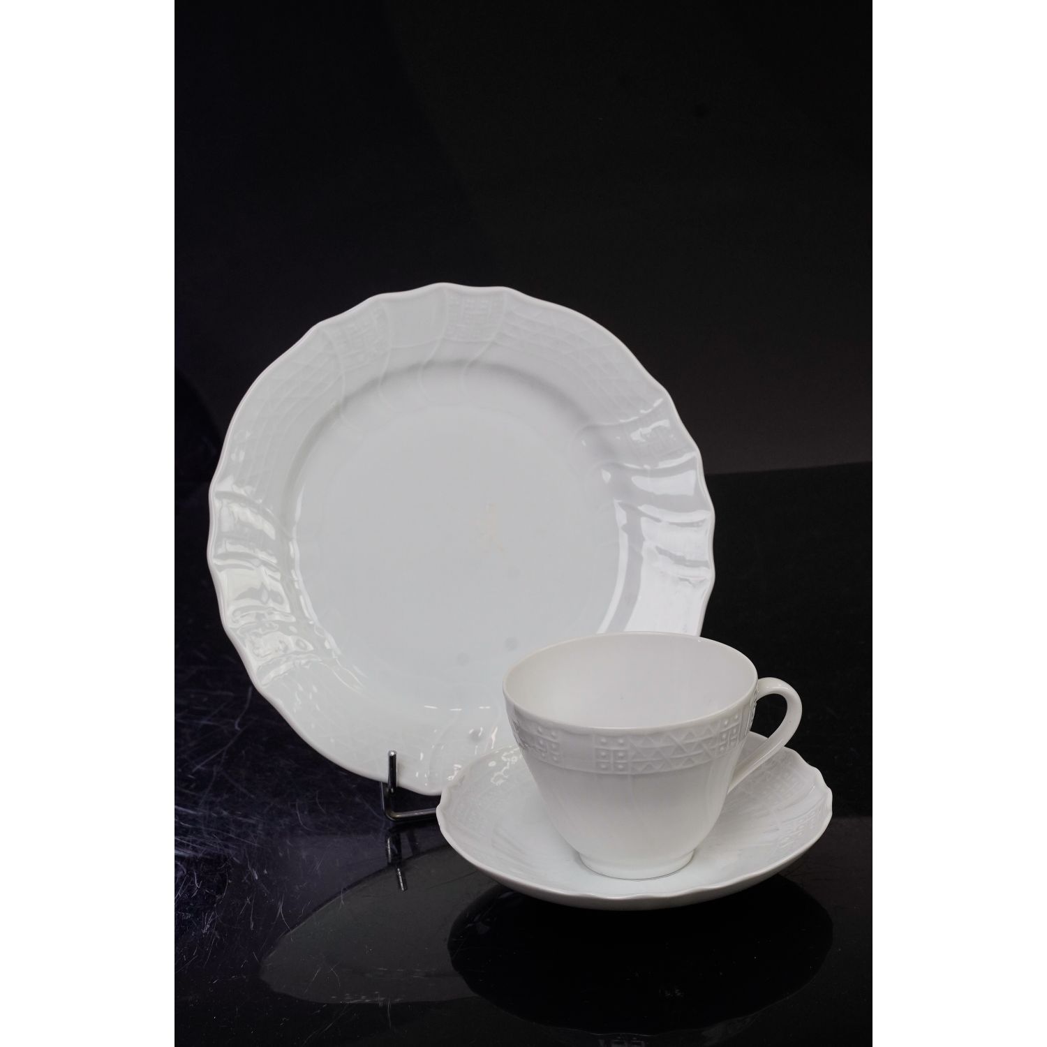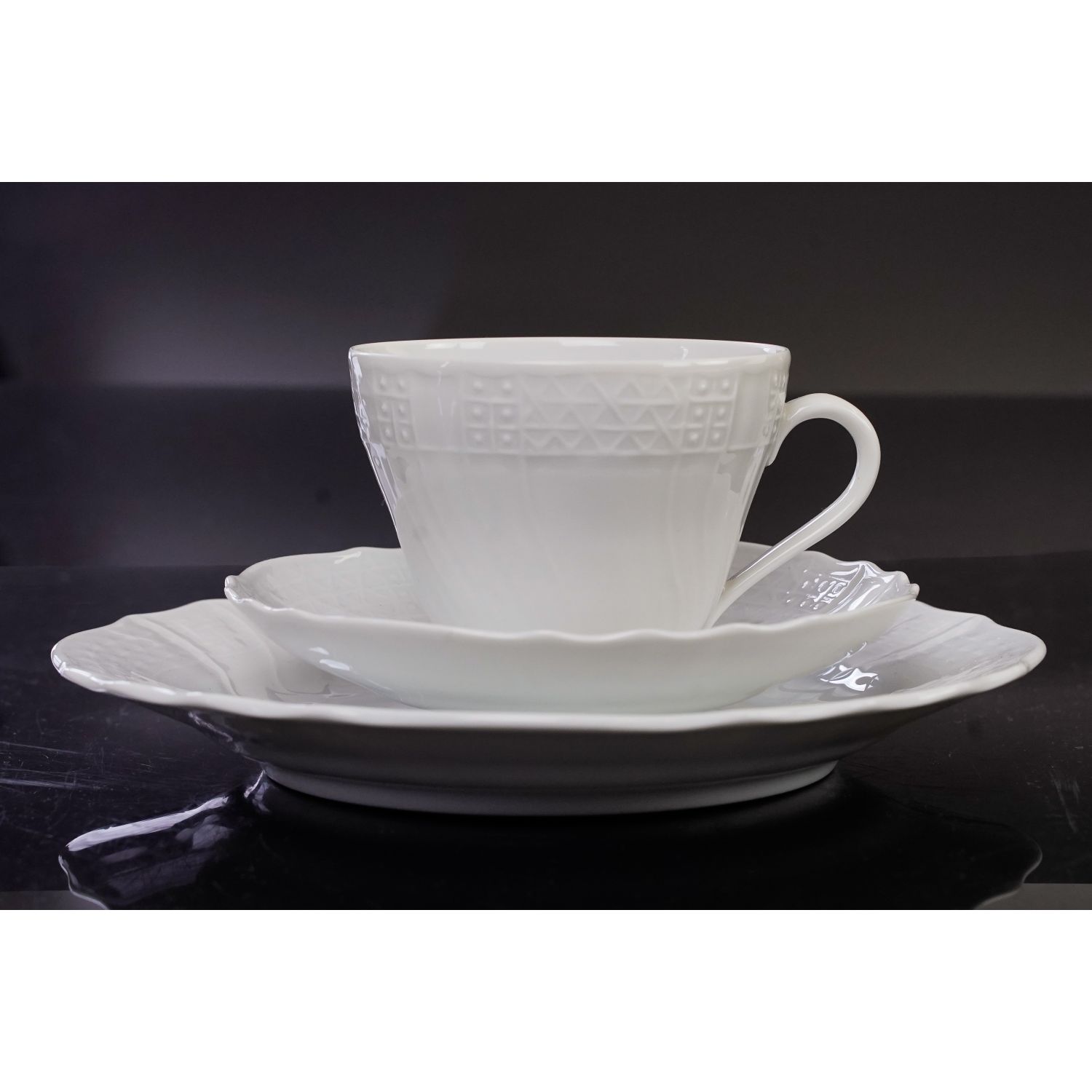 Przepiękny zestaw śniadaniowy z białej porcelany, składający się z filiżanki, spodka i talerzyka deserowego.