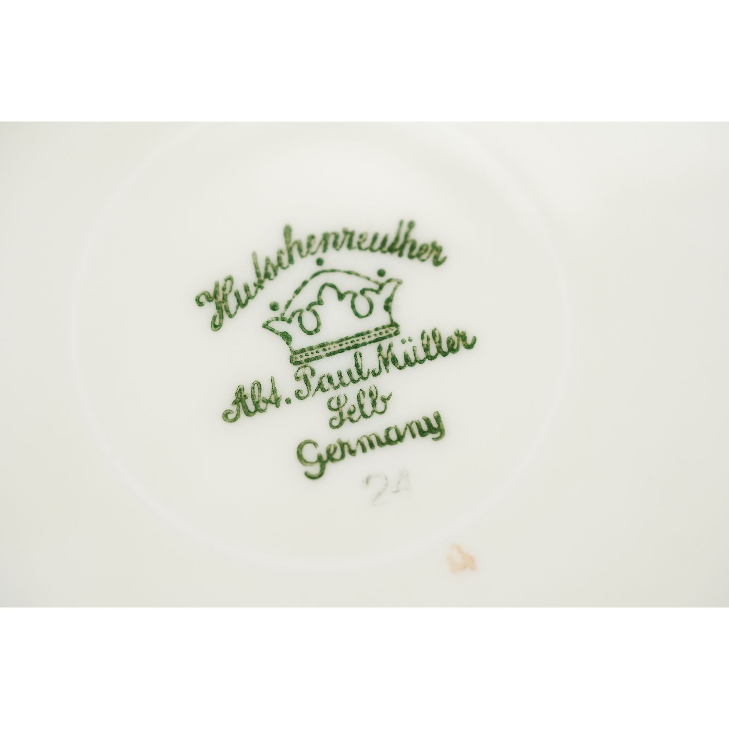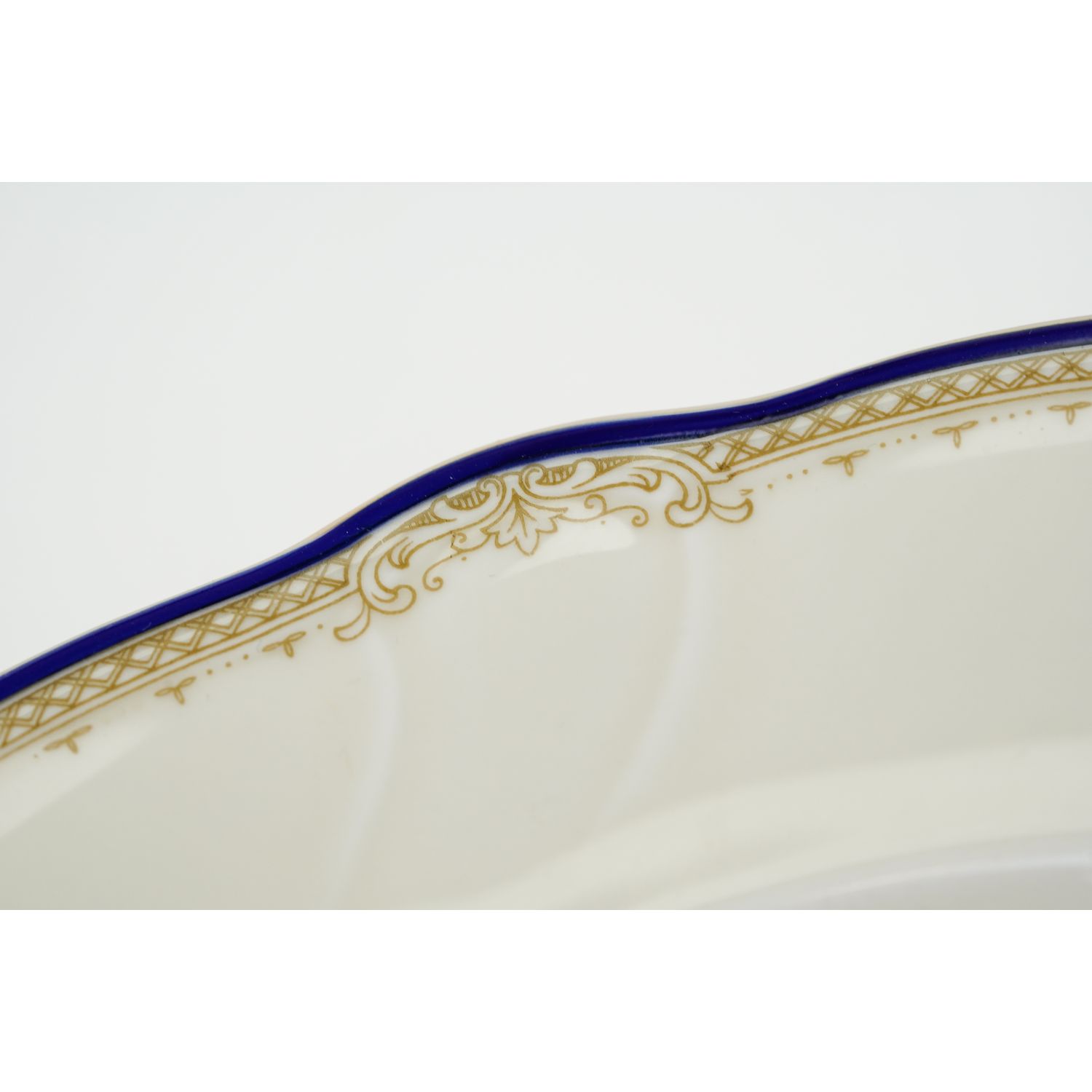 Pochodzi z Porzellanfabriken Lorenz Hutschernreuther AG z Selb (Bawaria). Fason Werdenfels. Sygnowany znakiem stosowanym w okresie 1928-1943. Piękna porcelana w kolorze kości słoniowej o klasycznym kształcie. Wszystkie talerze na krawędziach zdobione opalizowaną konturówką. Do tego szafirowo-musztardowy szlaczek przy krawędzi.