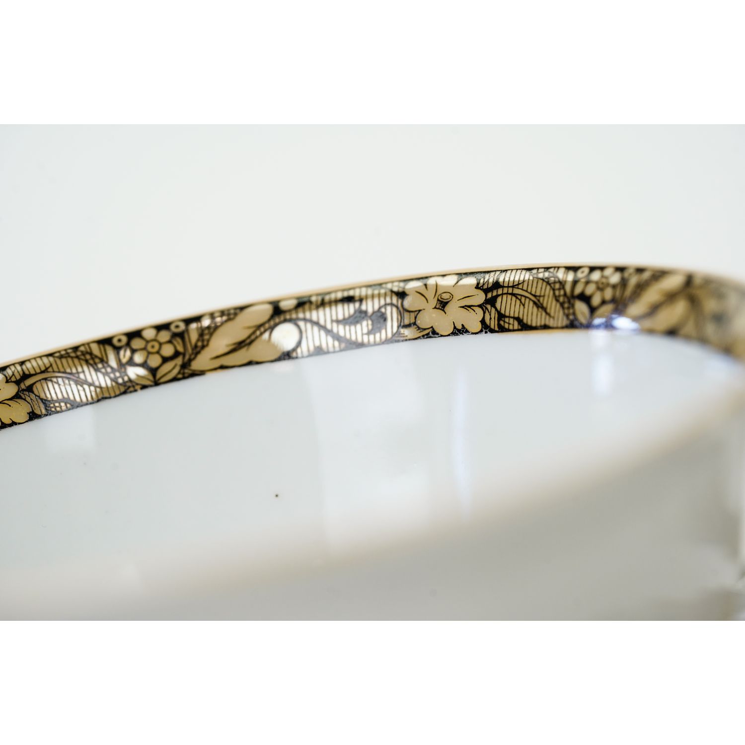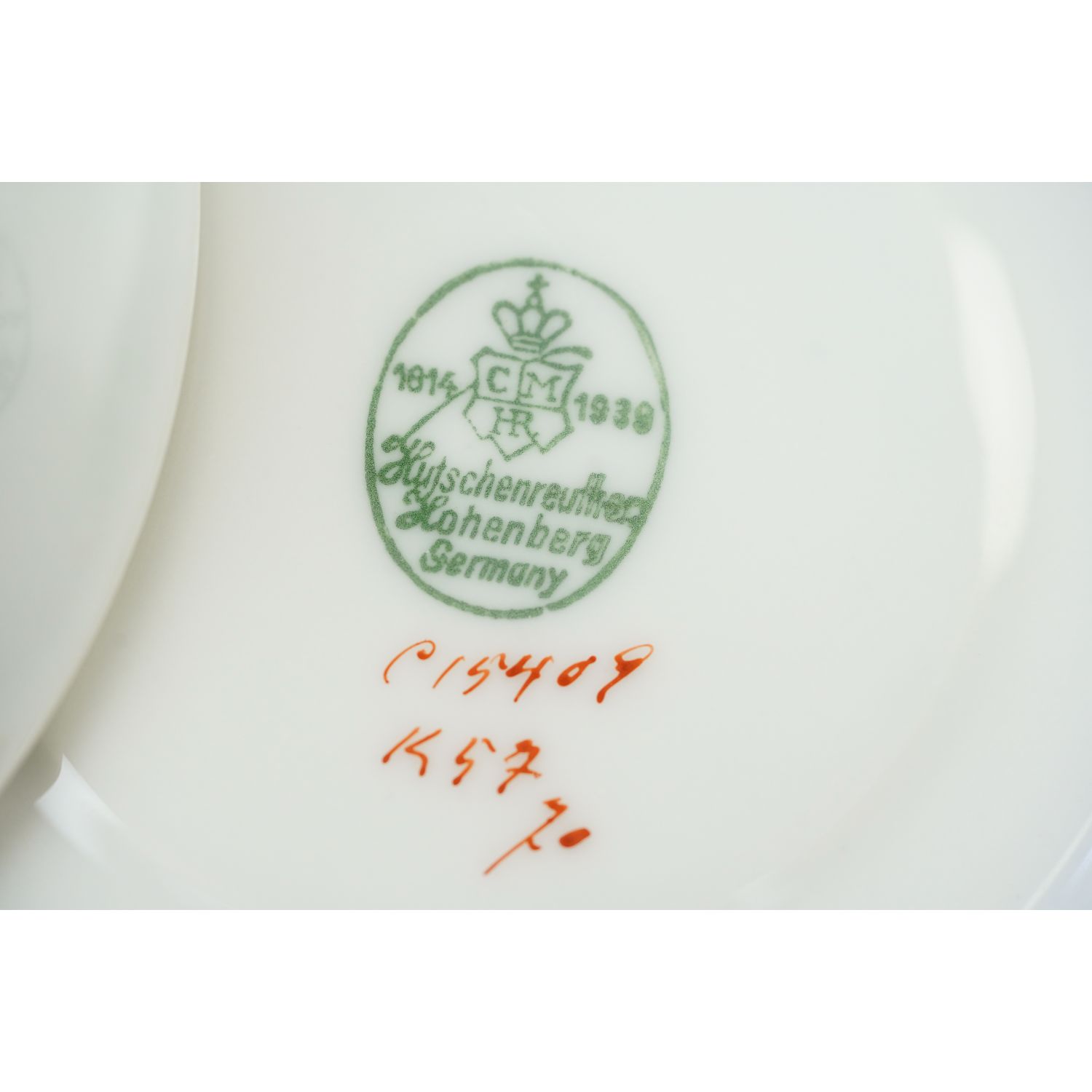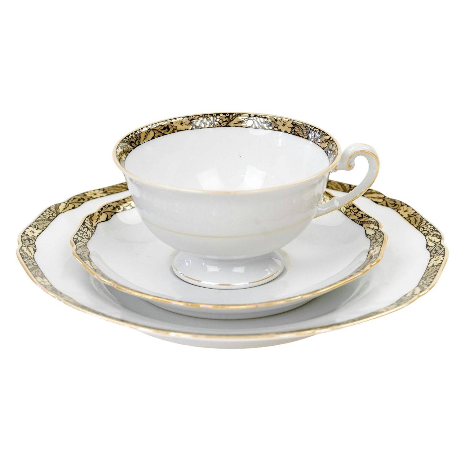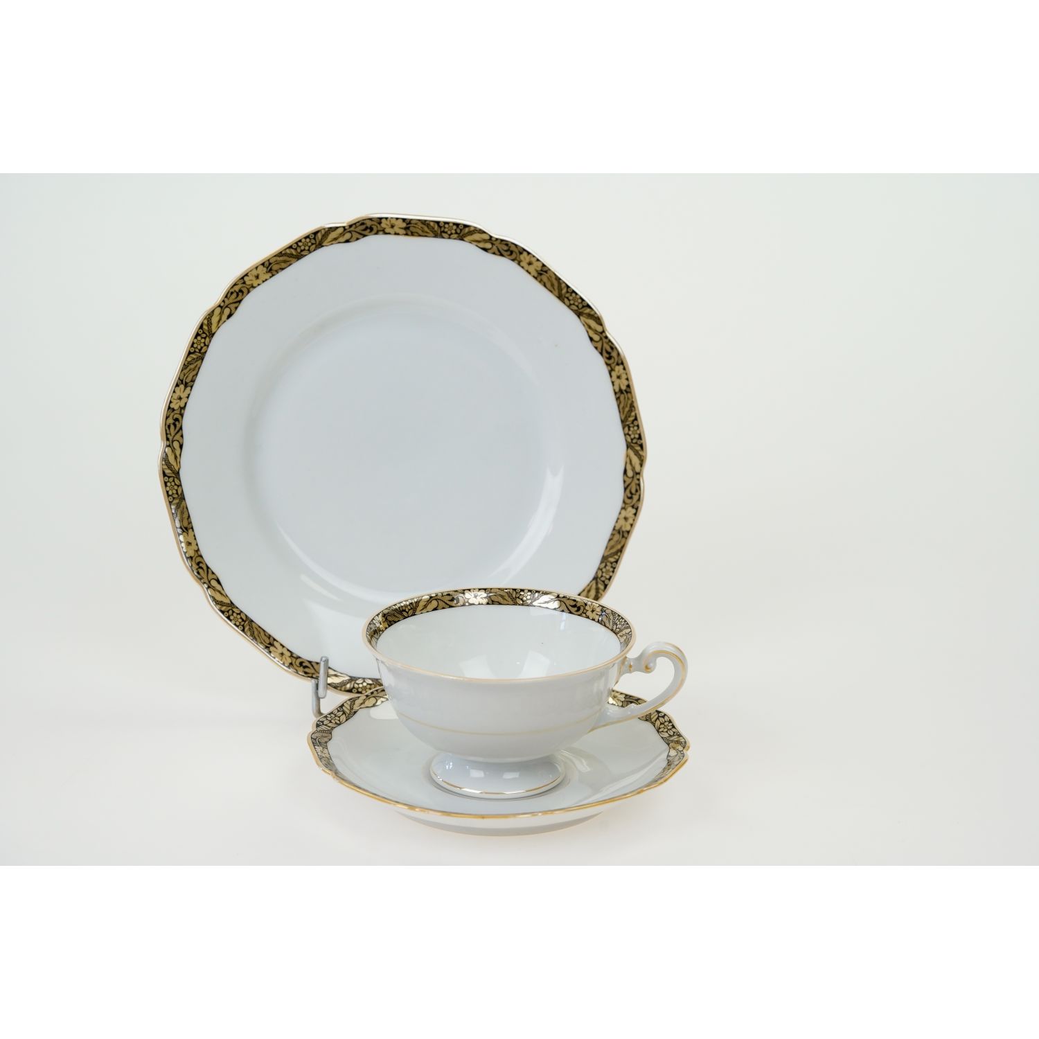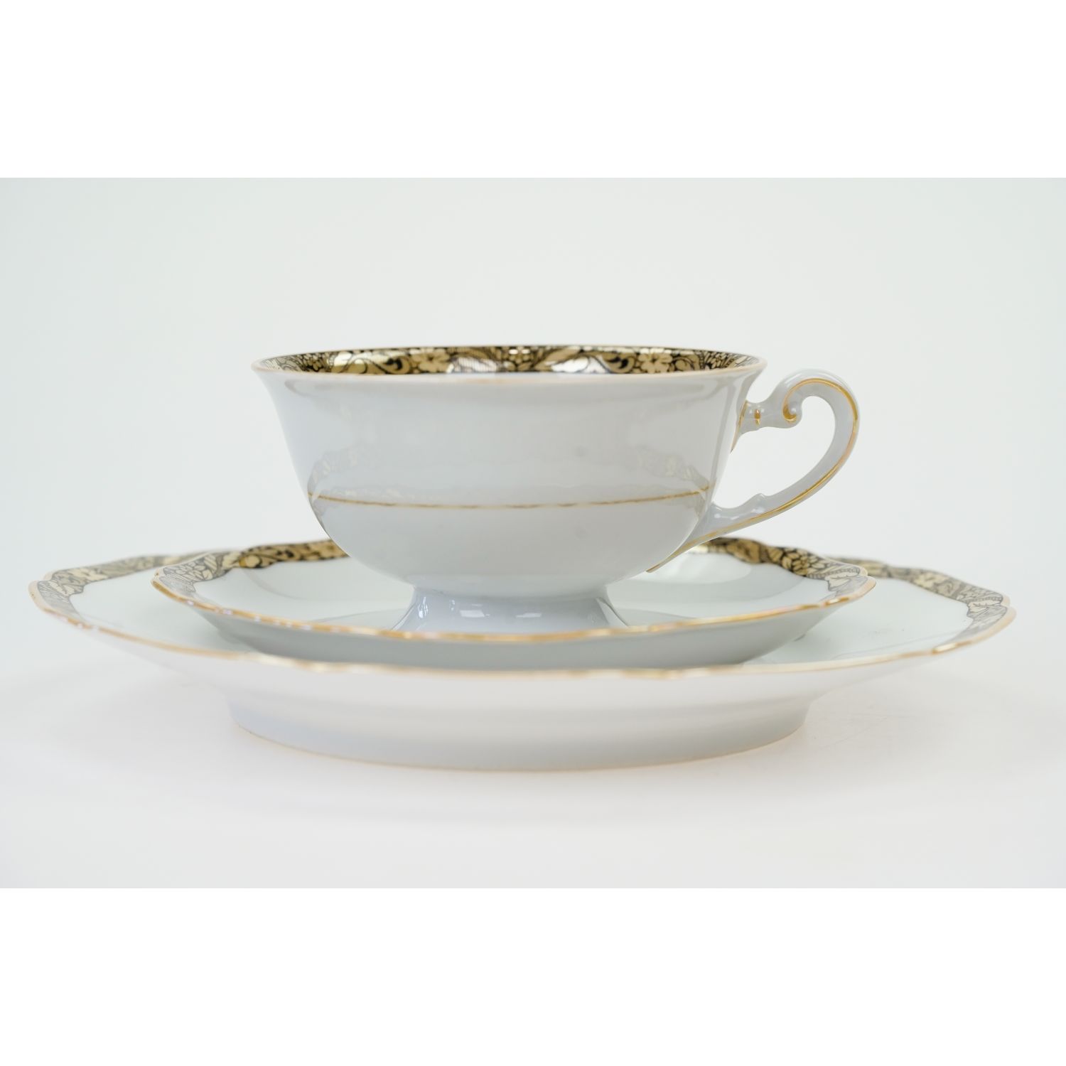 Pochodzi z Bawarii z Hutschenreuther (Carolus Magnus Hutschenreuther) z Hohenberg. Sygnowany znakiem stosowanym w latach 30-tych XX wieku. Śliczna, lśniąca porcelana w kolorze białym. Krawędzie wykończone z szerokimi szlaczkami z misternymi roślinnymi wzorami w kolorze złotym i czarnym. Dekoracja powtórzona wewnątrz filiżanki. Kontury też w delikatnym złoceniu i opalizie. Fikuśne uszko. Wyjątkowej urody przedmiot!