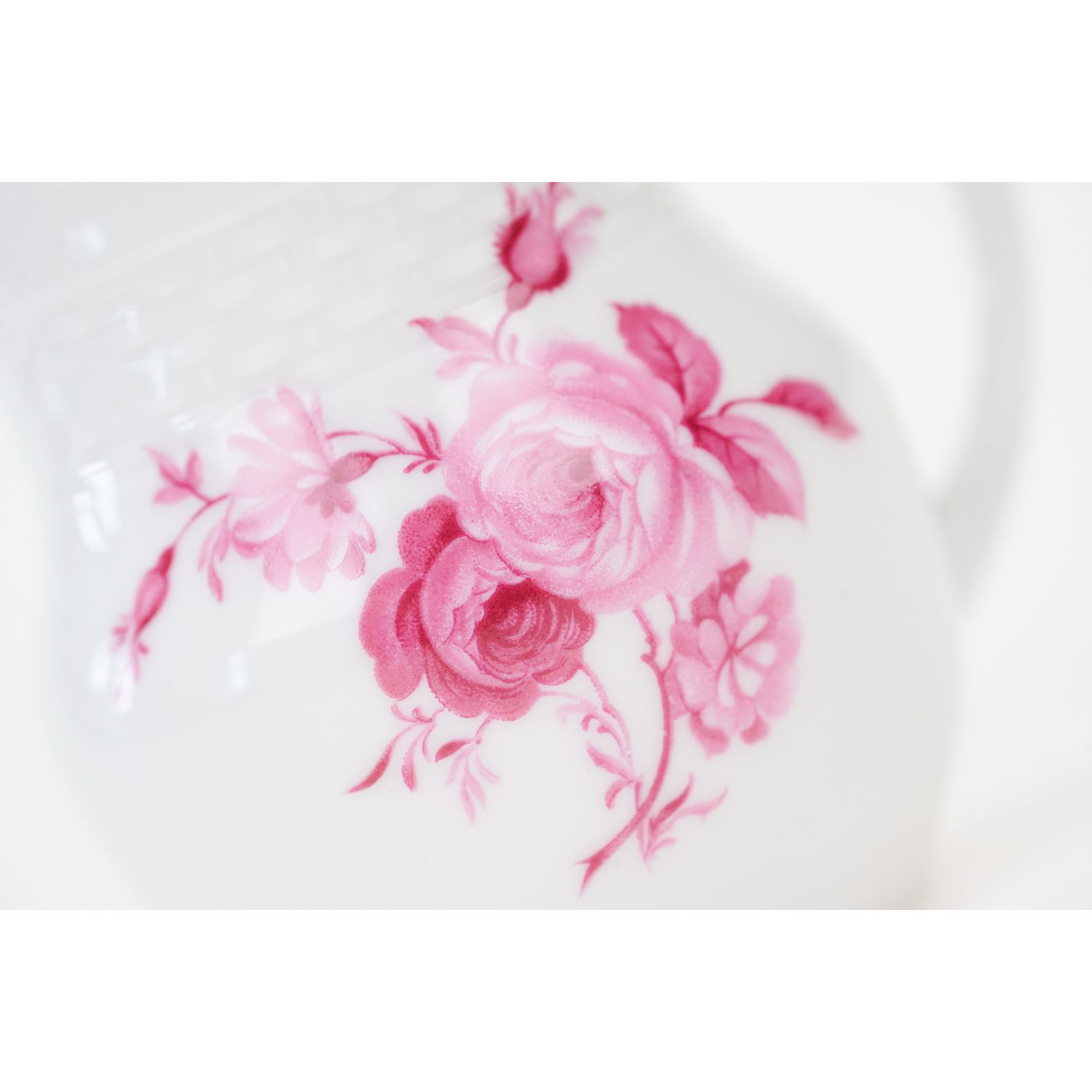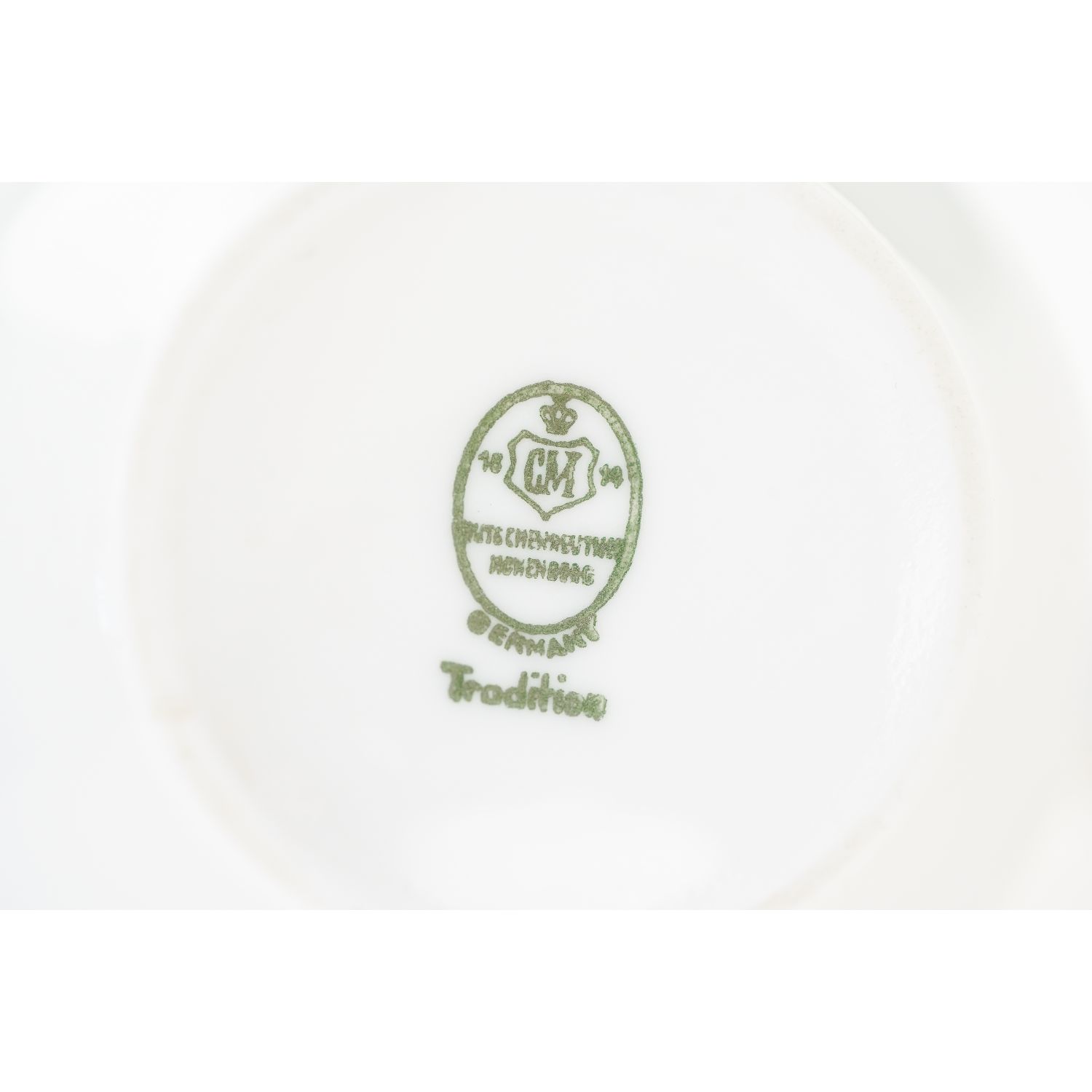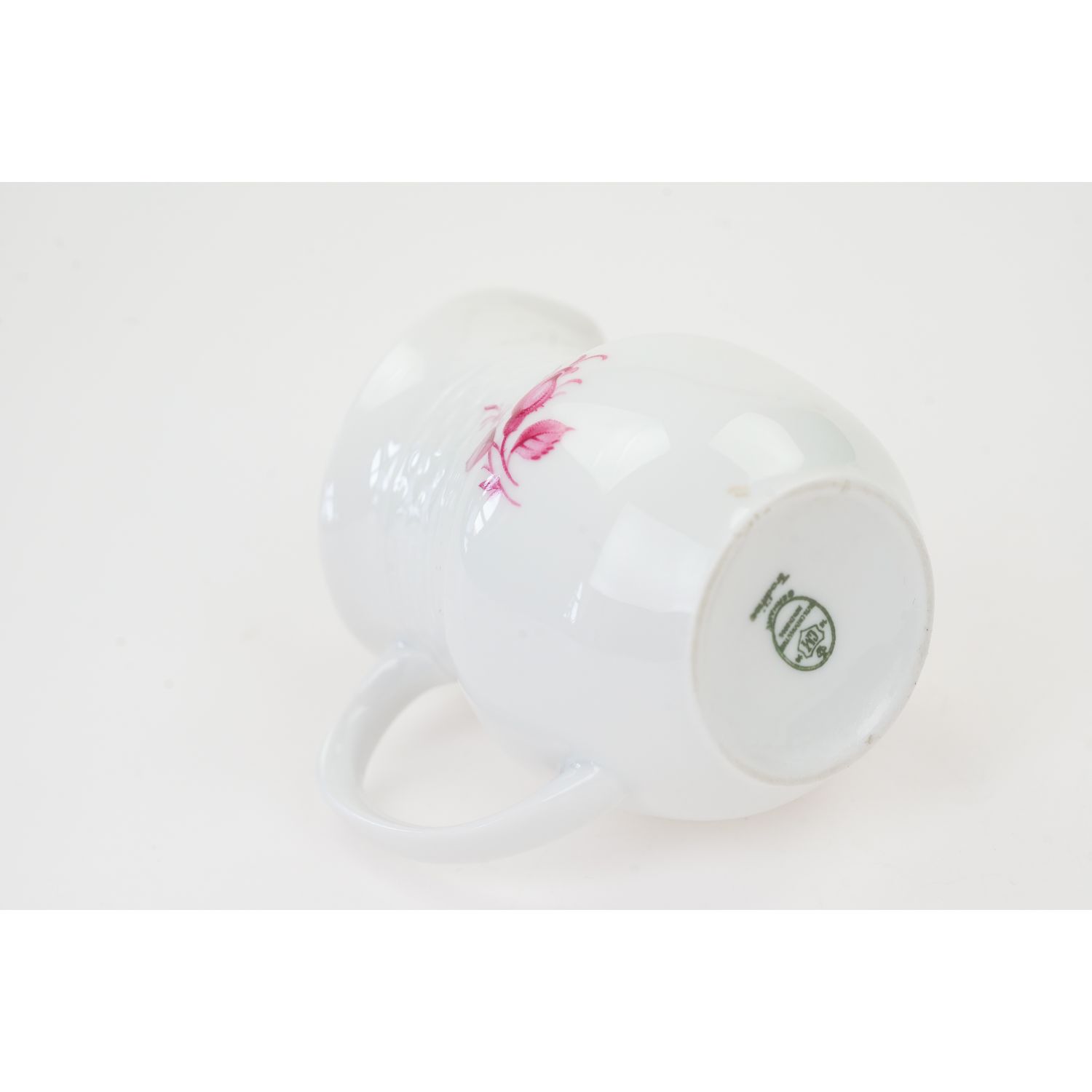 Pochodzi z Bawarii z Hohenberg Porzellanfabrik C. M. Hutschenreuther, której założycielem był Carolus Magnus Hutschenreuther. Sygnowana znakiem stosowanym od 1948 do 1970 roku. Model Tradition z przepięknymi, bogatymi reliefami imitującymi plecionkę wiklinowego koszyka. Porcelana w odcieniu bieli. Na korpusie kwiaty malinowych róż.