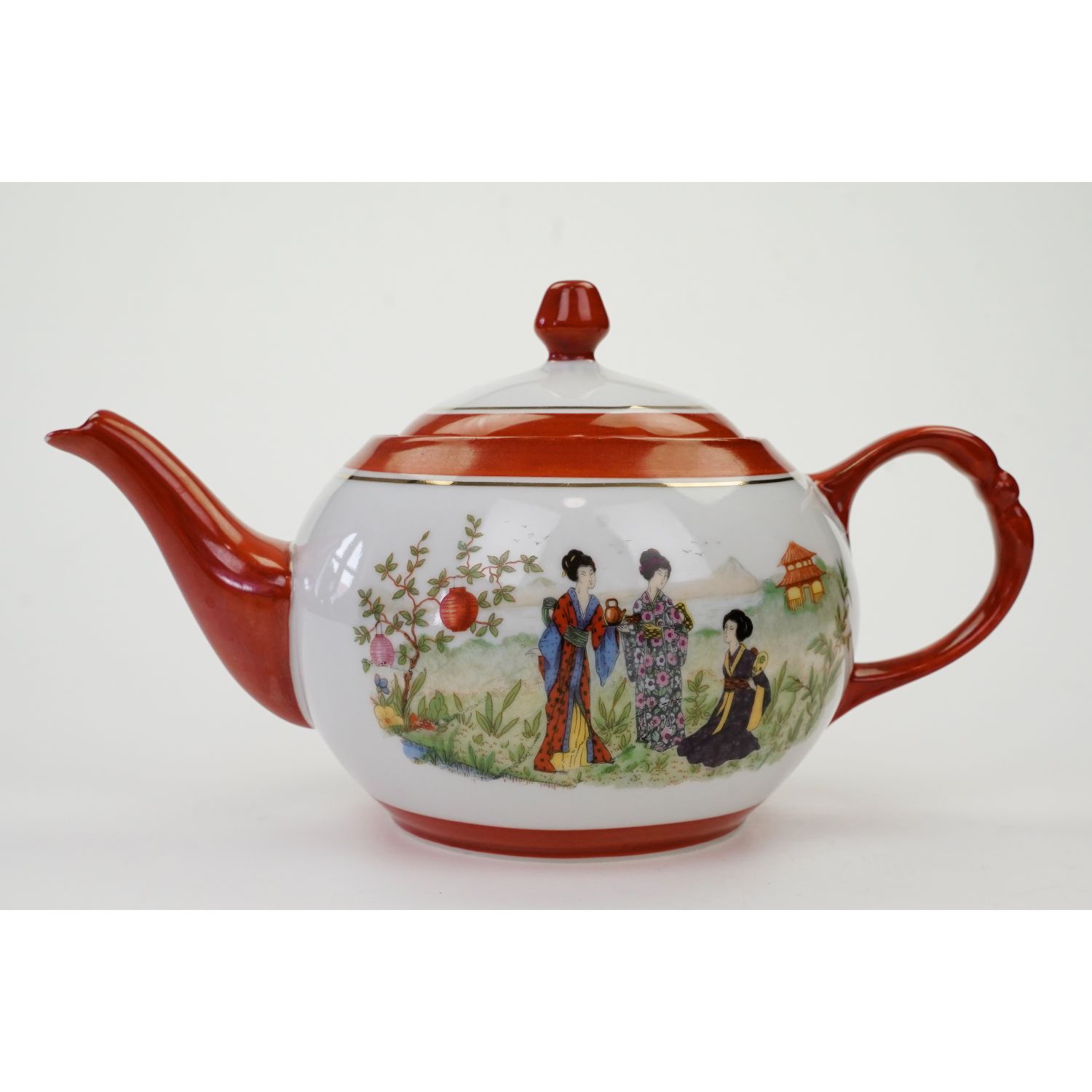 Z dekorem typu Japan Bunt z lat 20-tych XX wieku. Orientalne motywy oraz stylizowana na japoński stempel sygnatura miały upodabniać fason do azjatyckich oryginałów tudzież wstrzeliwać się w zapotrzebowanie powodowane ówcześnie powracającą modą na orientalizmy. Wykonana białej delikatnej porcelany. Na porcelanie trzy gejsze w oryginalnych kimonach i kokach na głowach. Dwie z nich stoją obok siebie i trzymają serwis z czajniczkiem do herbaty. Wśród nich bujna, orientalna roślinność, drzewo z kolorowymi lampionami, jeziorko, oraz w oddali drewniana pagoda. Brzegi w ceglastej malaturze ręcznie nakładanej.