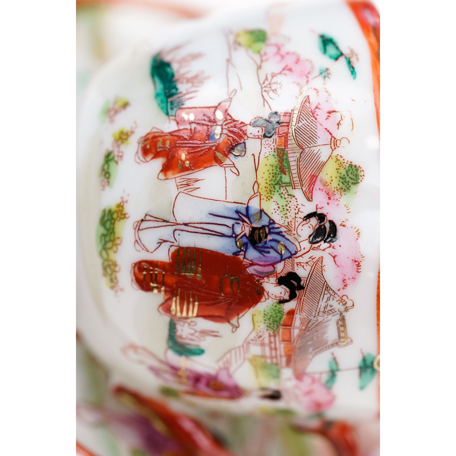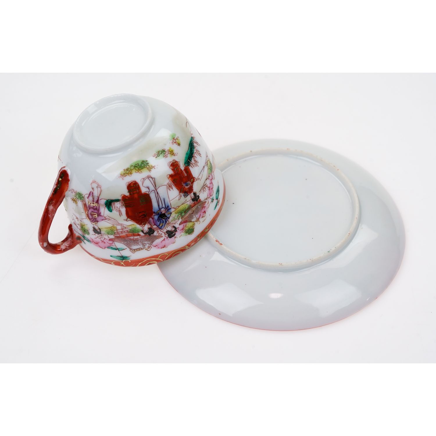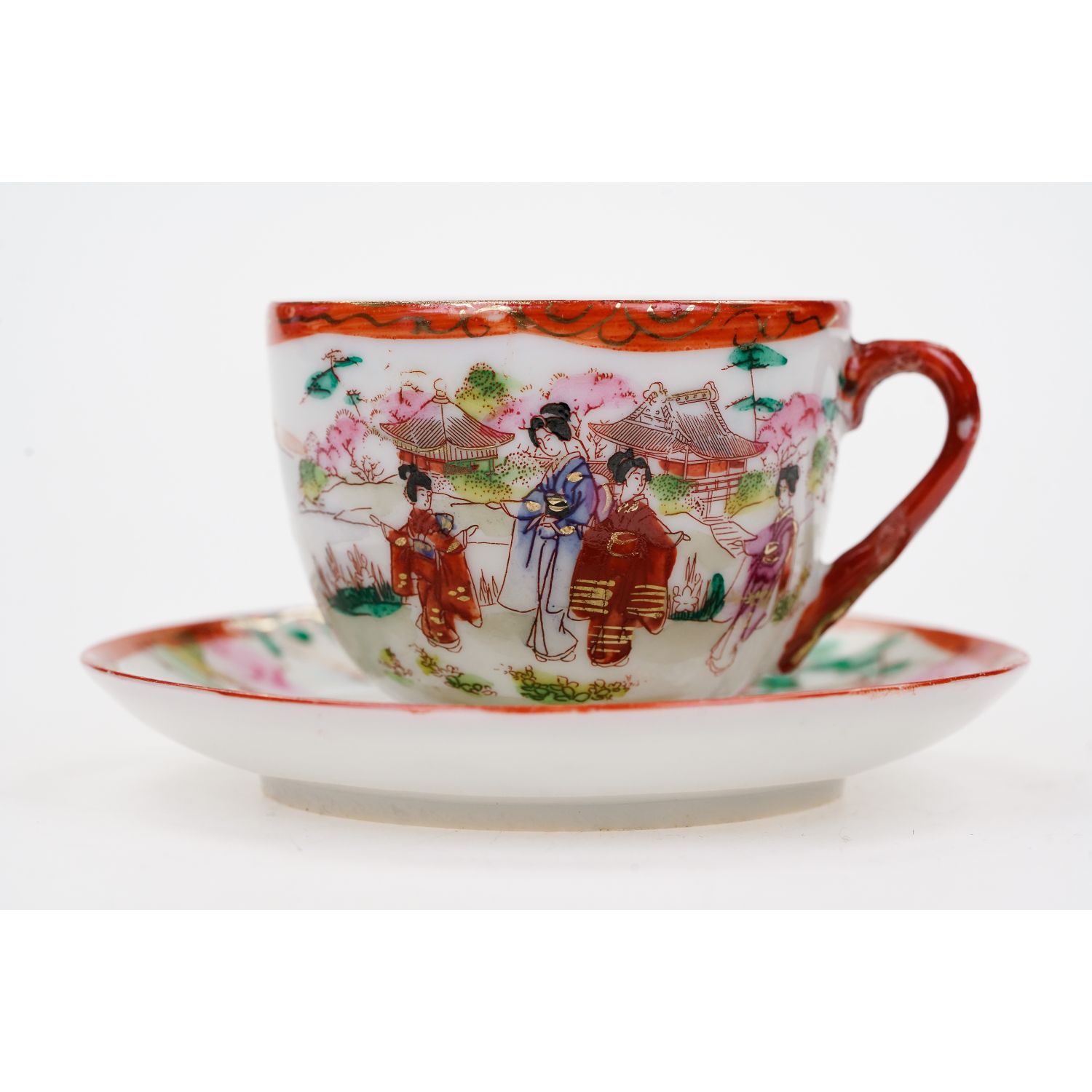 Nie posiada sygnatury. Japońska porcelanowa filiżanka i spodek wykonana z wyjątkowo delikatnej porcelany. Posiada interesującą, ręczną malaturę z japońskim pejzażem i gejszami wśród kwiecia. Kontury i uszko koralowe ze złotymi ornamentami.
