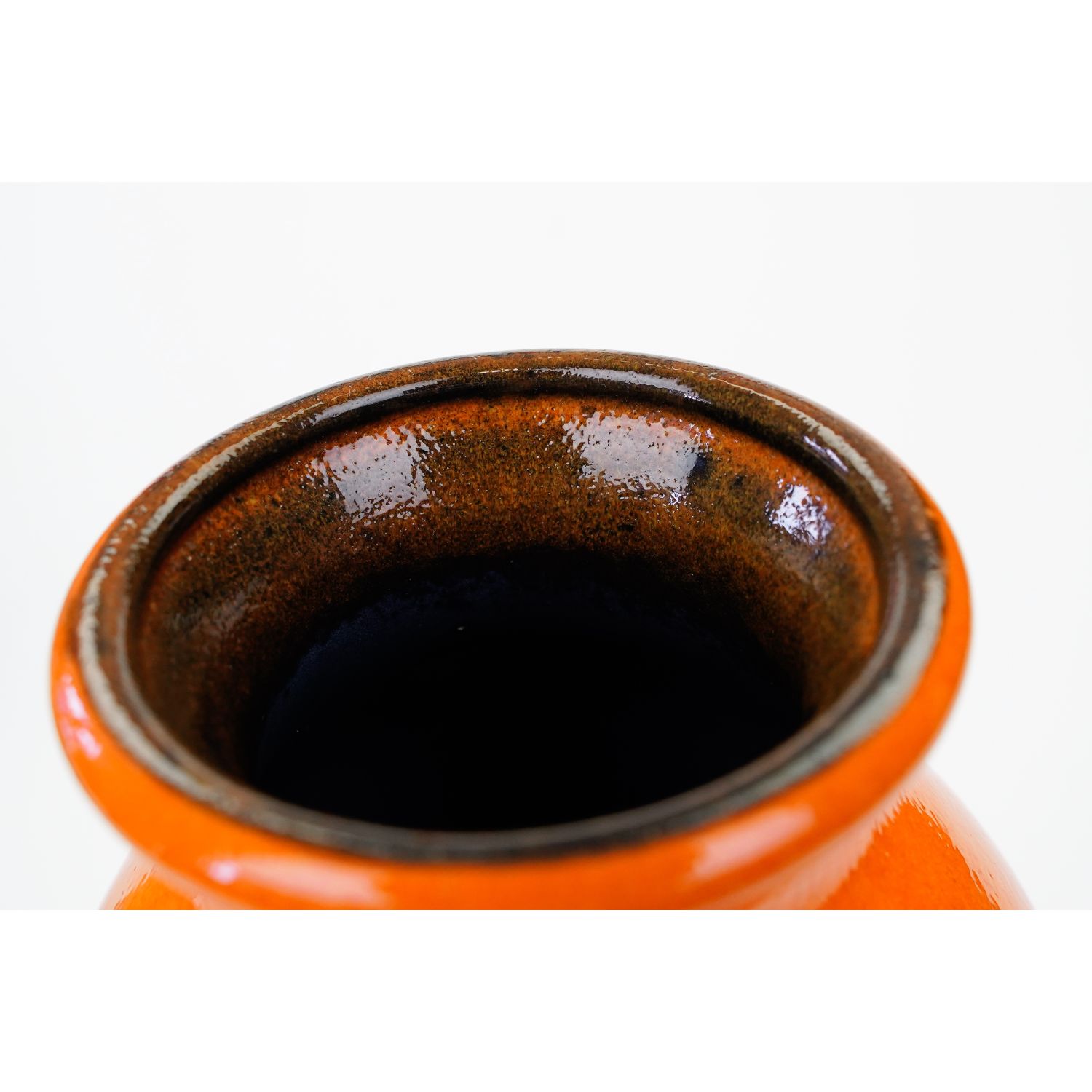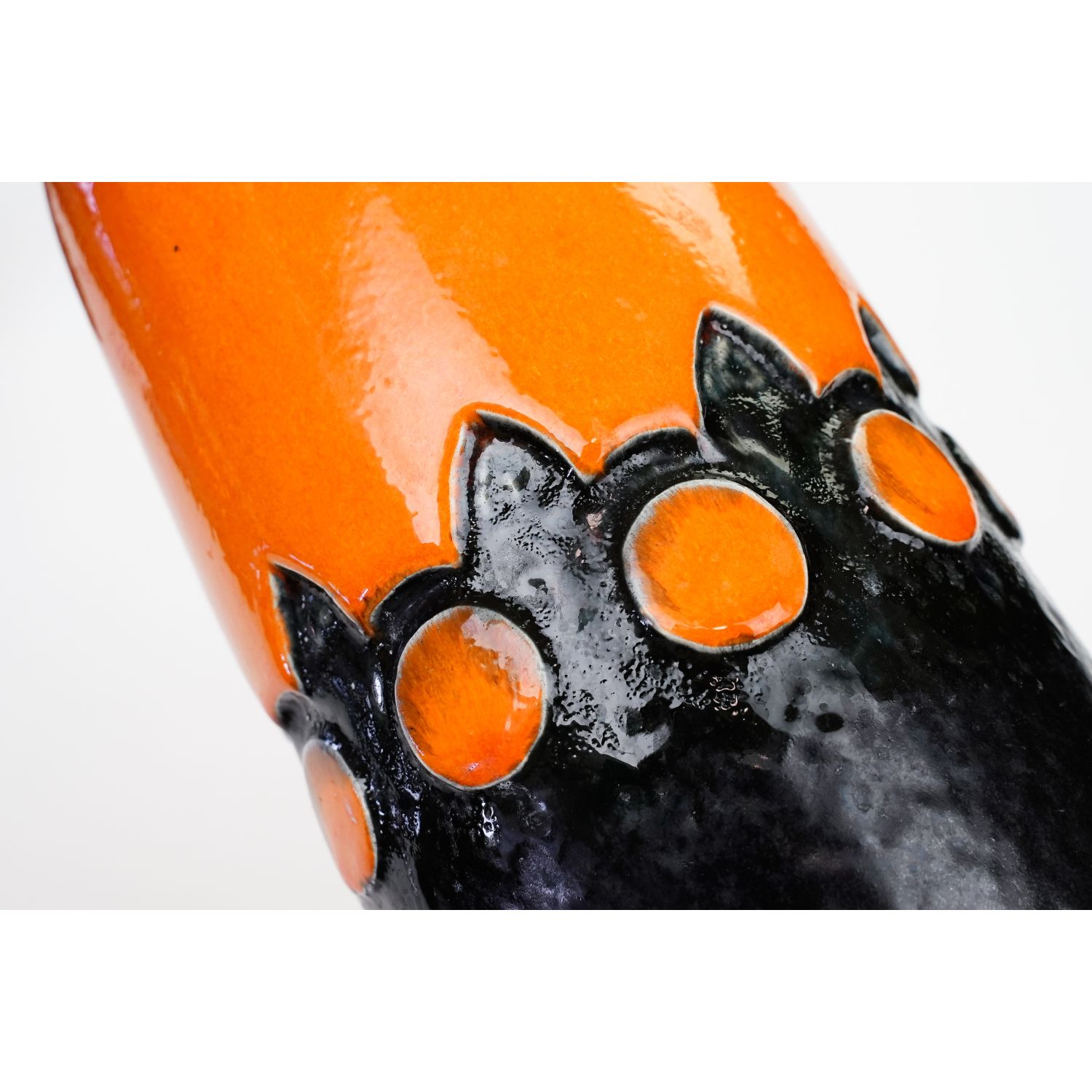 Pochodzi z Niemiec z Jasba Keramik Ransbach-Baumbauch. Sygnowany jak na zdjęciu i numerowany. Wykonany z ceramiki, w górnej części szkliwiony w pomarańczowej polewie z reliefowanym, geometrycznym wzorkiem. Dolna część czarna. Ręcznie wykonany. Forma raczej tradycyjna.