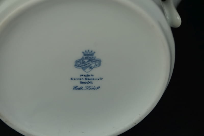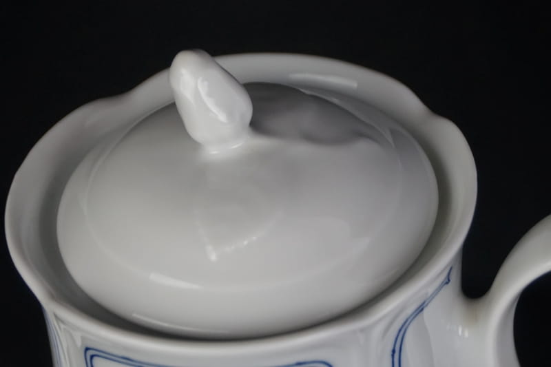 Pochodzi z Turyngii z Jlmenau z Graf von Henneberg Porzellan GmbH. z dopiskiem Echt Kobalt. Porcelana biała, dekorowana wdzięcznym motywem winogron w kobalcie. Reliefy podkreślone taką samą, podwójną konturówką. Pokrywka ma sterczynkę w kształcie różanego pąku.