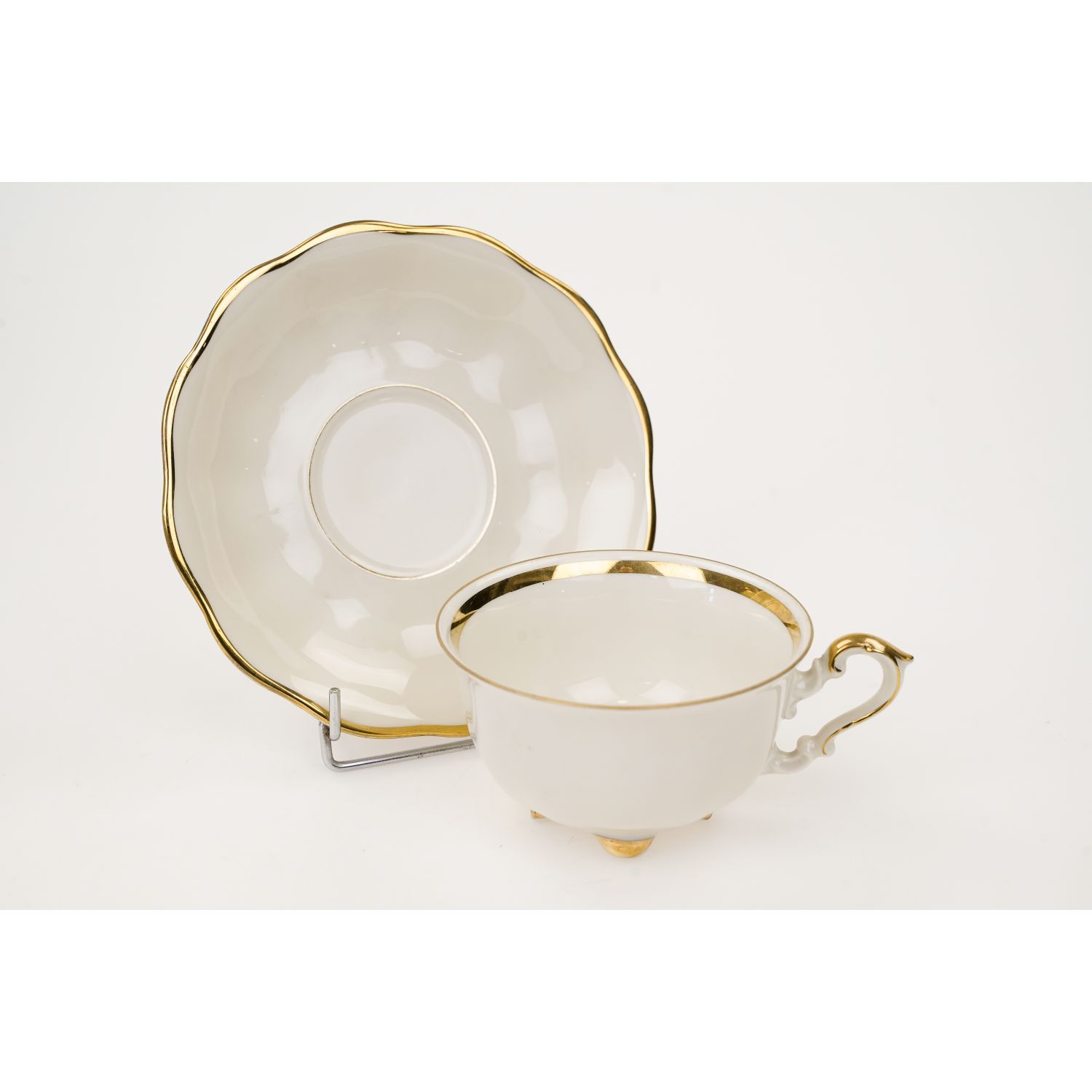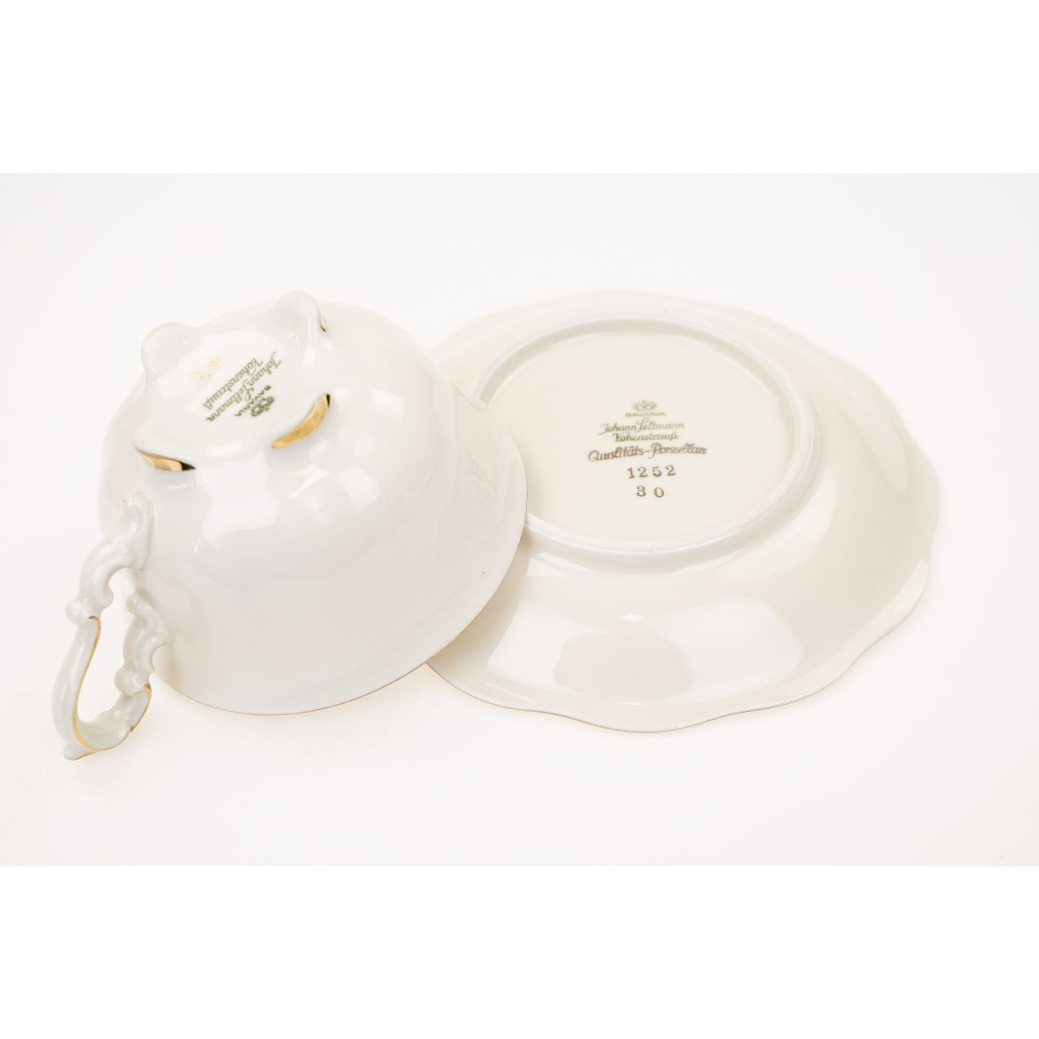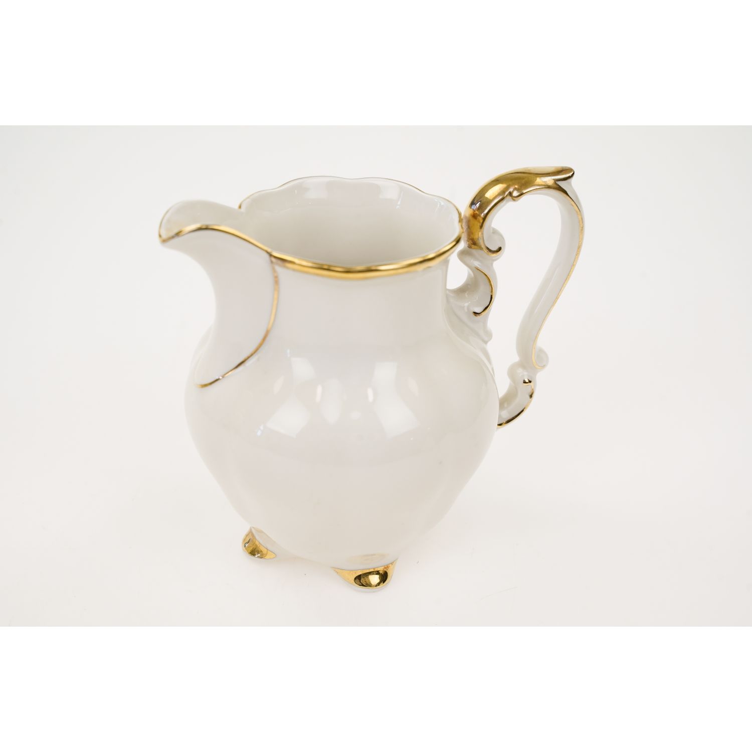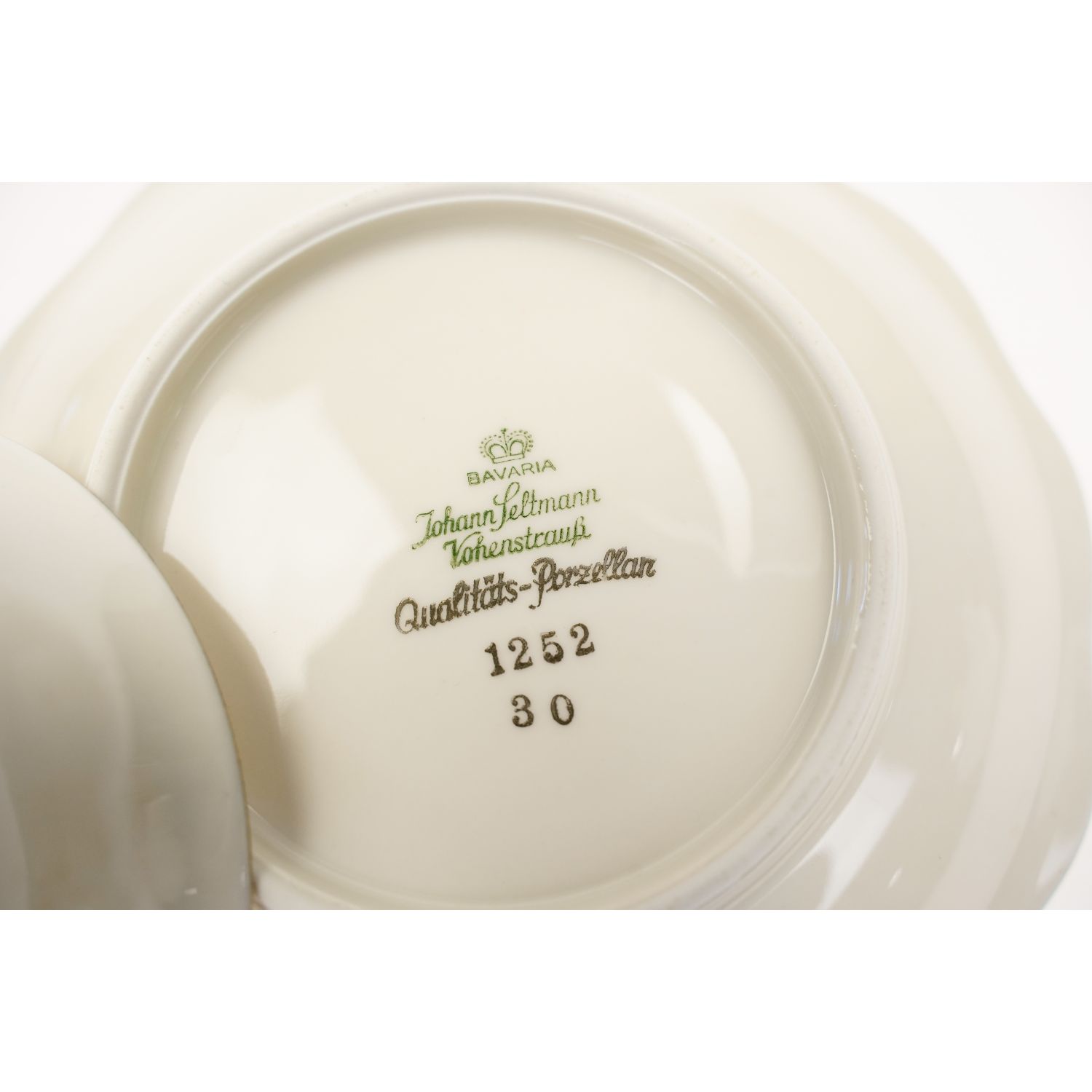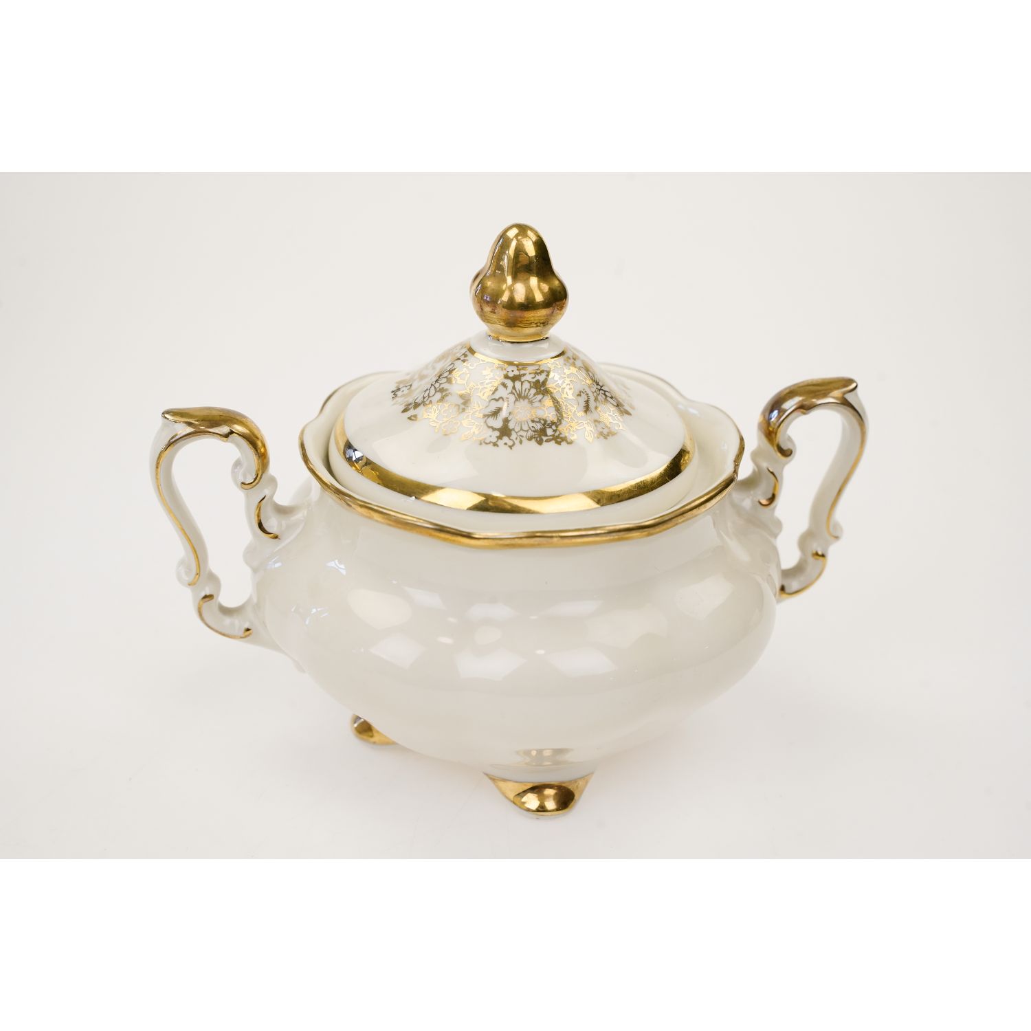 Pochodzi z Vohenstrauß z Porzellanfbrik Johann Seltmann. Sygnowana znakiem stosowanym po 1945 roku. Z dopiskiem Qualitäts Porzellan Piękna porcelana w kolorze kości słoniowej, o klasycznej formie ze złotymi wykończeniami i złotymi ornamentami na pokrywach. Kontury obwiedzione złoceniem, do tego w pełni złocone sterczynki.