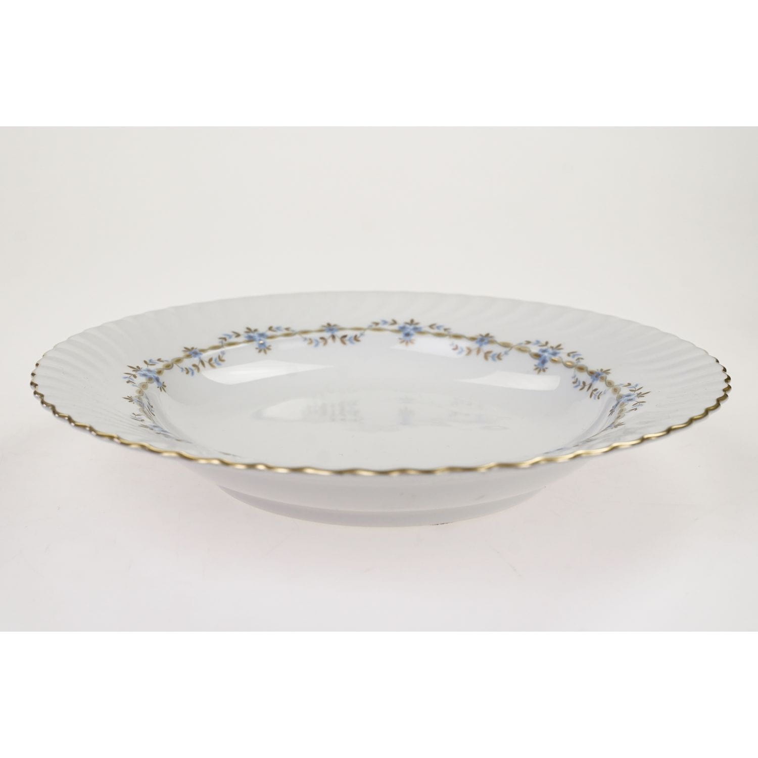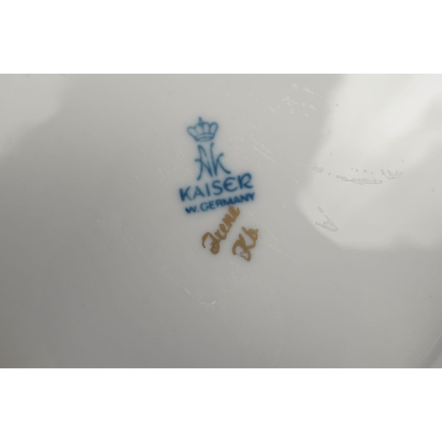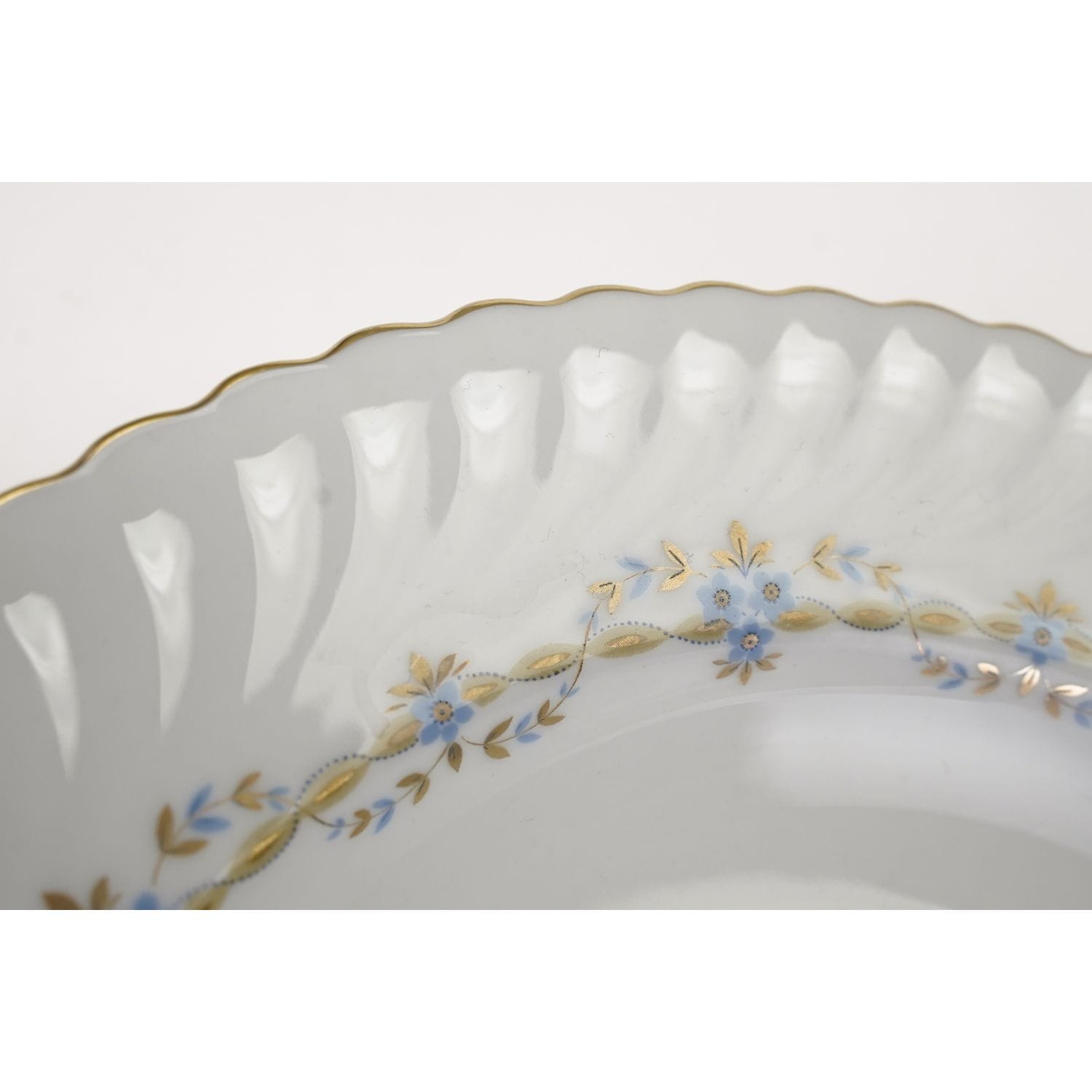 Pochodzi z Bawarii z Staffelstein z wytwórni Kaiser-Porzellanmanufaktur Staffelstein. Model Marie Antoinette, dekoracja Irene. Z odręcznym znakiem dekoratora. Porcelana biała, kanelowana na kołnierzyku. Dekorowana szlaczkiem delikatnych, błękitnych kwiatuszków. Ranty złocone.