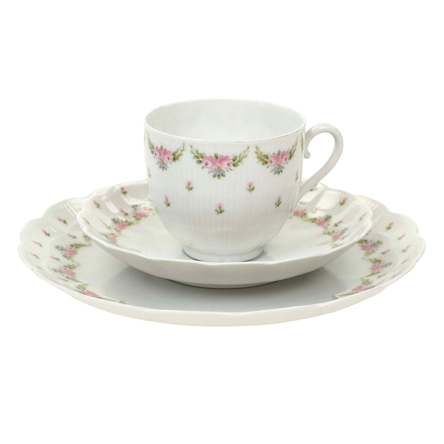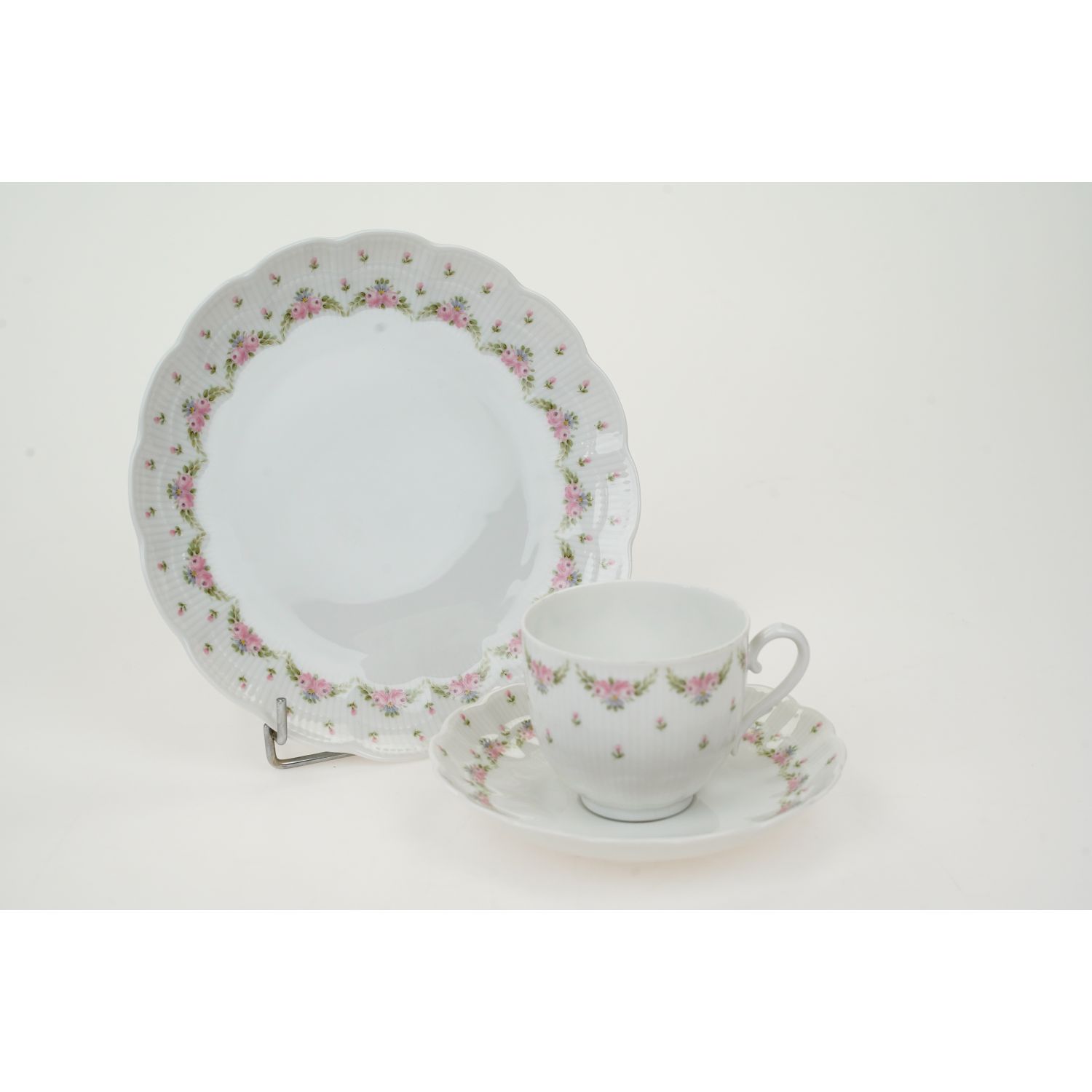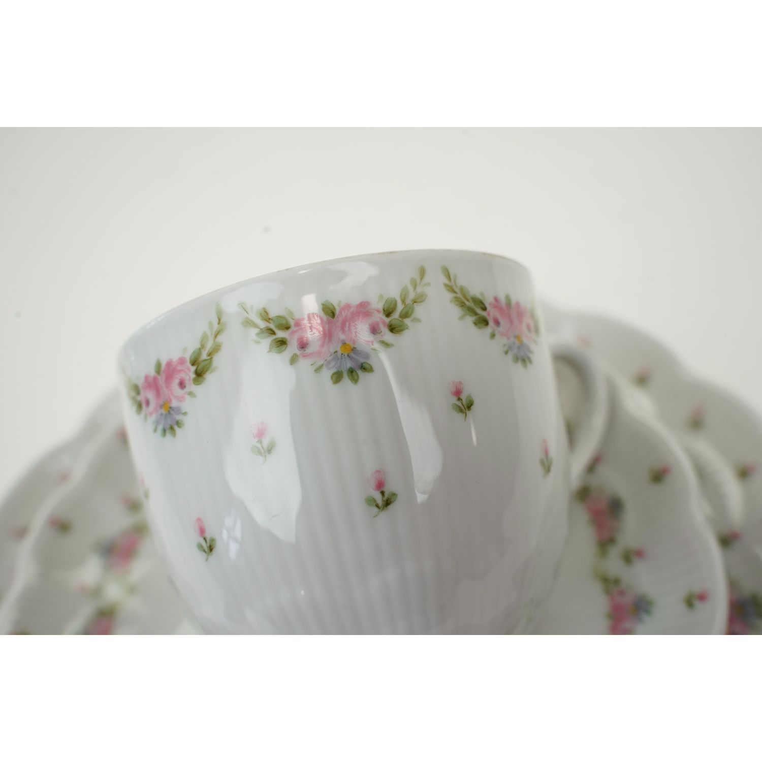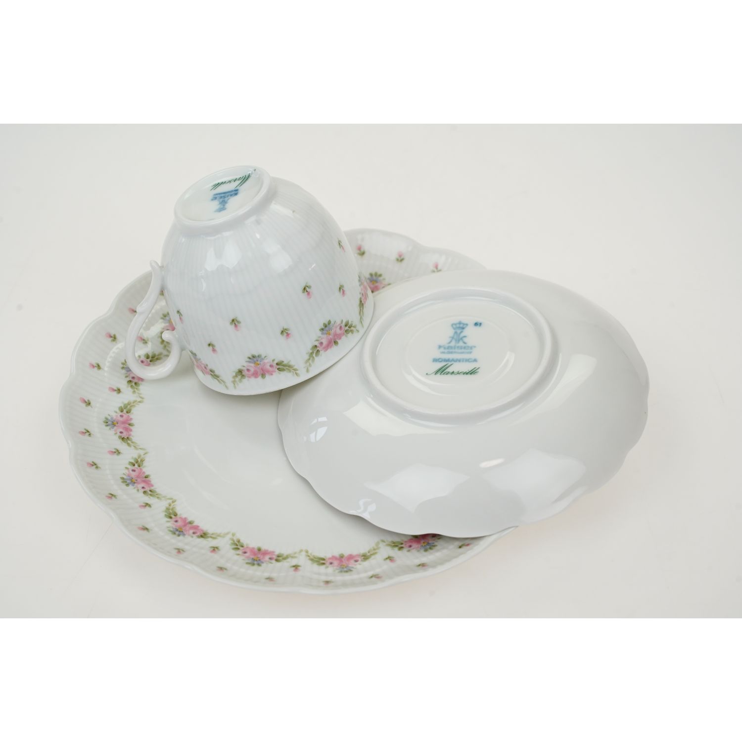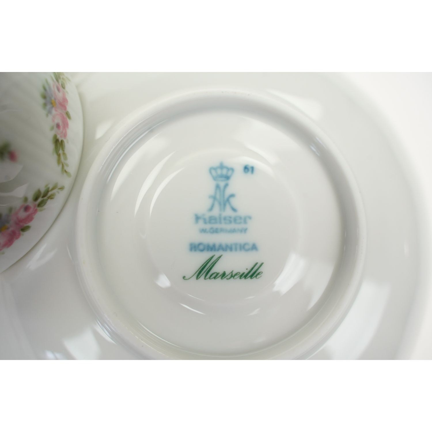 Sygnowana przez wytwórnię porcelany Kaiser-Porzellanmanufaktur Staffelstein KG. Model Romantica, dekoracja Marseille. Porcelana biała. Dekorowana drobniusieńkim kanelowaniem na wszystkich elementach. Pięknie uformowane uszko. Porcelanę zdobią girlandy różyczek.