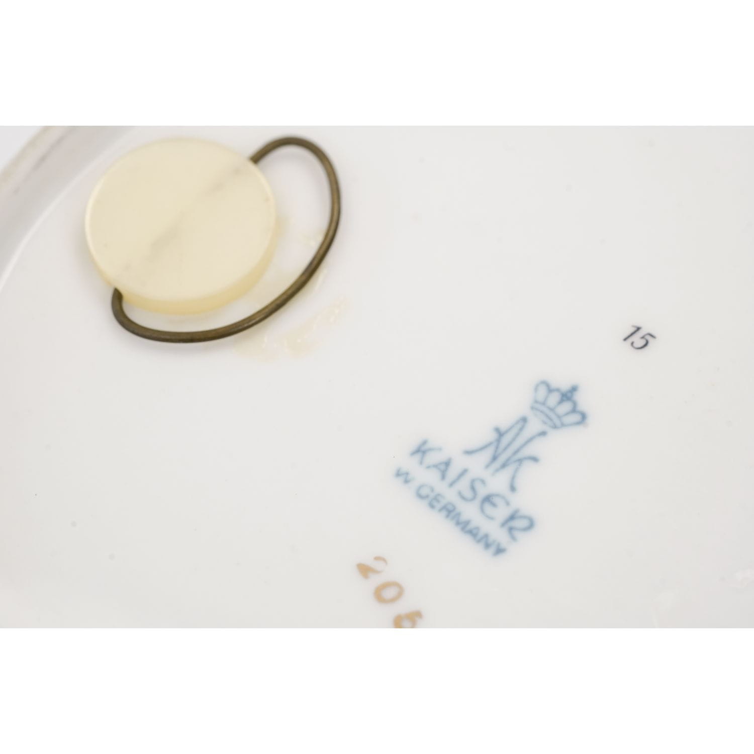 Pochodzi z wytwórni porcelany z Staffelstein (Kaiser-Porzellanmanufaktur Staffelstein KG), Z wytłoczonym w porcelanowej masie cyframi 206. Lata 70-te XX wieku. Jest wykonana z najwyższej jakości, ekskluzywnej, grubo szkliwionej, lśniącej porcelany w kolorze białym. Na lustrze medalion z ptakami. Kołnierz w zielonym kolorze ze złoceniem na krawędzi. Przystosowany do zawieszenia na ścianie.