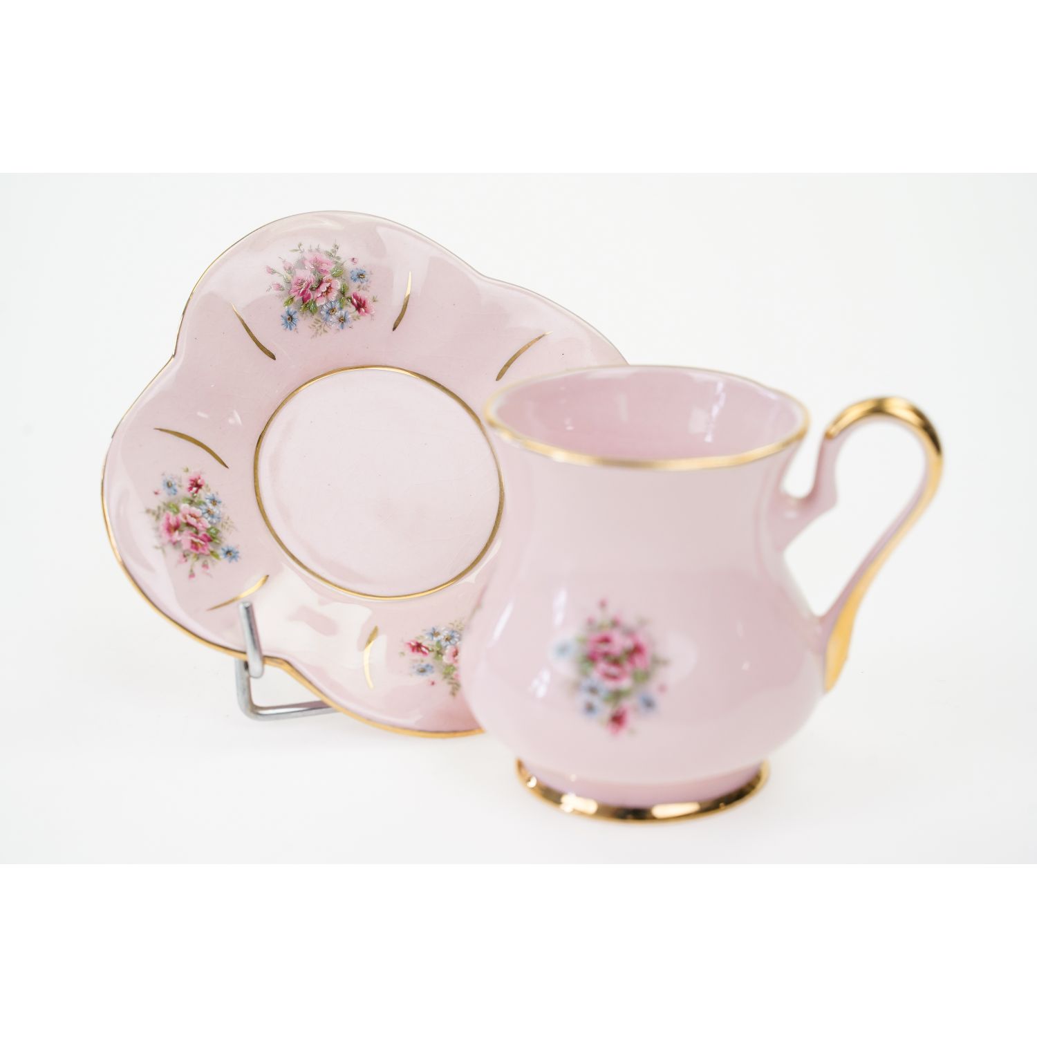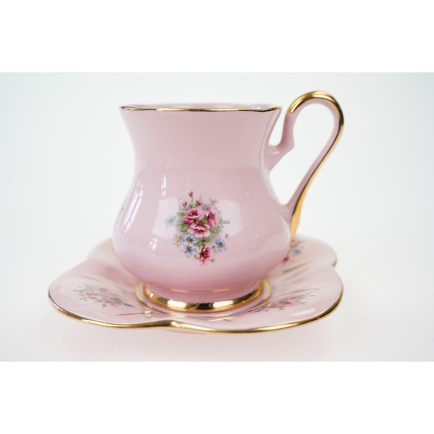 Piękna, elegancka, różowa filiżanka ze spodkiem.