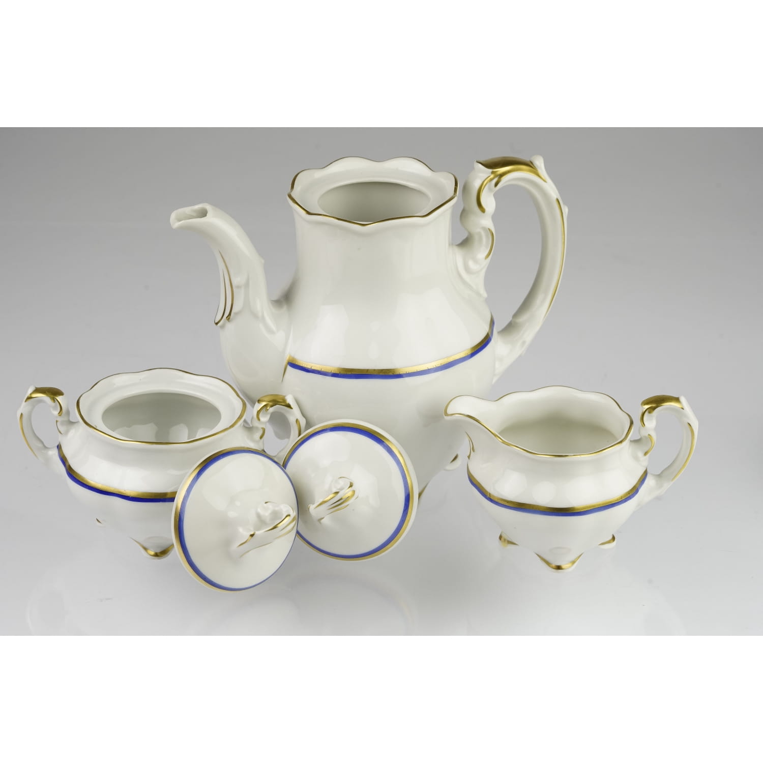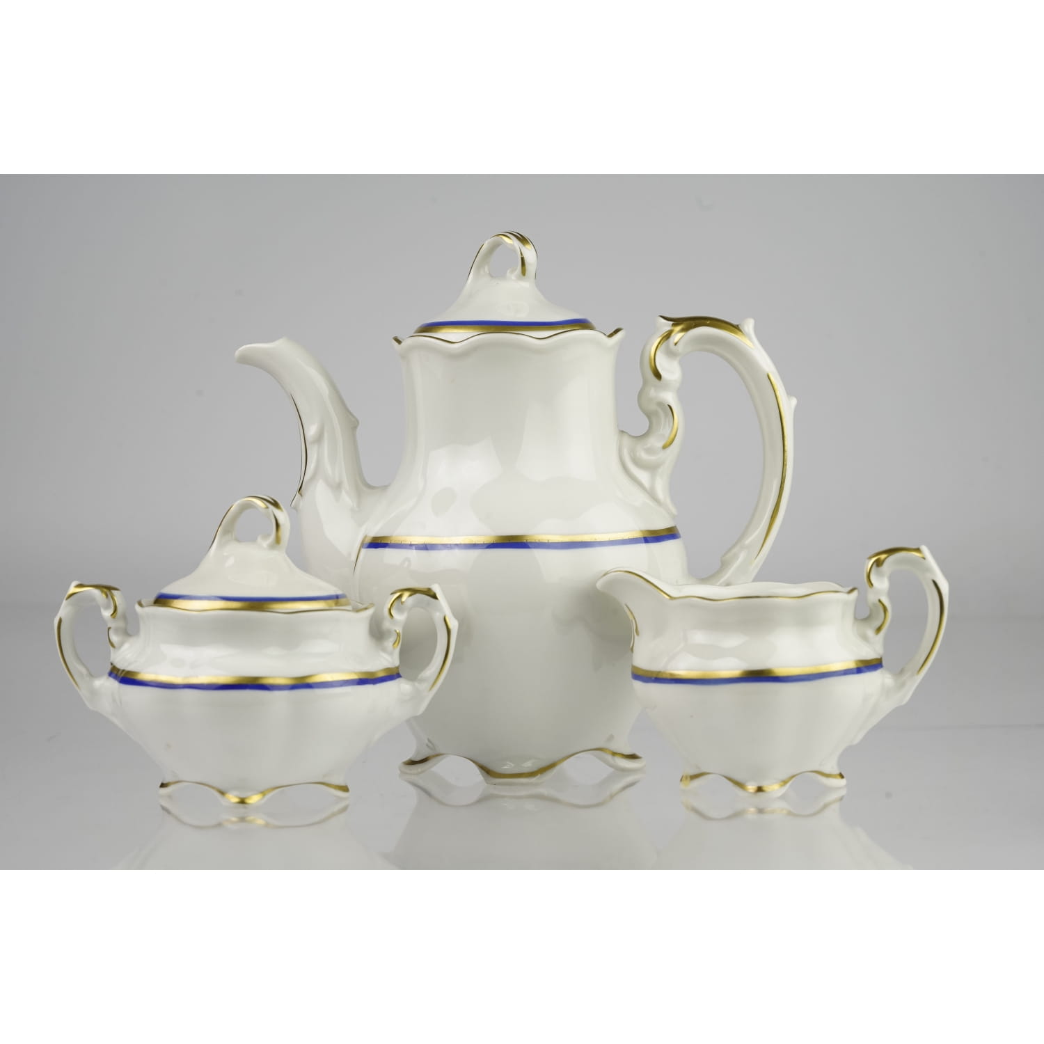 Pochodzi z wytwórni porcelany Zakłady Porcelany Stołowej, P.P. Sygnowany znakiem stosowany od 1957. Wygląda identycznie jak ćmielowski model Charlotte /projekt przedwojenny/. Wszystkie elementy osadzone na czterech nóżkach. Dekorowane szafirowo-złotą opaską na brzuścach oraz pokrywach i złotymi konturówkami. Porcelana w kolorze złamanej bieli.