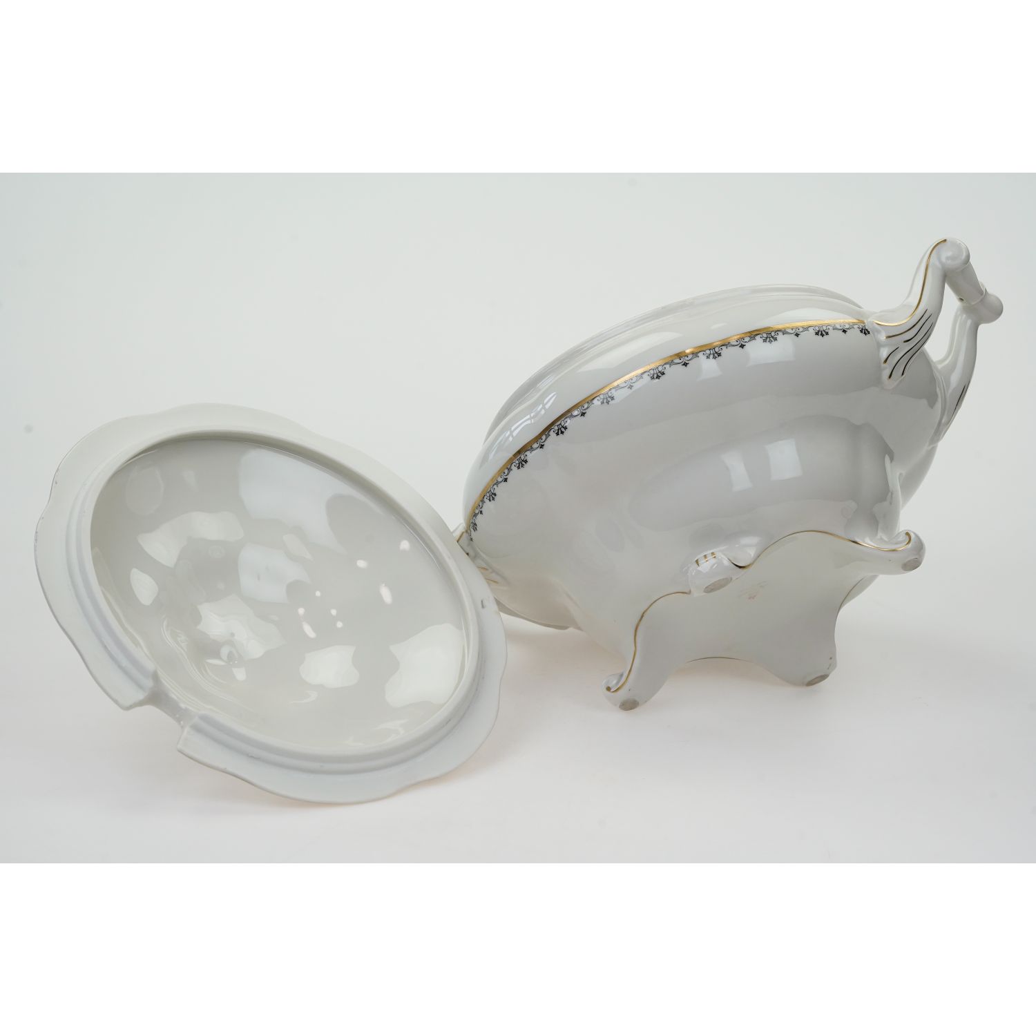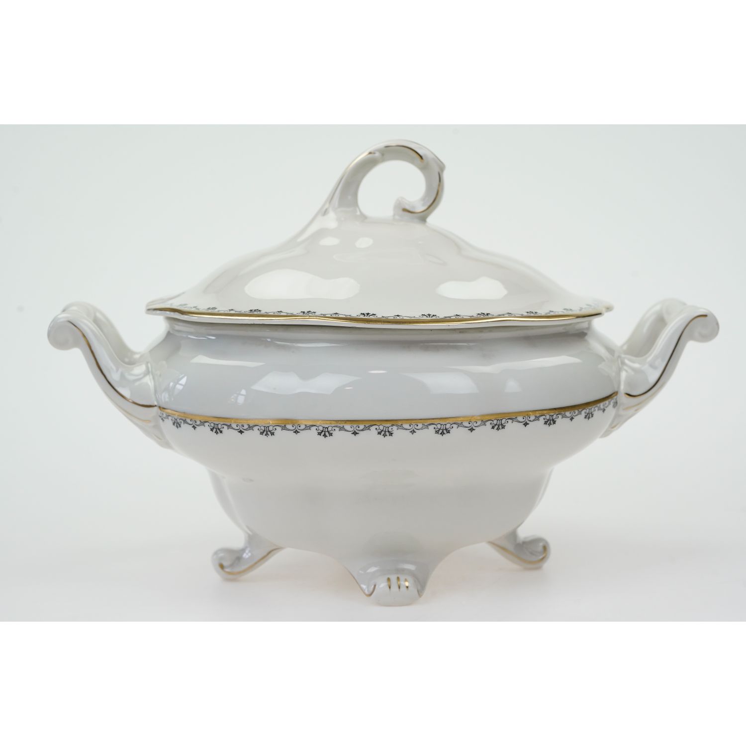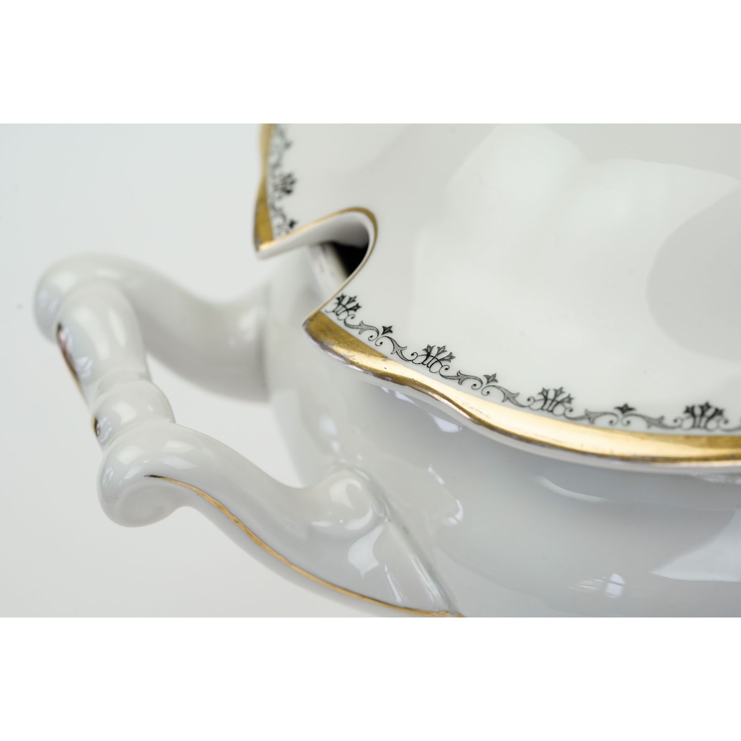 Pochodzi z wytwórni porcelany Königszelt z Jaworzyny Śląskiej z lat 1945-1948. Model Charlotte (projekt przedwojenny). Pięknie zdobiona. Osadzona na czterech nóżkach. Dekorowana gustownym, czarno-złotym otokiem Kontury w złotej obwódce. Kolor porcelany to złamana biel, jasna kość słoniowa.