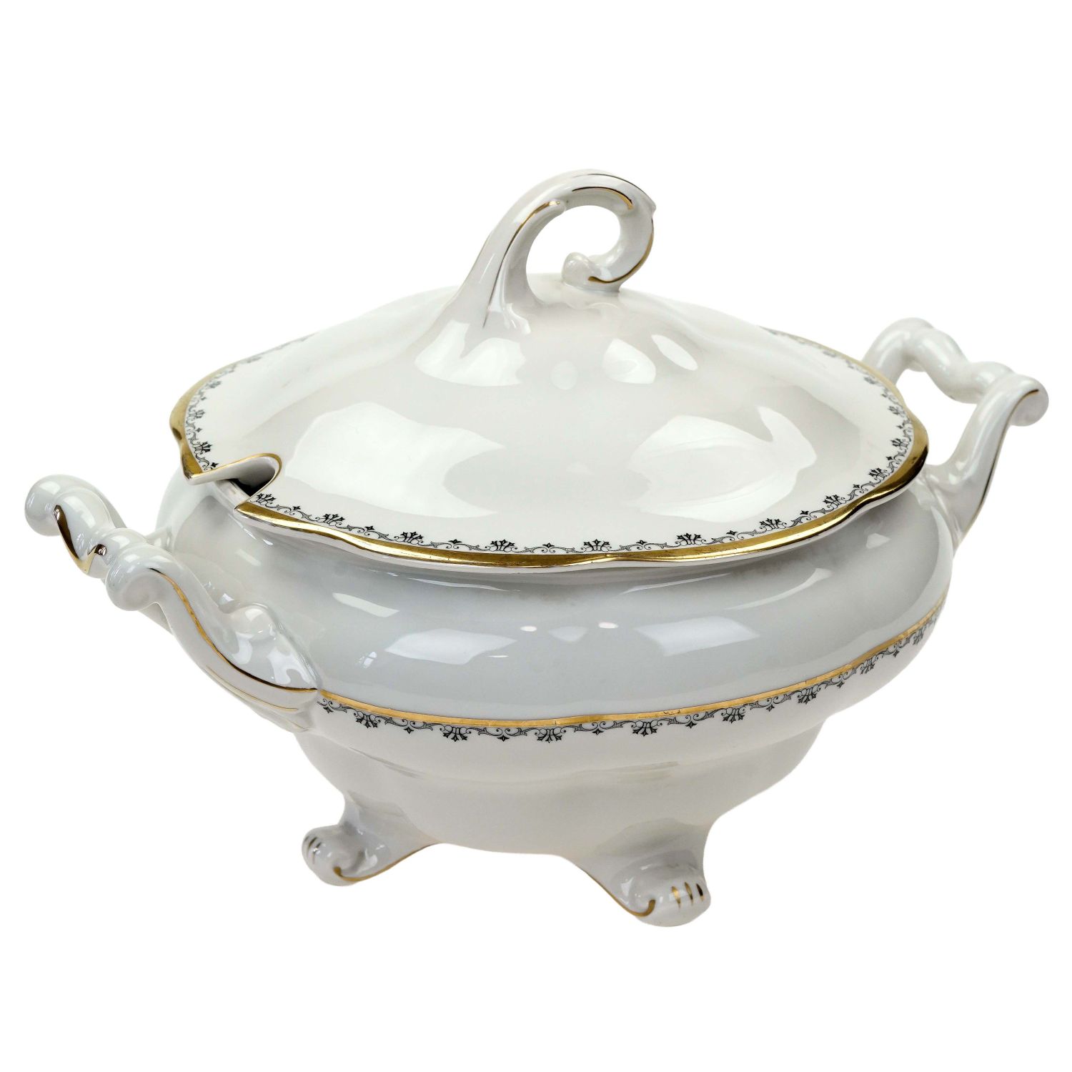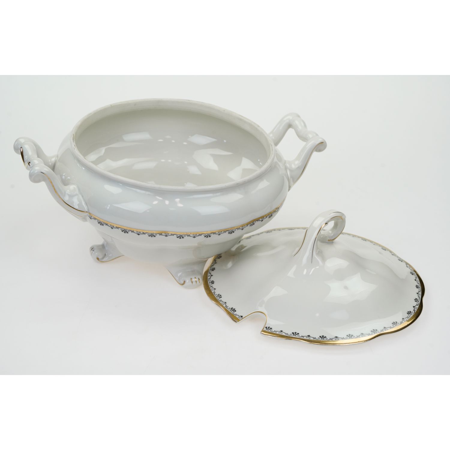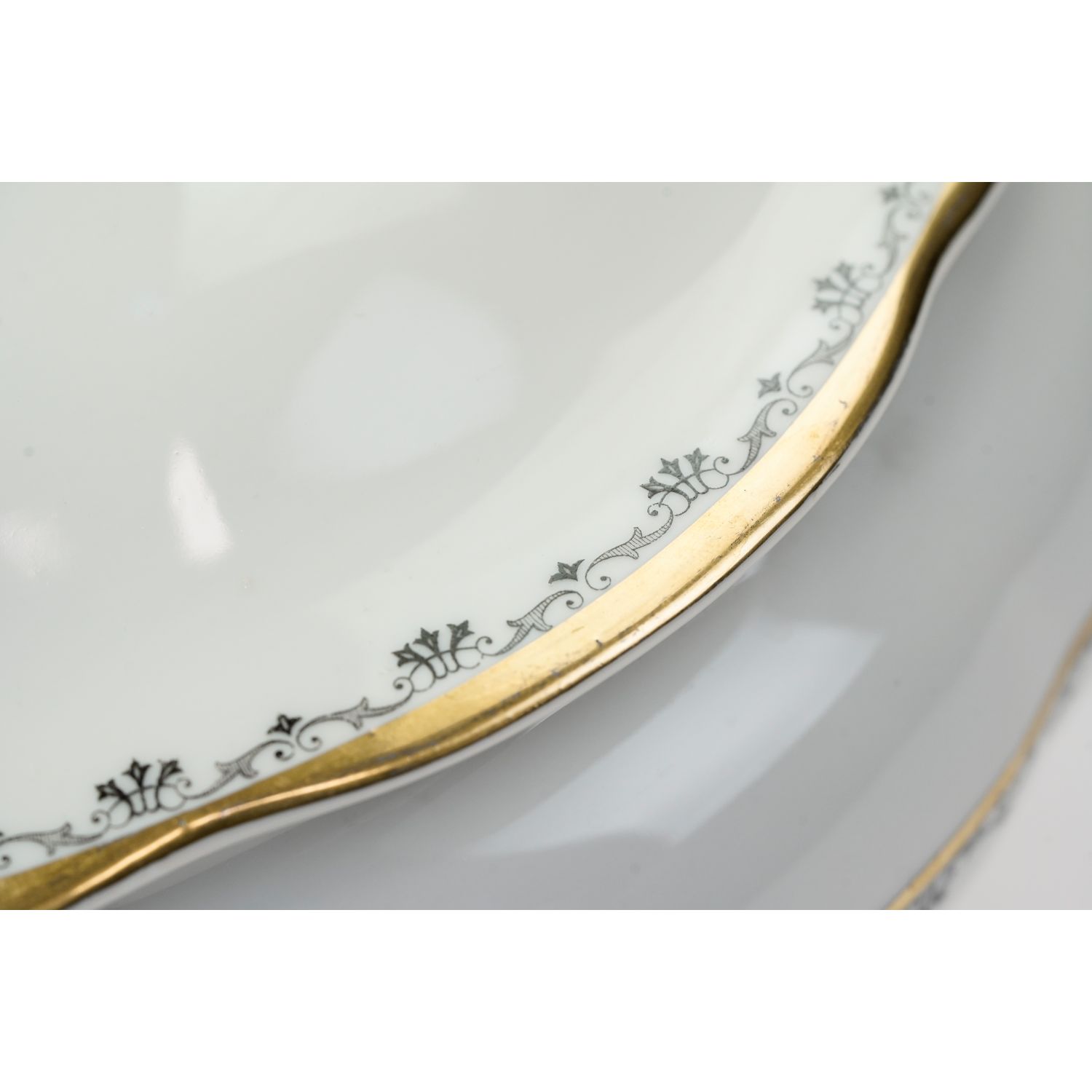 Pochodzi z wytwórni porcelany Königszelt z Jaworzyny Śląskiej z lat 1945-1948. Model Charlotte (projekt przedwojenny). Pięknie zdobiona. Osadzona na czterech nóżkach. Dekorowana gustownym, czarno-złotym otokiem Kontury w złotej obwódce. Kolor porcelany to złamana biel, jasna kość słoniowa.