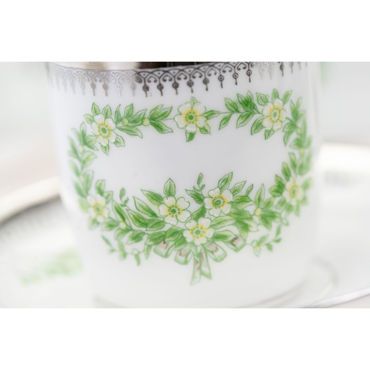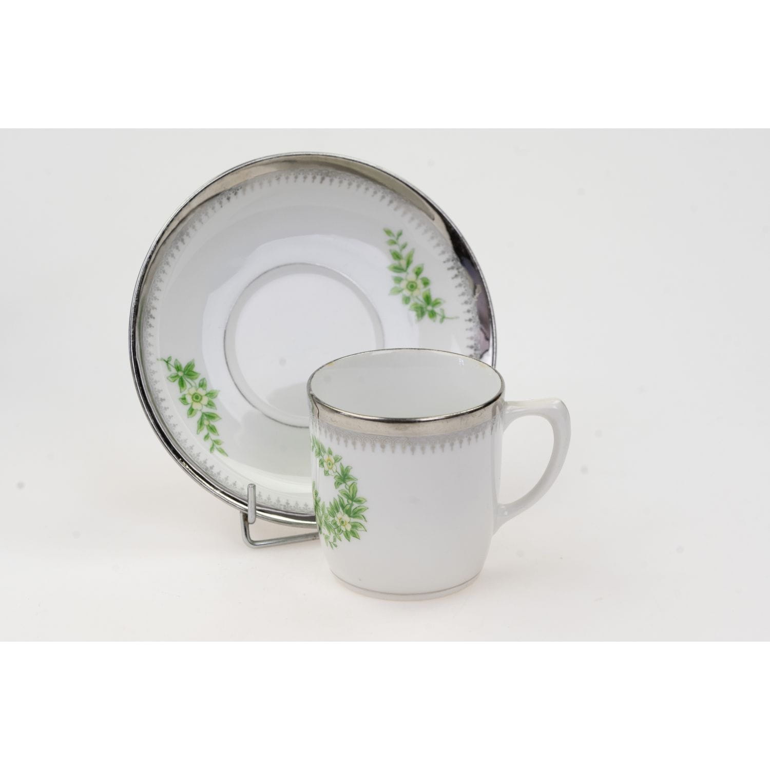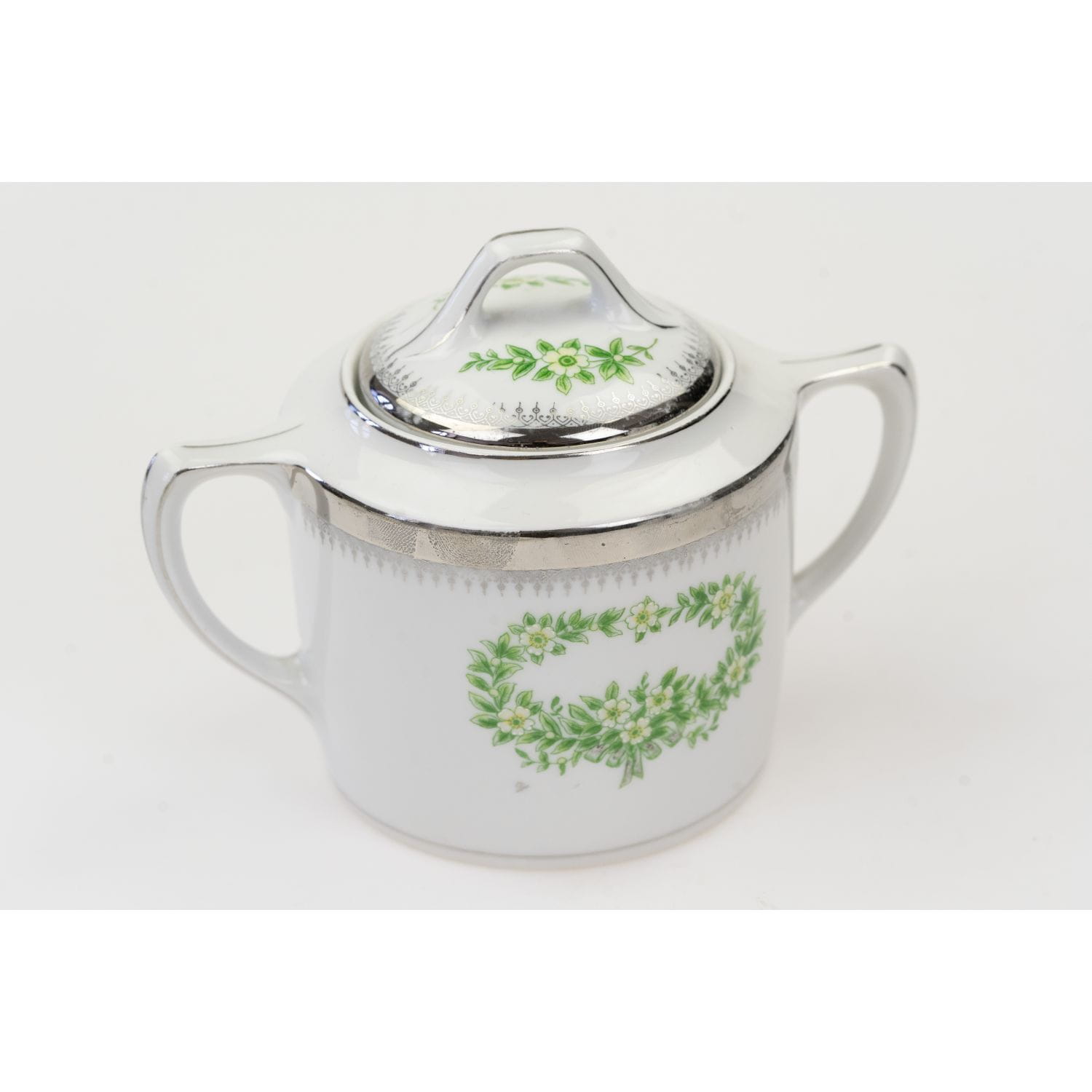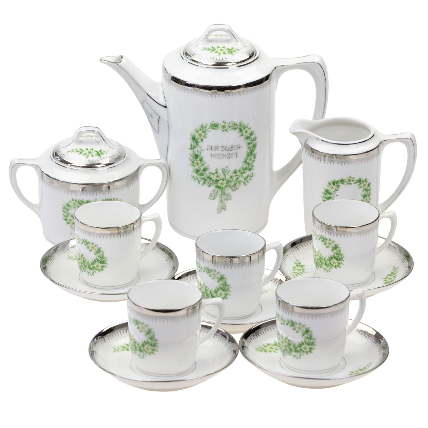 Pochodzi z Dolnego Śląska z Königszelt (obecnie Jaworzyna Śląska). Porzellanfabrik Königszelt AG. Sygnowany znakiem stosowanym od 1914 do 1918 roku. Porcelana biała o prostych formach. Na dzbanku z jednej strony srebrny napis "Zur Silber Hochzeit". Na każdym elemencie zielone wieńce i kwiatuszki ręcznie podmalowywane. Do tego srebrne ornamenty i srebrne konturówki.