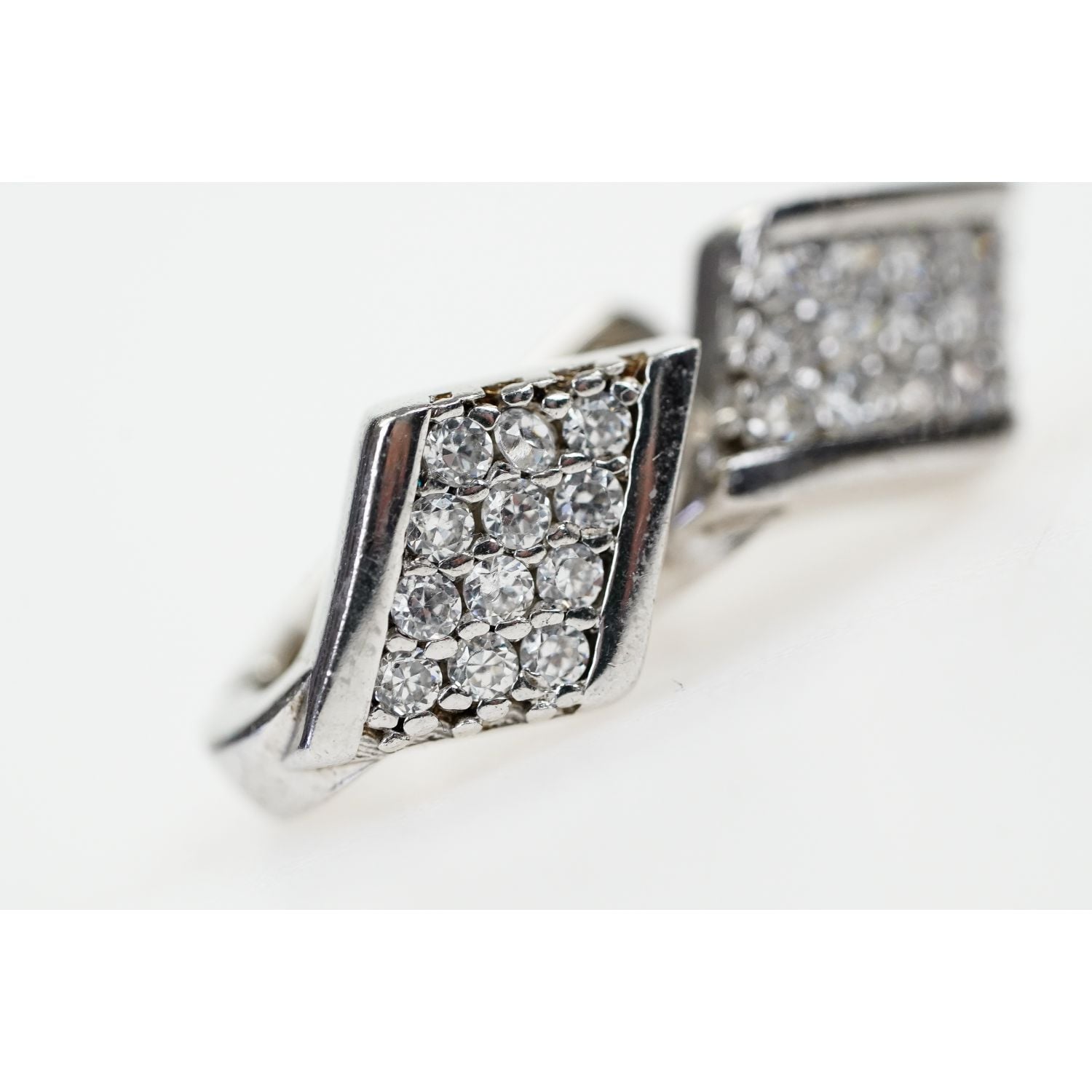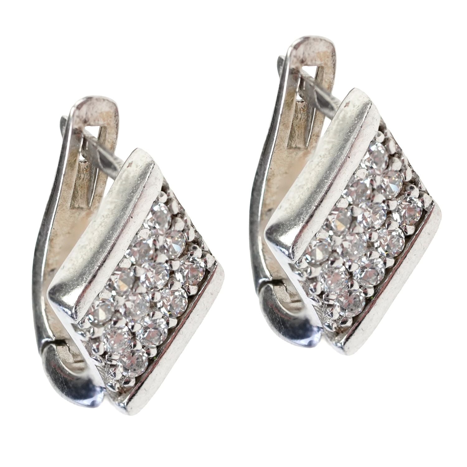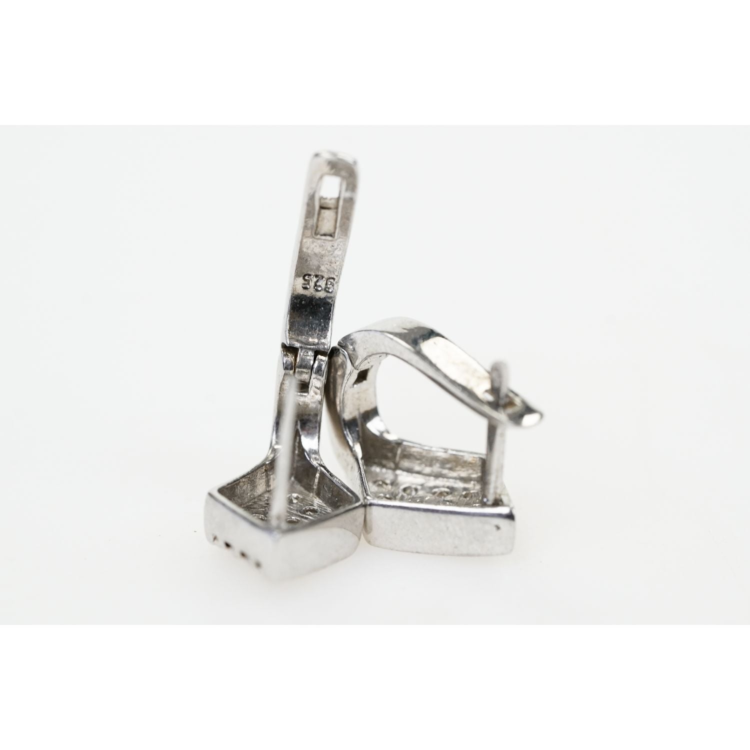 Urocze kolczyki z elementem ozdobnym w zgeometryzowanym kształcie. Wypełnione małymi błyszczącymi oczkami. Wewnątrz wybita punca z cyfrą 925.
