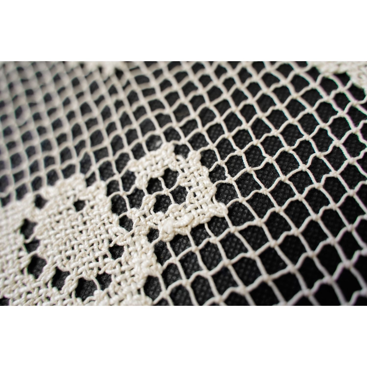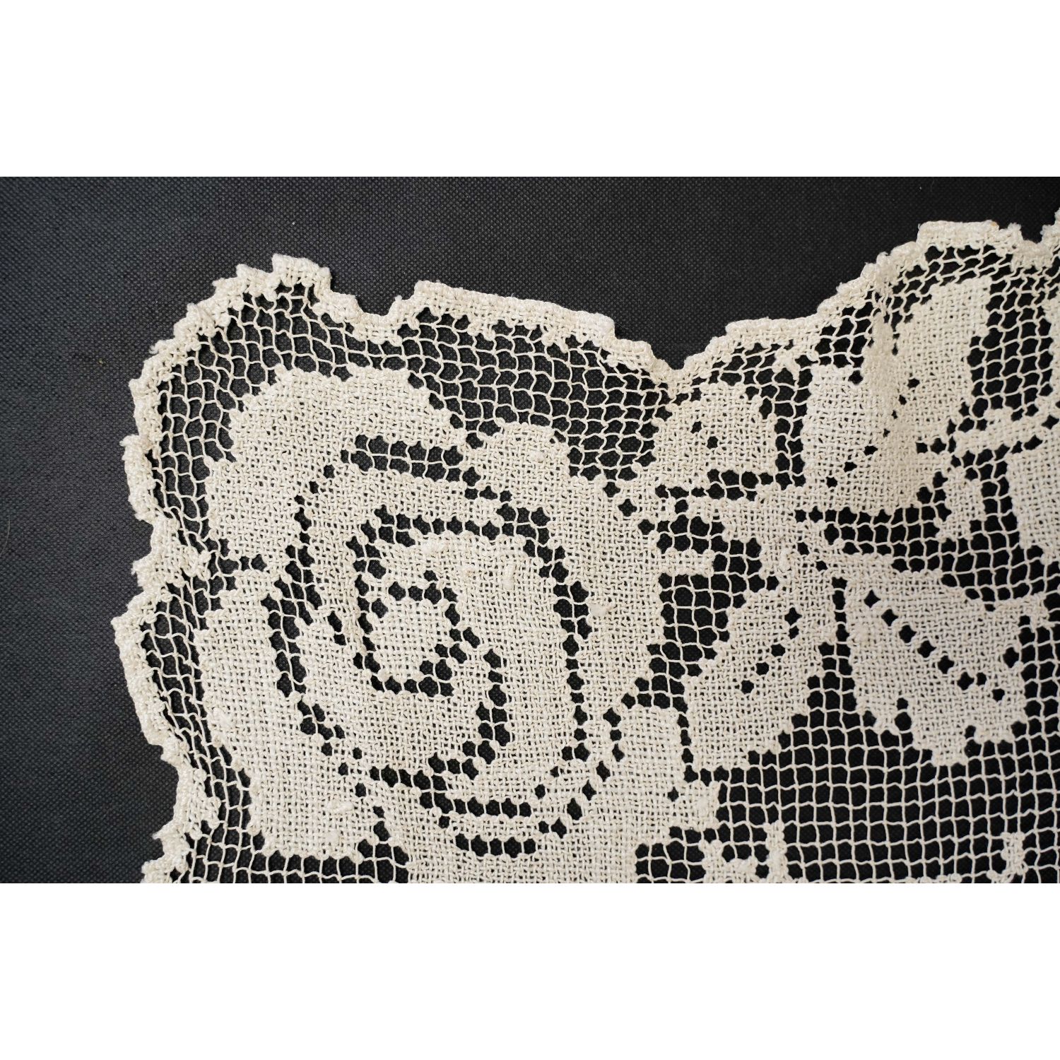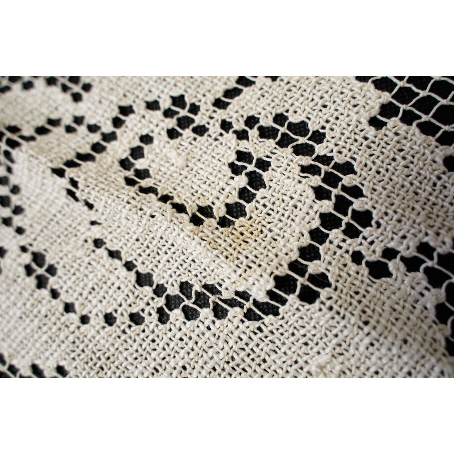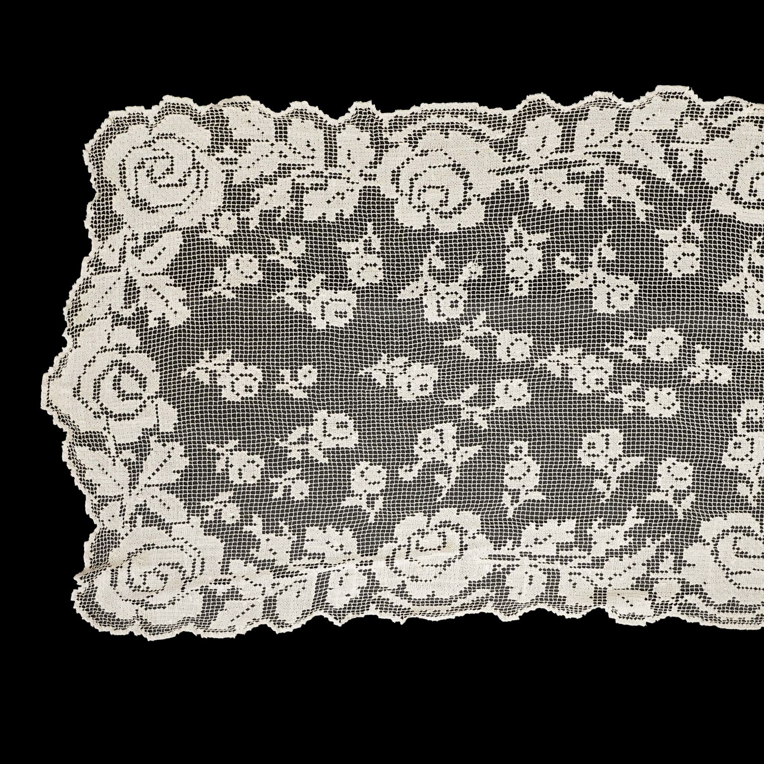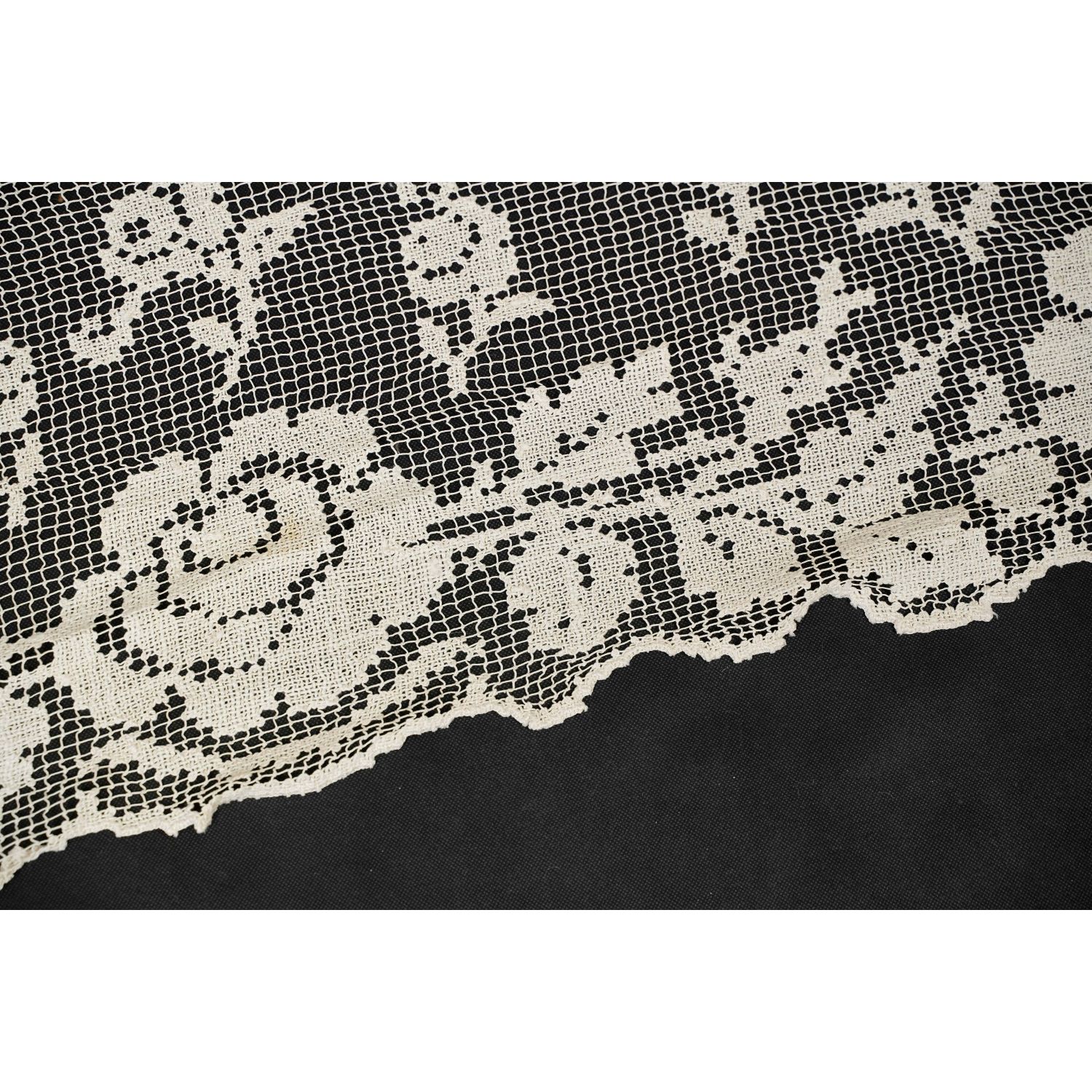 Na ręcznie wiązanej siatce bogaty haft w różyczki, gęsty deseń. Nitka bawełniana, kremowa, haft z grubych nici. Przy krawędziach szlaczek dużych róż.