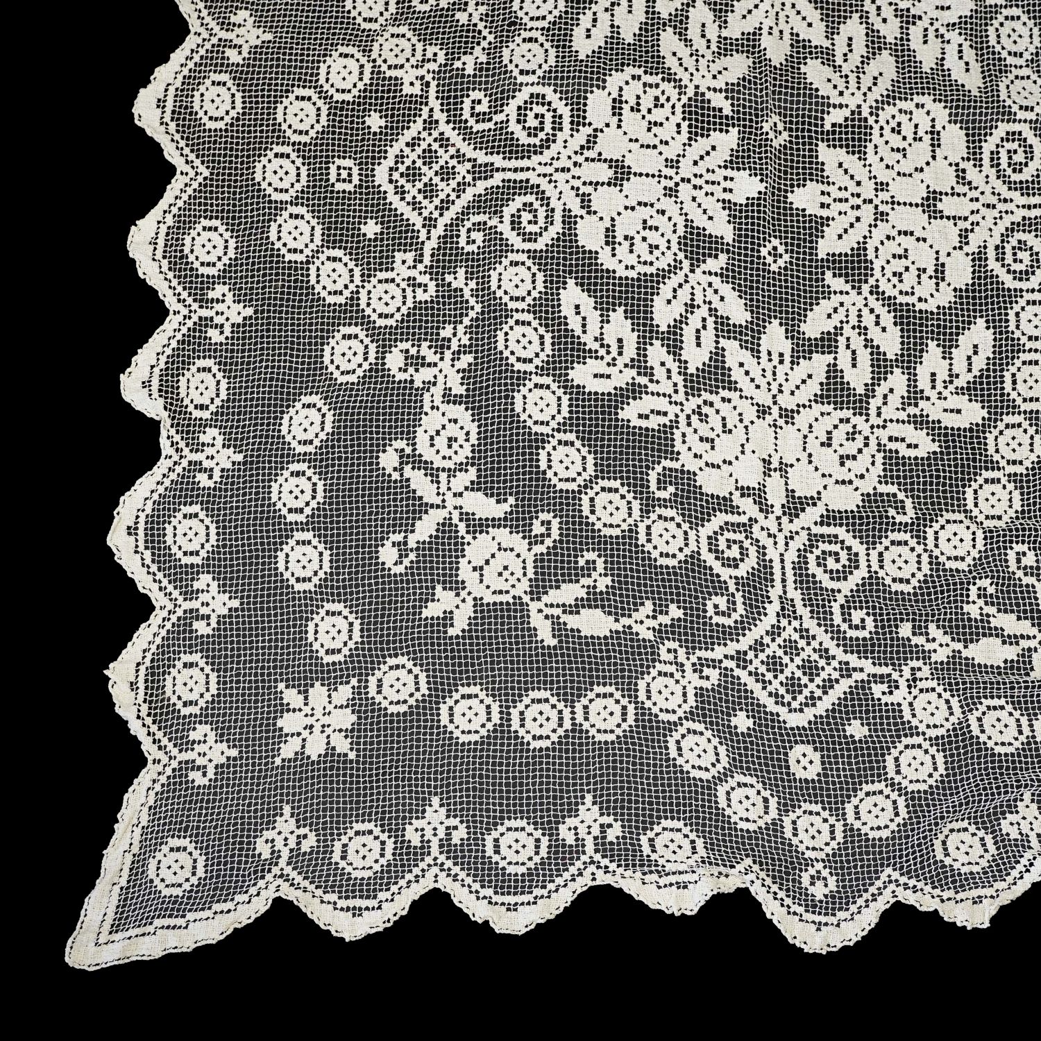 Stara kołkowa firanka z wyrazistym wzorem w kwiaty lub obrus na duży stół.