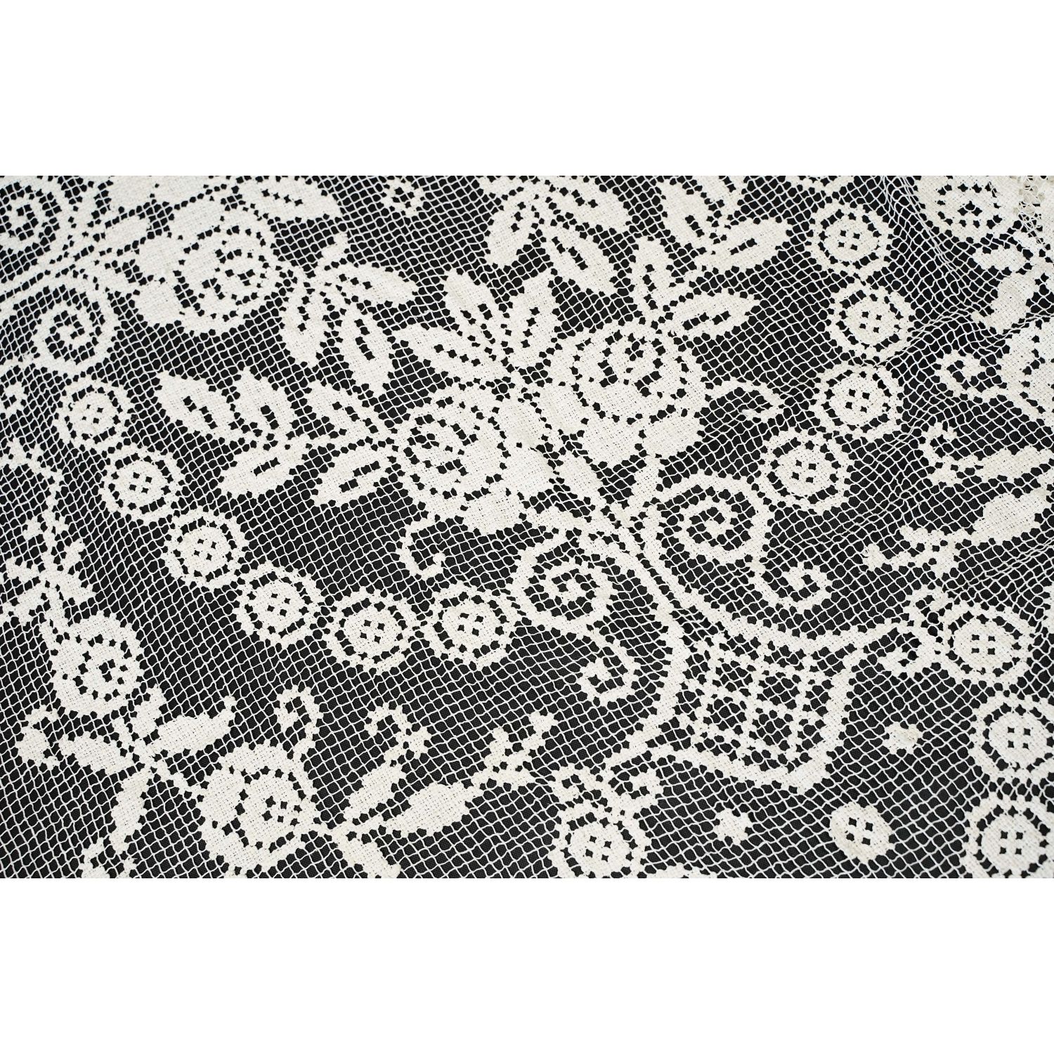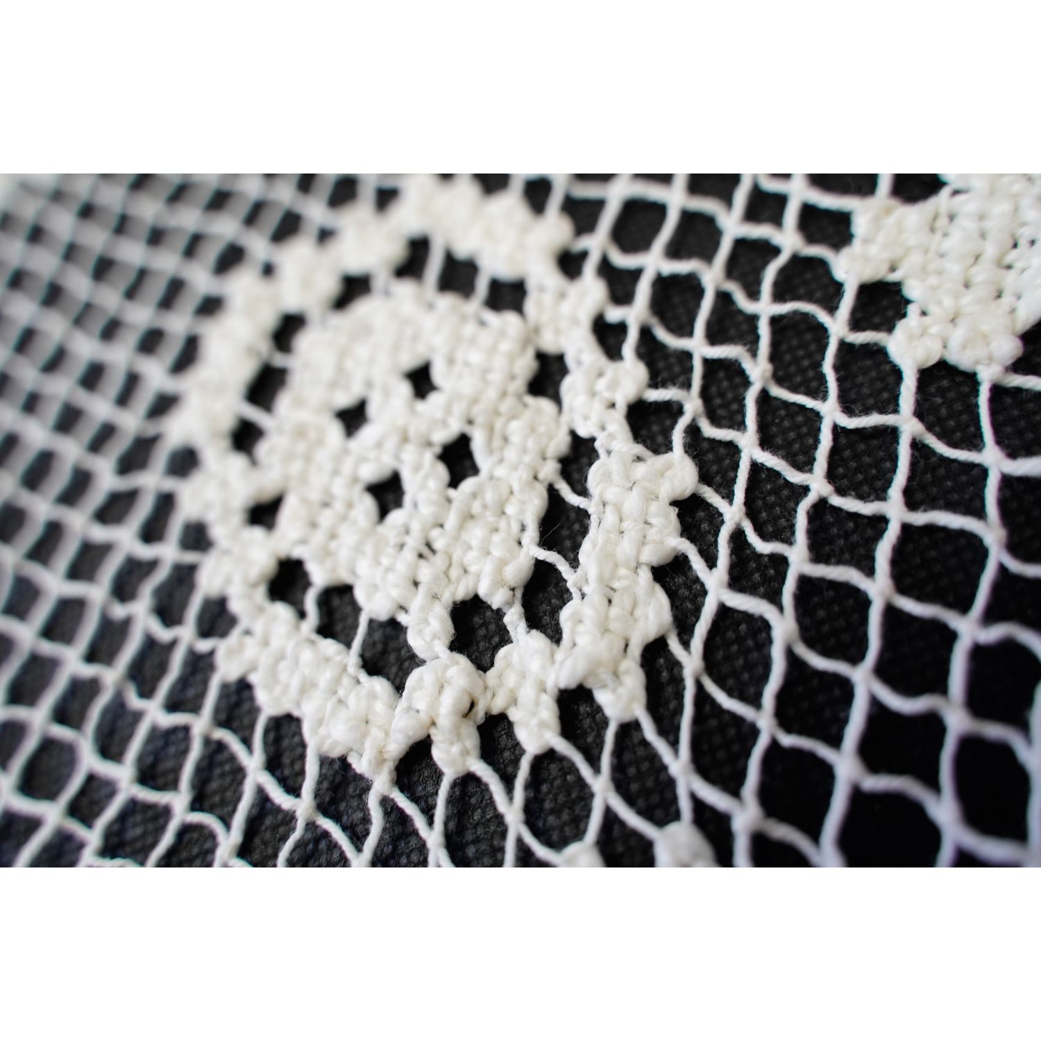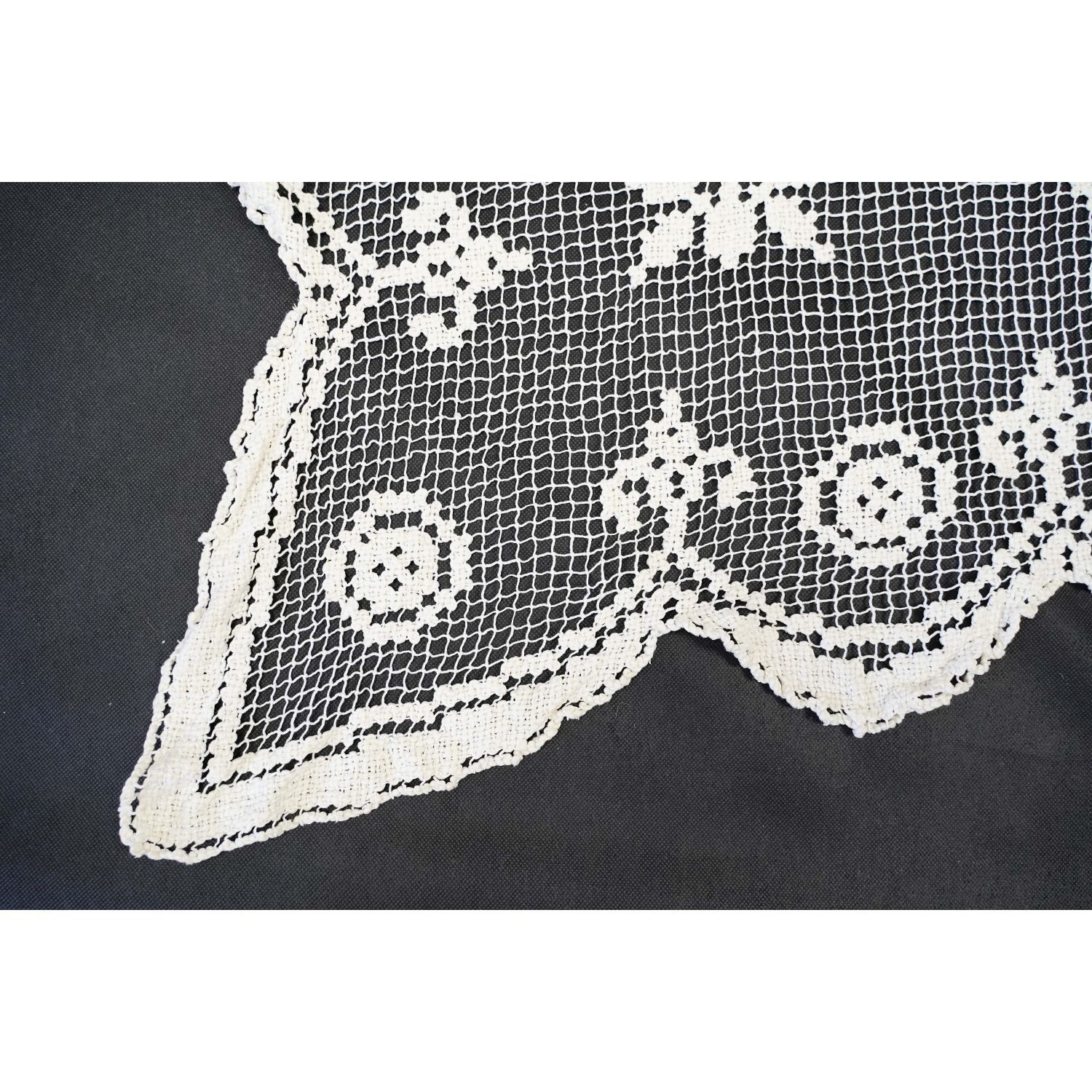 Na ręcznie wiązanej siatce bogaty haft w kwiatowy, gęsty deseń. Nitka bawełniana, kremowa, haft z grubych nici. Krawędzie wykończone zębami.