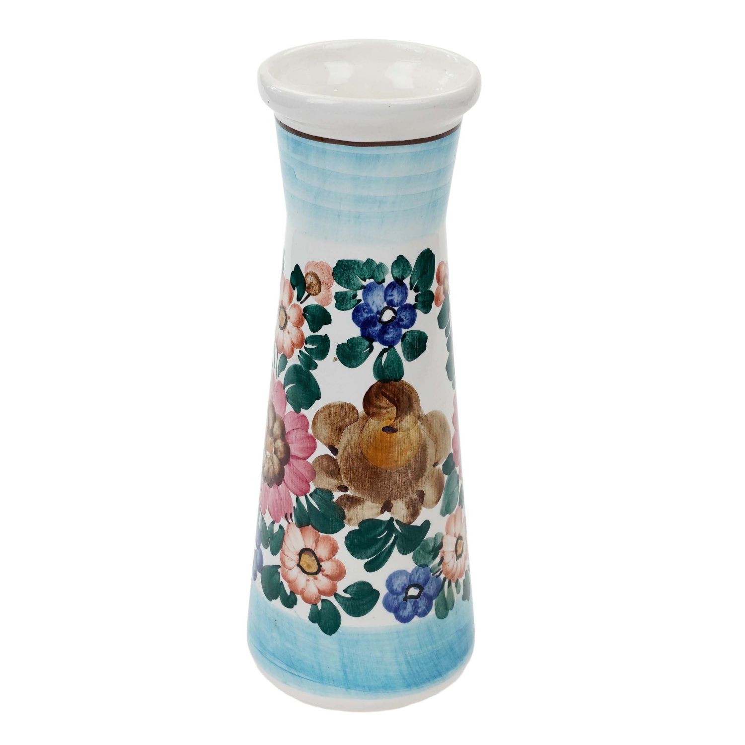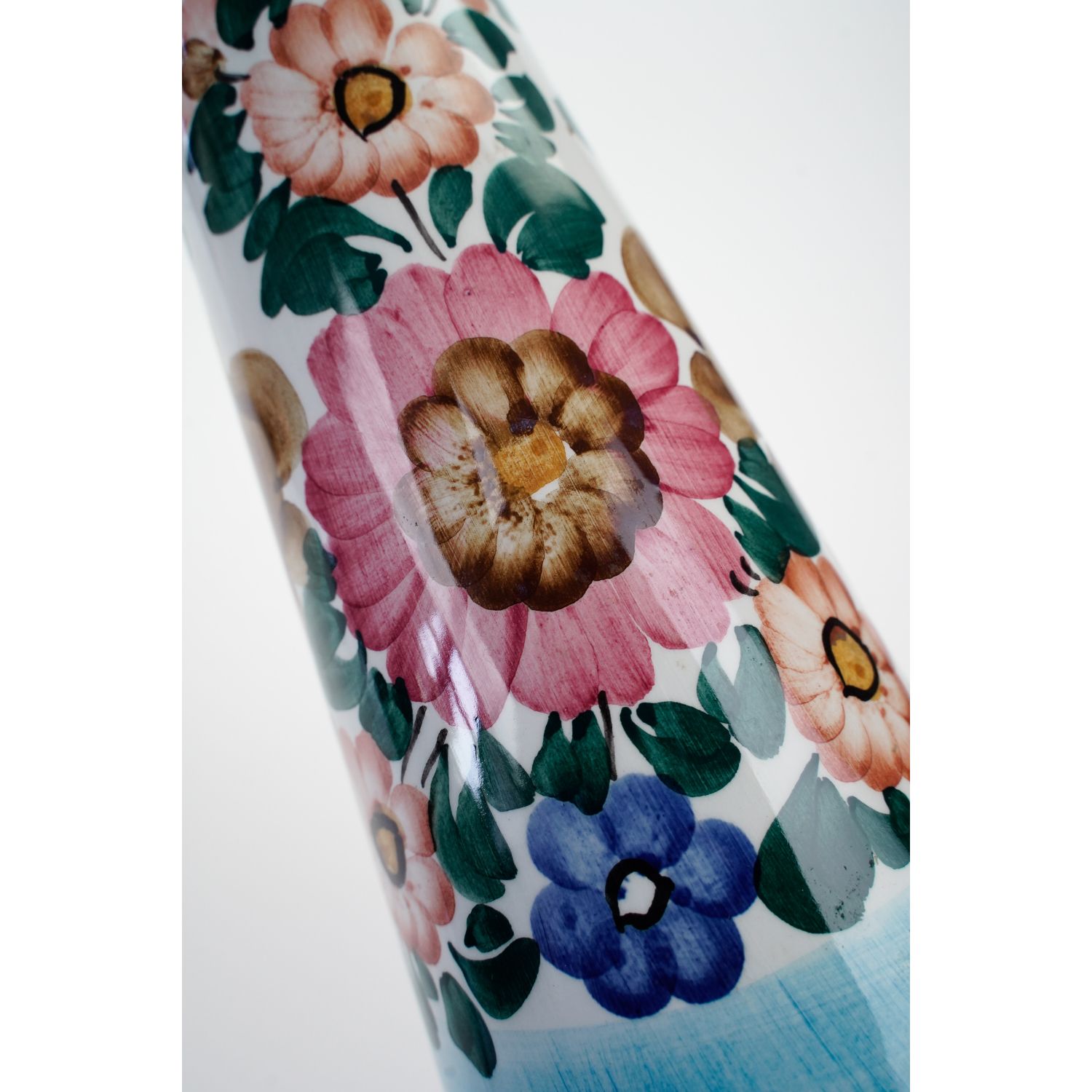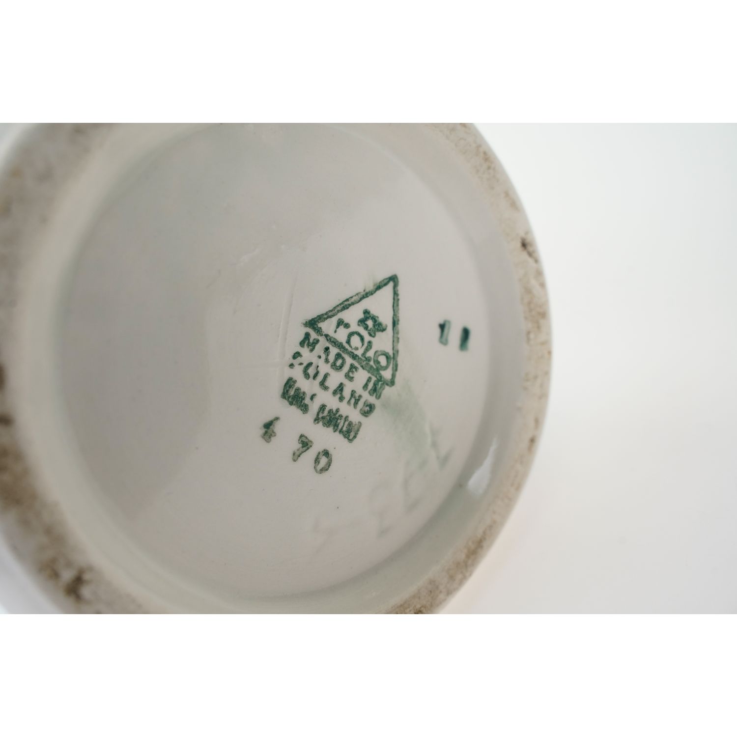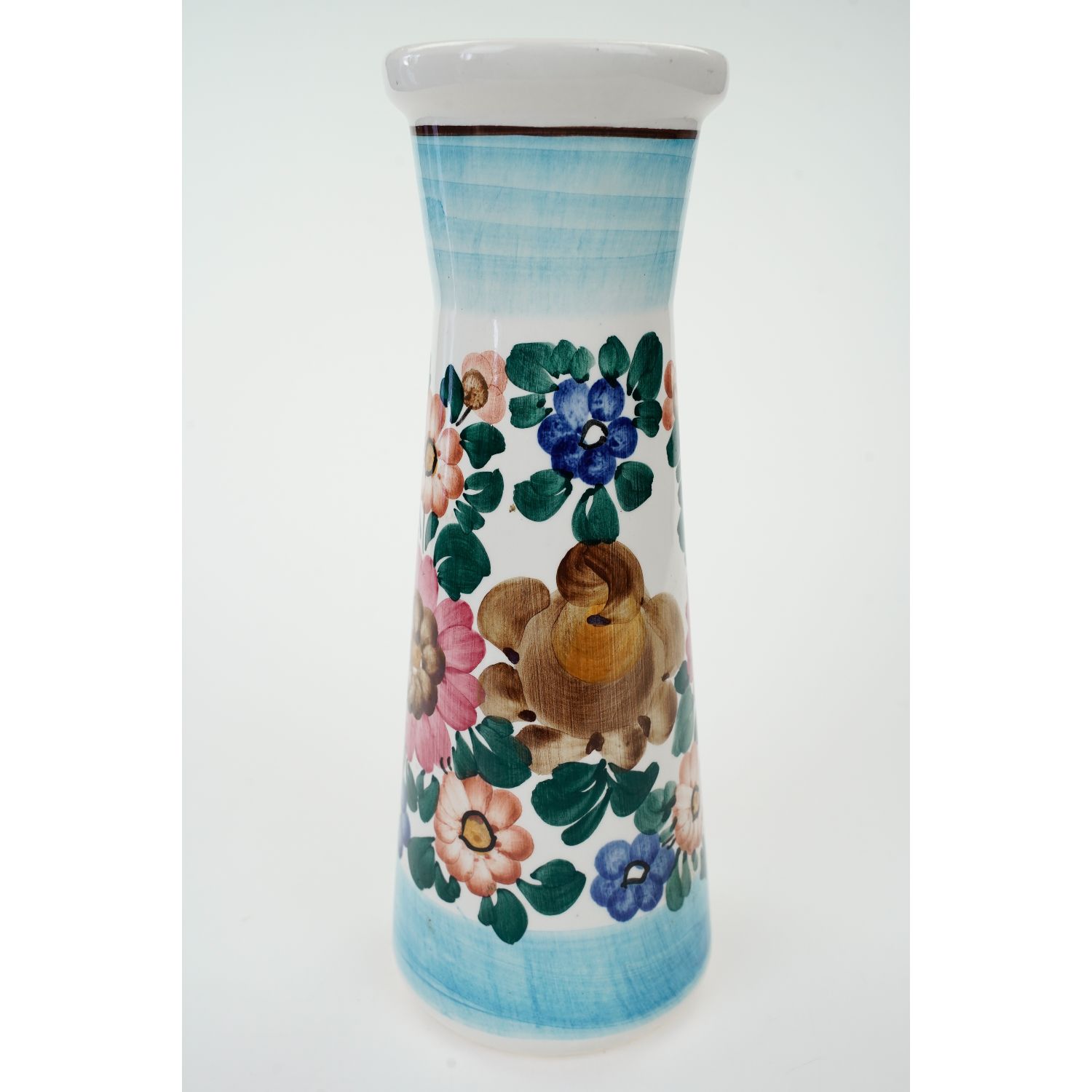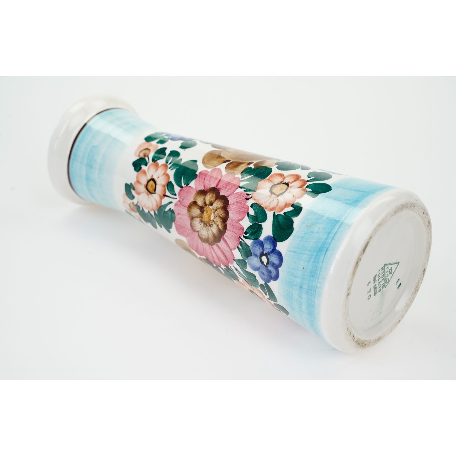 Pochodzi z Koła z Zakładów Fajansu Koło. Sygnowany znakiem stosownym od 1951 roku. Całość w kolorze złamanej bieli, jasnego kremu. Na tym tle ręczna, kwiatowa, wielobarwna malatura. Z błękitnymi obwódkami przy górnej i dolnej krawędzi.