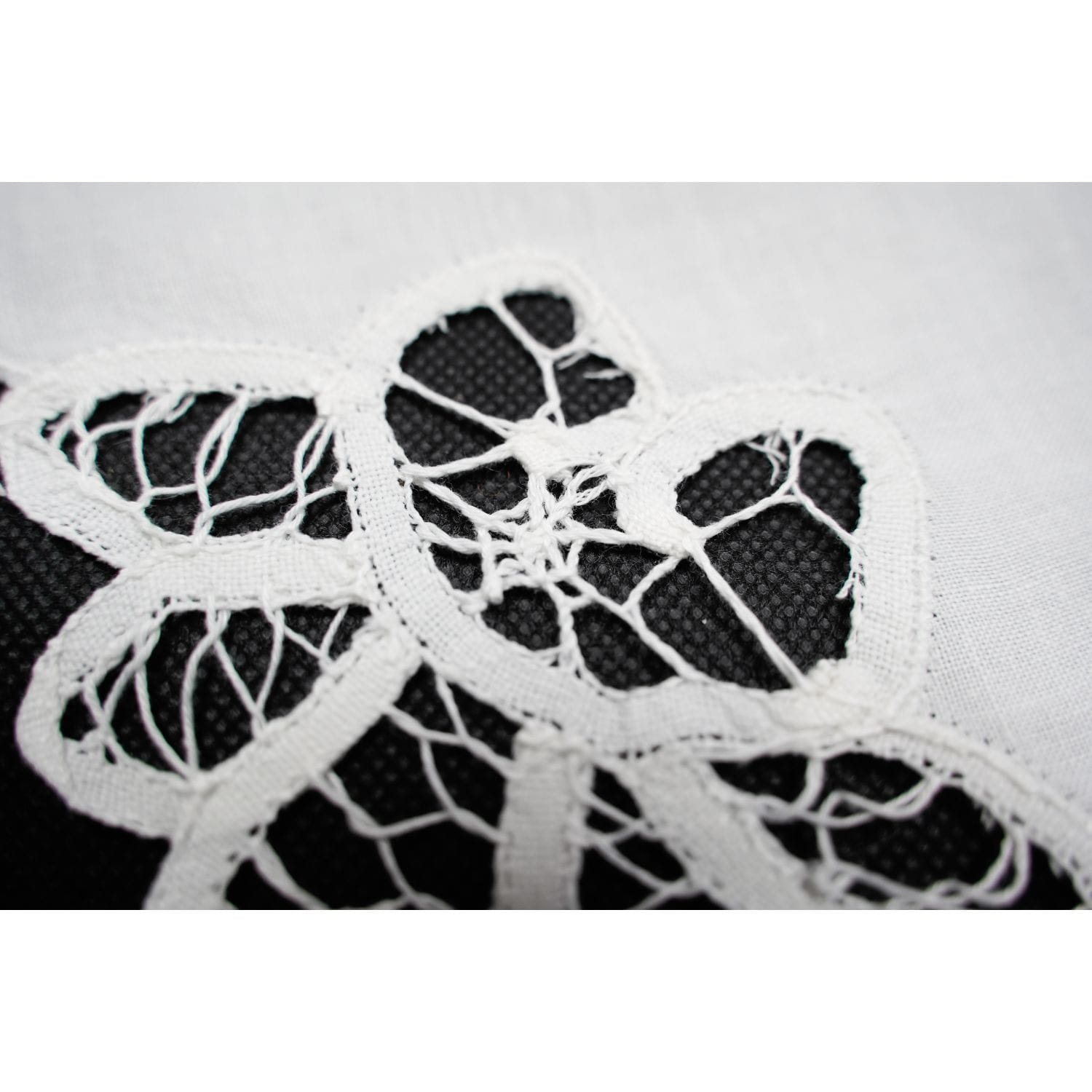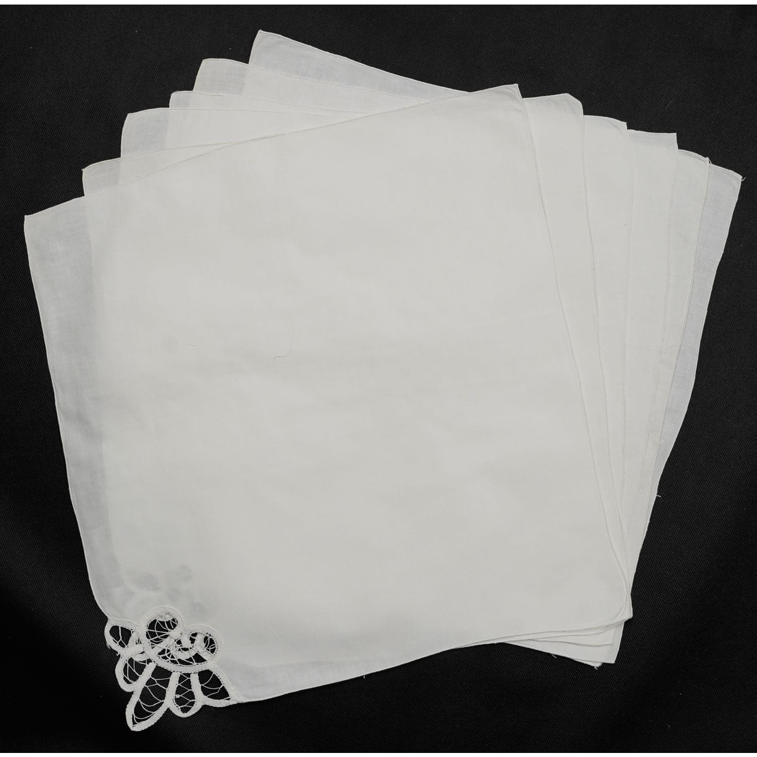 Brzegi obszyte maszynowo. Na każdej z serwetek w jednym z rogów koronka typu brukselskiego.