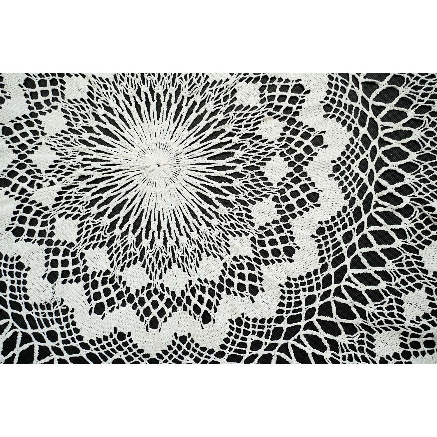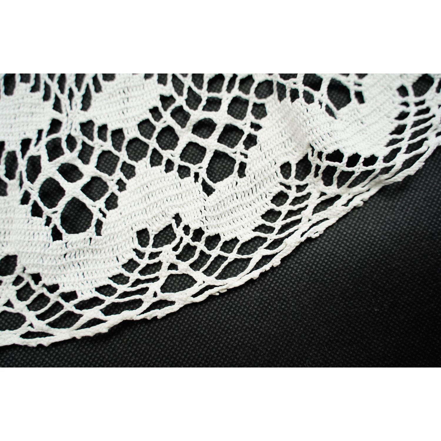 Ze sporymi ażurkami i dekoracyjnym, skomplikowanym wzorem w zawijasy. Nitka w kolorze złamanej bieli, delikatna.