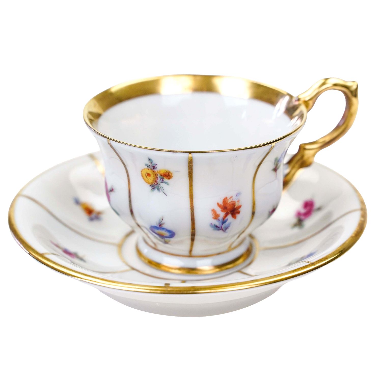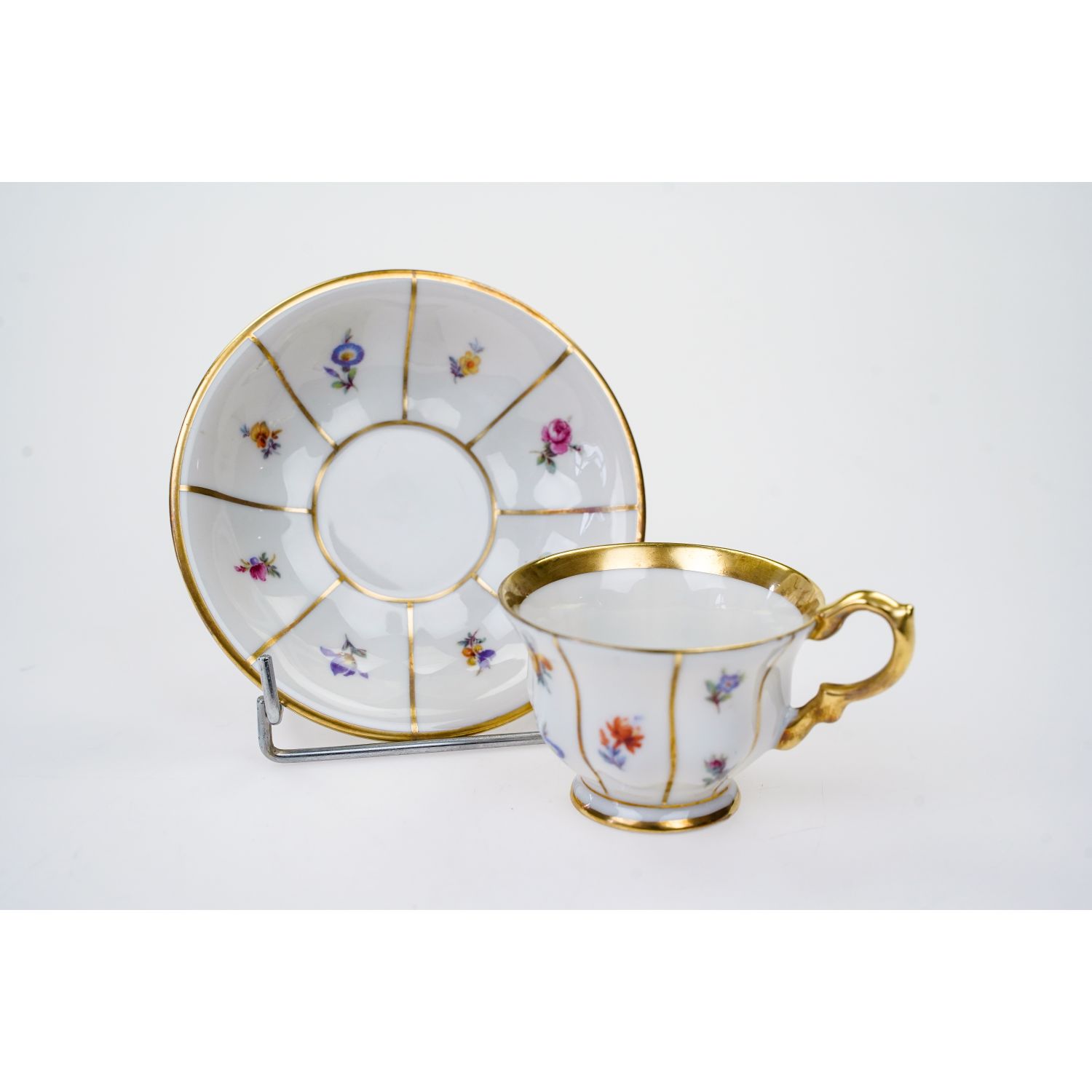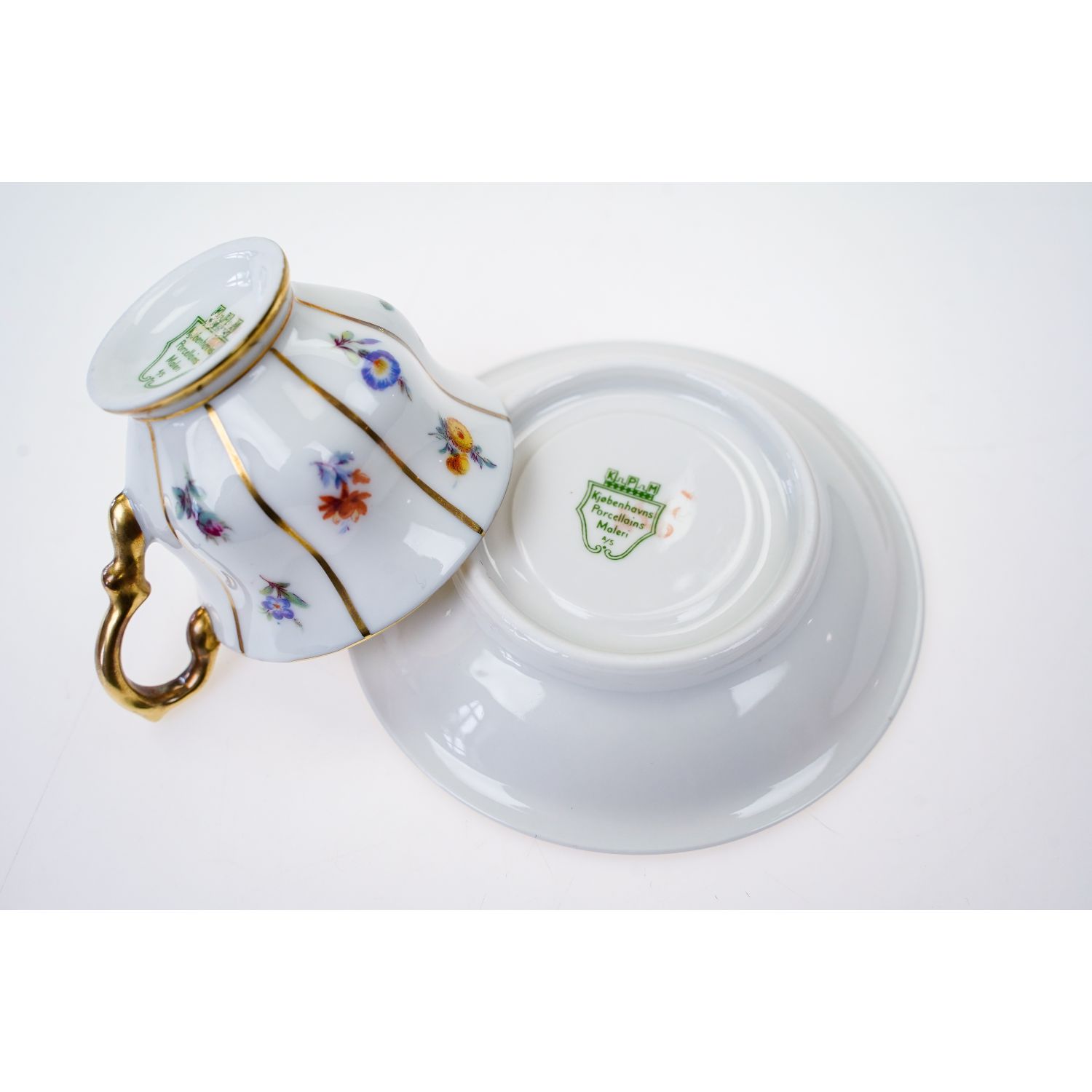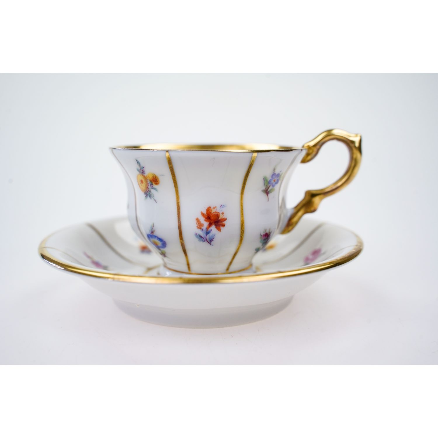 KPM KOPENHAGA BIAŁA MOKKA FILIŻANKA ZE SPODKIEM KWIATECZKI ZE ZŁOCENIAMI