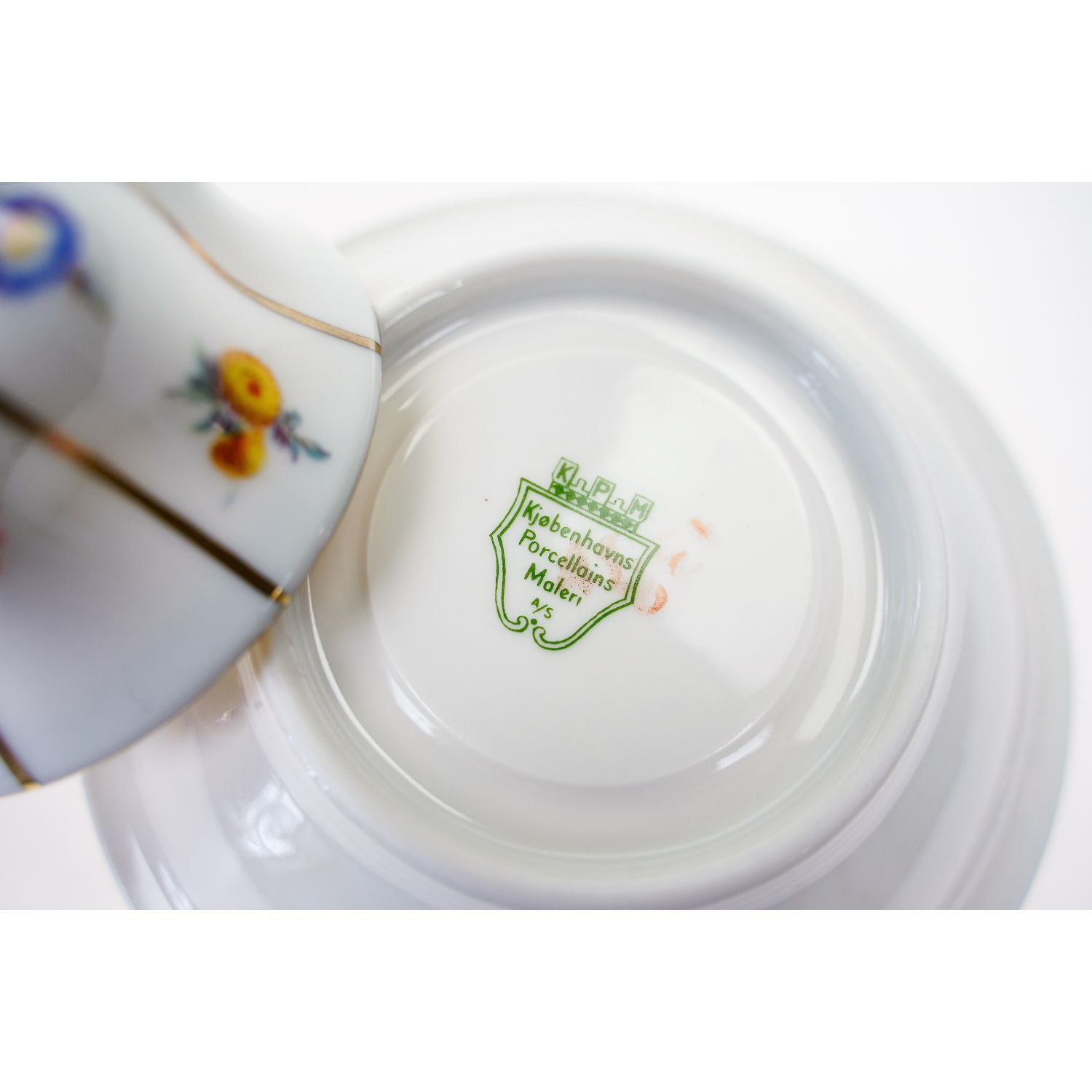 Mała, do mokki. Pochodzi z Danii z Kongens Lyngby z Kjøbenhavns Porcellains Måleri. Do tego numeryczne znaczki. Filiżanka ozdobiona ręcznie nakładanymi złoceniami. Pomiędzy nimi małe, barwne, kolorowe kwiatuszki. Biała porcelana. Całość cechują eleganckie, klasyczne kształty. Ładnie wyprofilowane uszko, wywinięte ponad krawędź filiżanki. Uszko w pełni złocone. Ranty filiżanki oraz talerzyka są złocone.