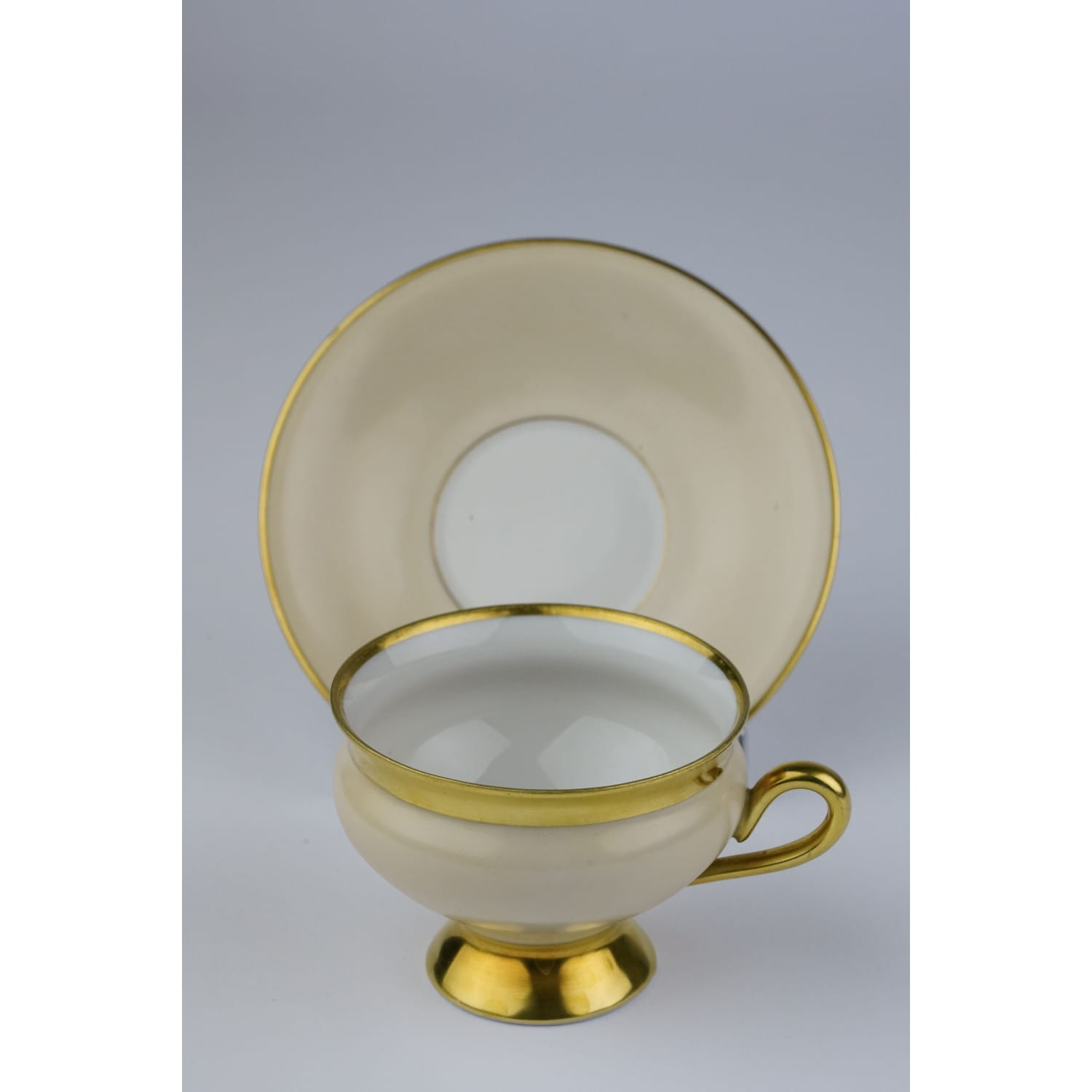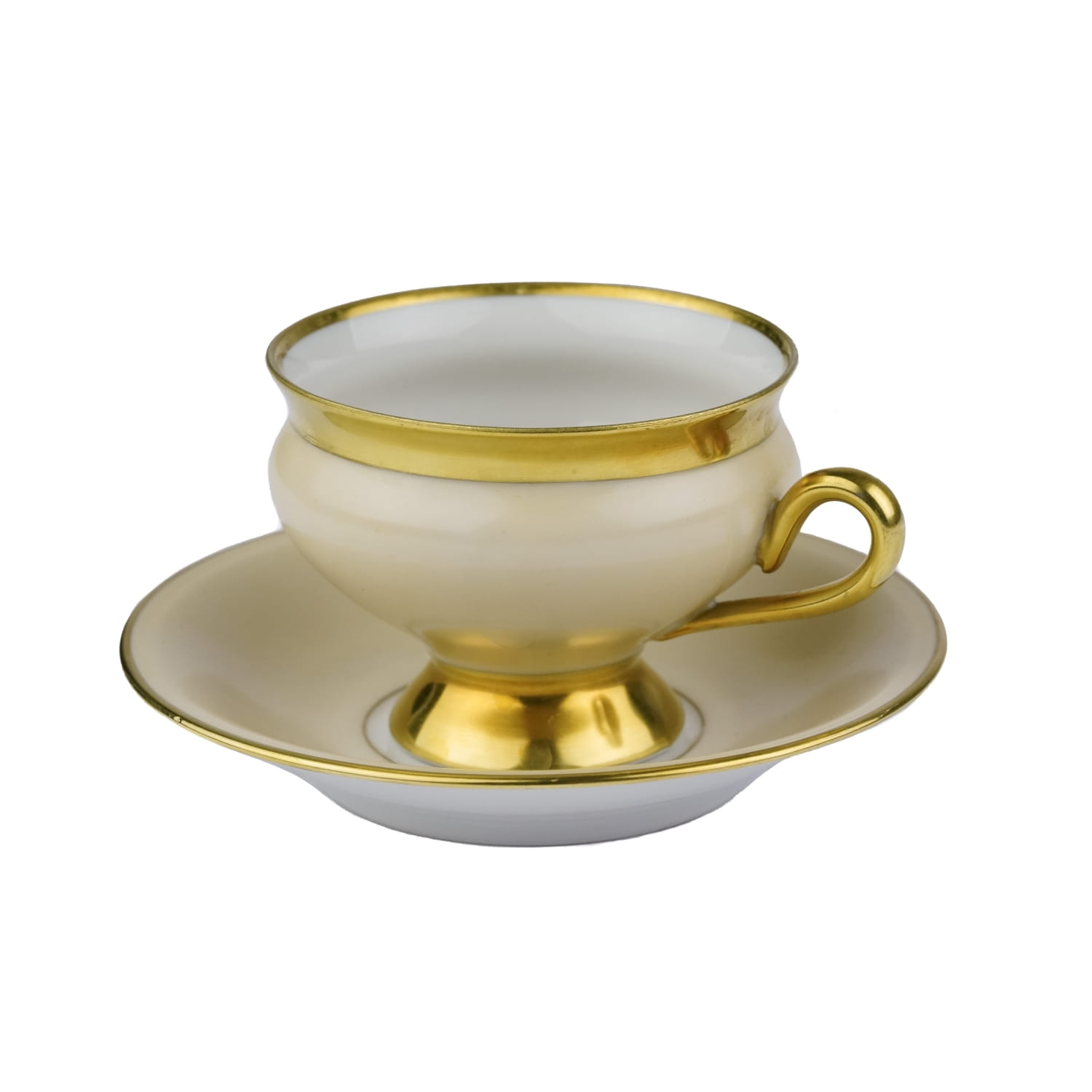 Pochodzi z Danii z Kongens Lyngby z Kjøbenhavns Porcellains Måleri. Do tego numeryczne znaczki. Porcelana w kolorze białym niemal w całości pokryta kremowo-beżową, "cielistą" malaturą. Przy krawędziach filiżanki grube złocenia i w pełni złocone uszko. Spodek delikatniej złocony.