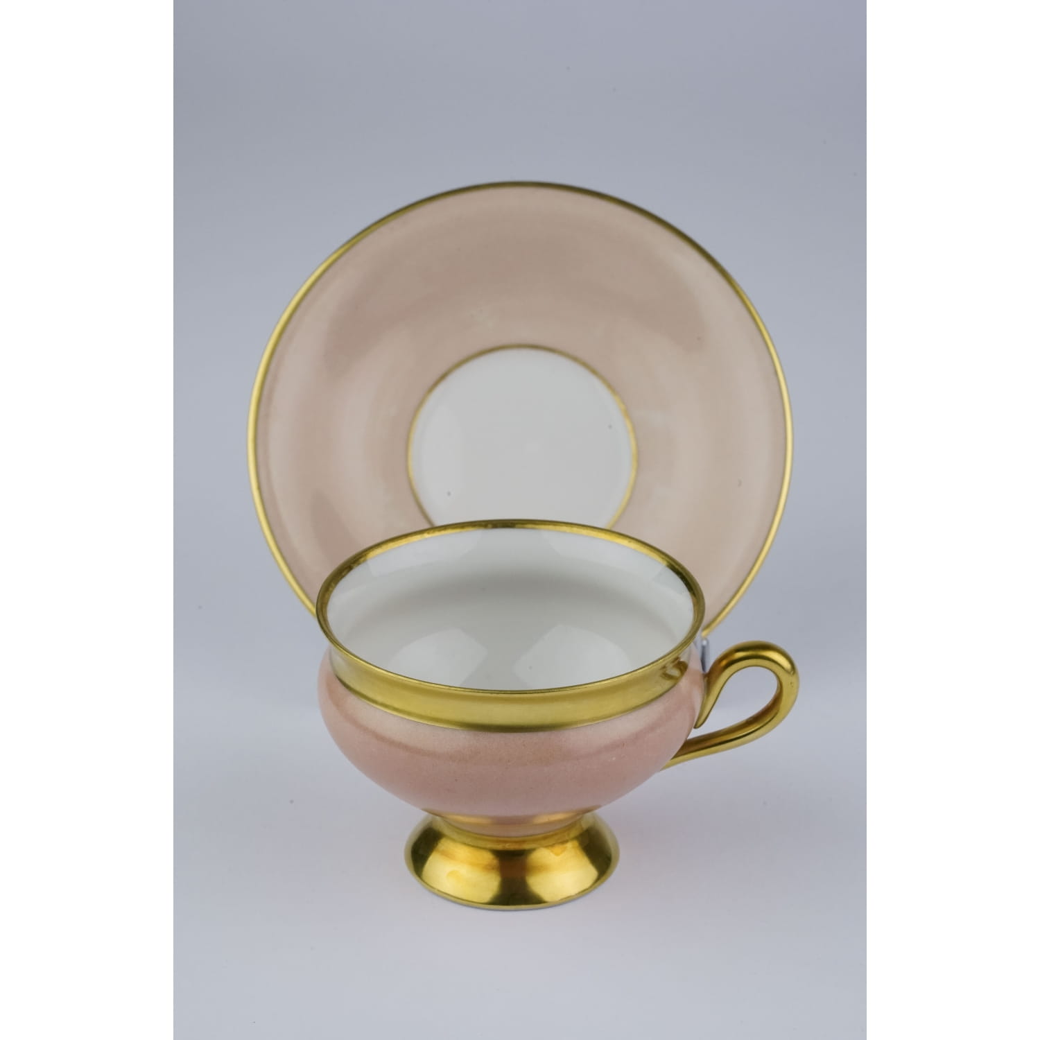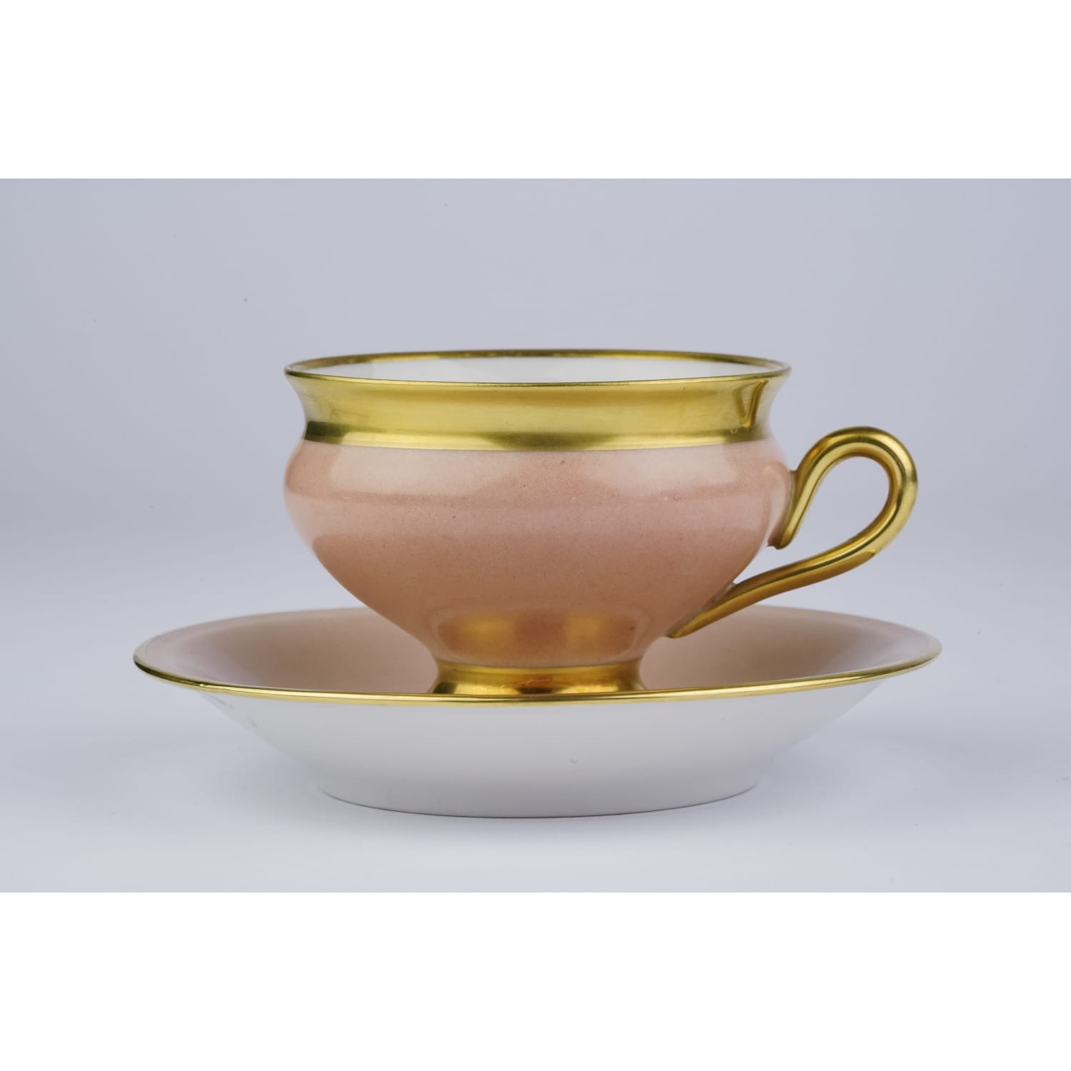 Pochodzi z Danii z Kongens Lyngby z Kjøbenhavns Porcellains Måleri. Do tego numeryczne znaczki. Porcelana w kolorze białym niemal w całości pokryta łososiową malaturą. Przy krawędziach filiżanki grube złocenia i w pełni złocone uszko. Spodek delikatniej złocony.