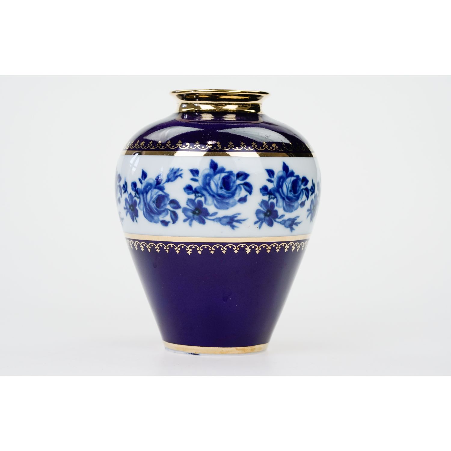 Wykonany z najwyższej jakości porcelany. W całości powleczony został prawdziwym kobaltem. Na brzuścu wkomponowano bardzo efektowną, bogatą dekorację w postaci szlaczka kobaltowych róż w rameczkach delikatnych złotych ornamentów. Wylew jaki i podstawę podkreślono oryginalnym złoceniem. Uwagę zwraca klasyczna pękata forma. Wazon prezentuje się wyśmienicie!