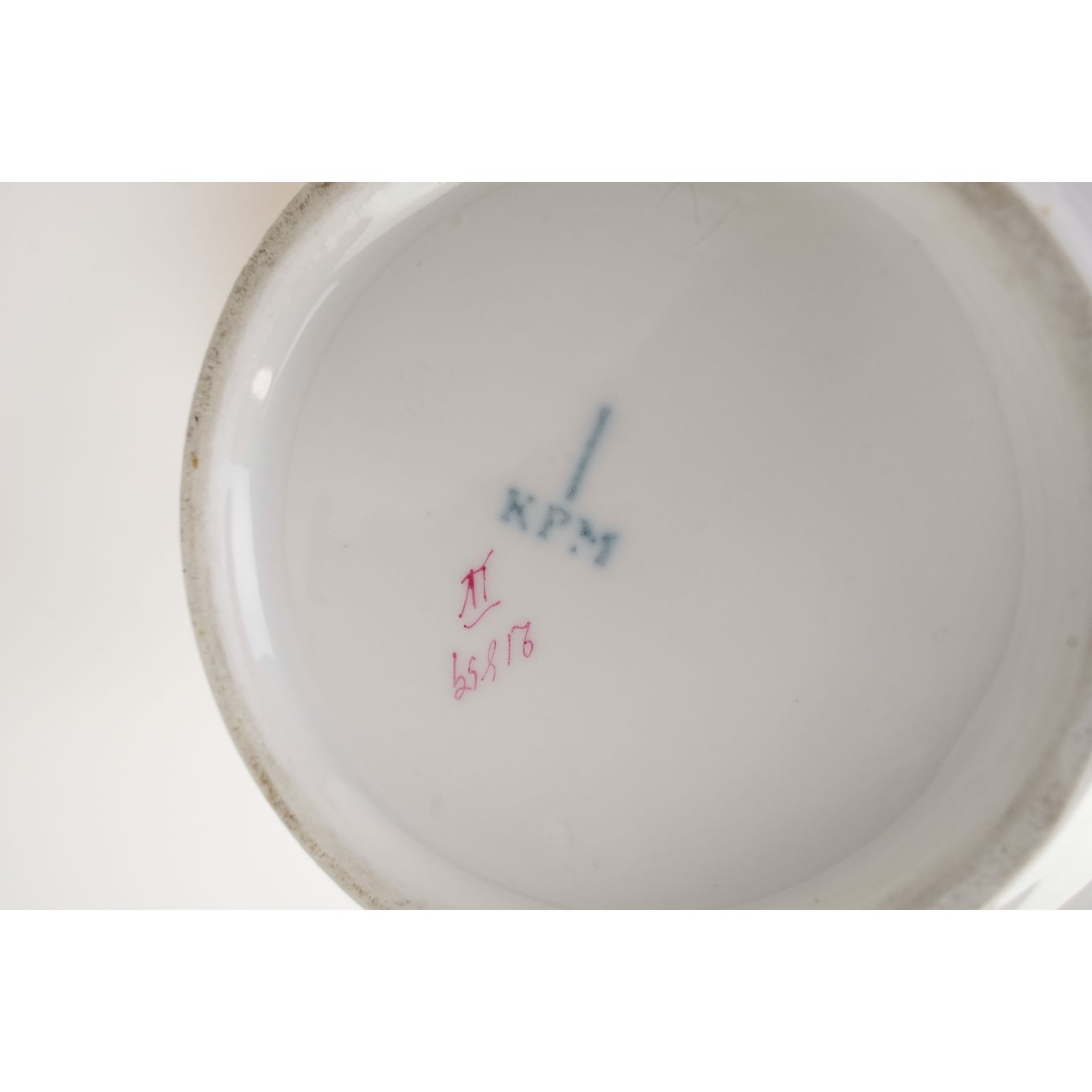 Pochodzi z Wałbrzycha (niem. Waldenburg), z Carl Krister Porzellanfabrik. Sygnowany znakiem stosowanym od 1840 do 1895 roku. Do tego odręczny, numeryczny znak dekoratora i znaki wydrapane w masie pod szkliwem. Solidna, dość gruba porcelana w odcieniu bieli, u dołu kanelowana, pokryta ręczną malaturą przedstawiającą piękne, fioletowe kwiatuszki. Kontury obwiedzione złotem.