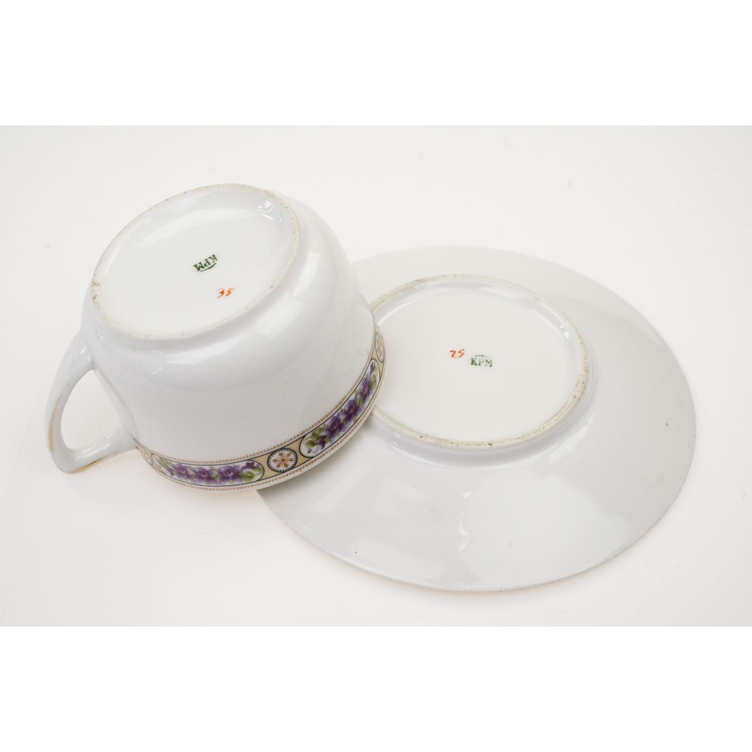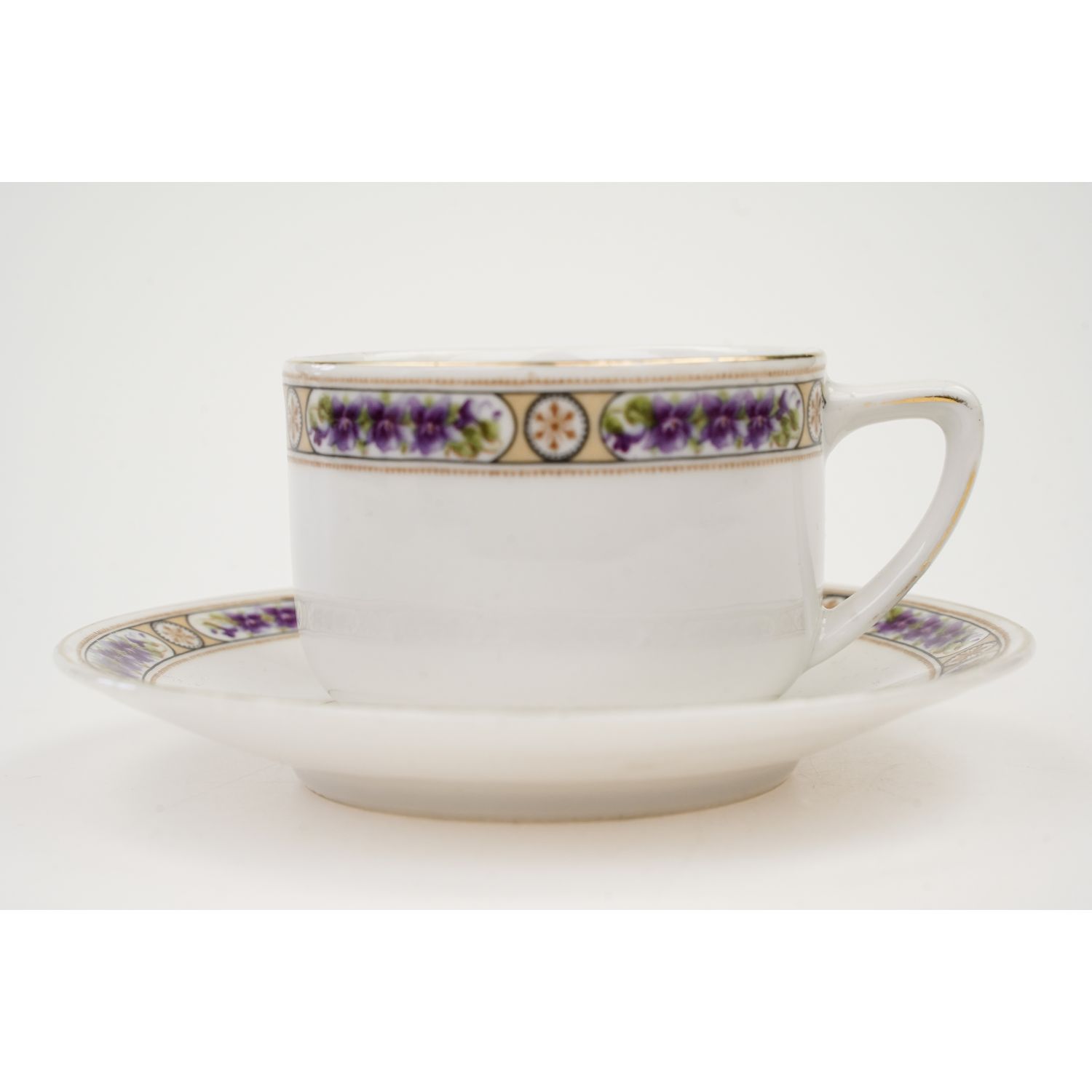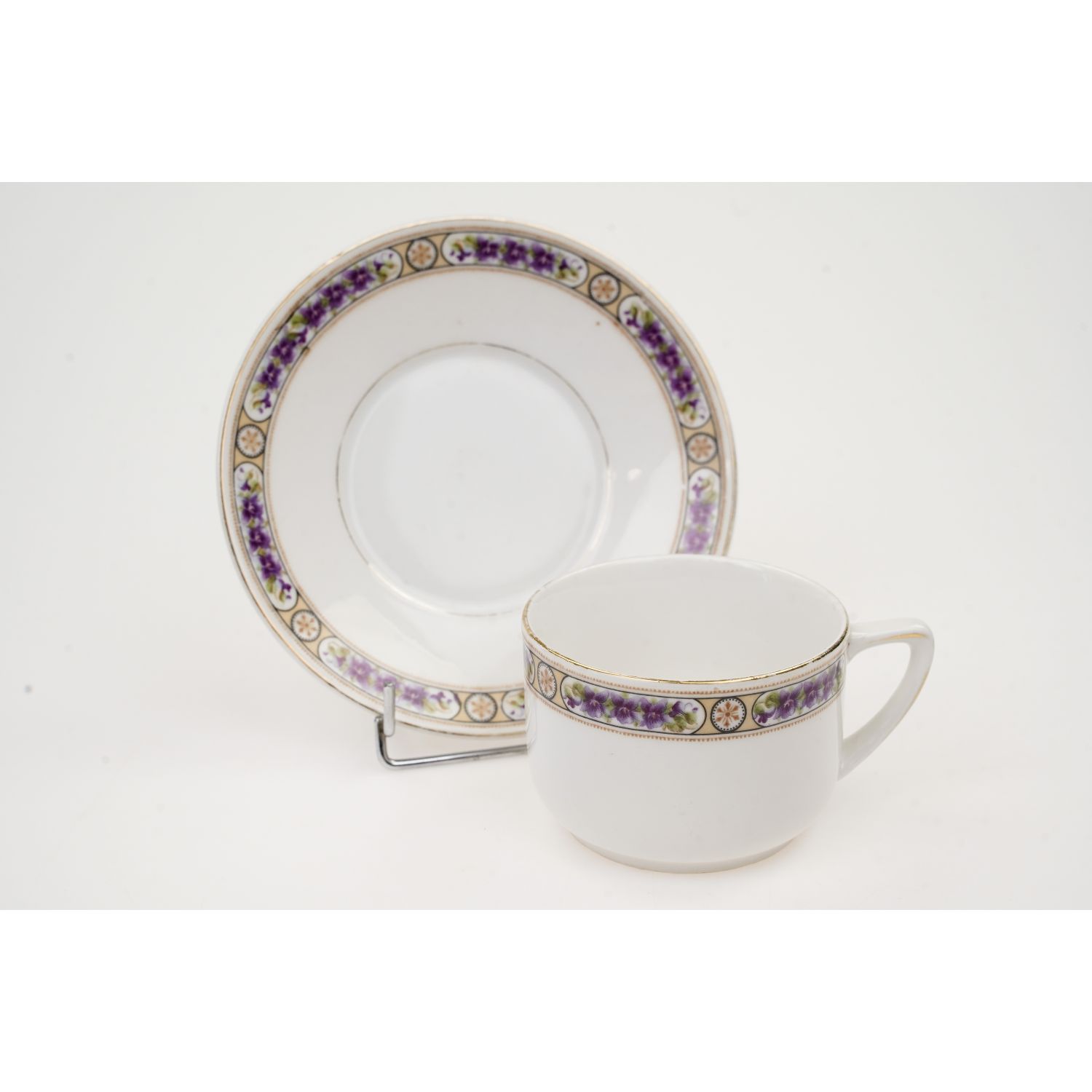 Pochodzi z Wałbrzycha (niem. Waldenburg), z Krister Porzellan-Manufaktur A.G. Sygnowana znakiem stosowanym od 1898 do 1926 roku. Porcelana w odcieniu bieli, grubsza. Filiżanka o intrygującym, prostym kształcie z prostym uszkiem. Porcelanę zdobi szlaczek z fiołeczkami przy krawędziach obu elementów. Kontury zdobione złoceniami.
