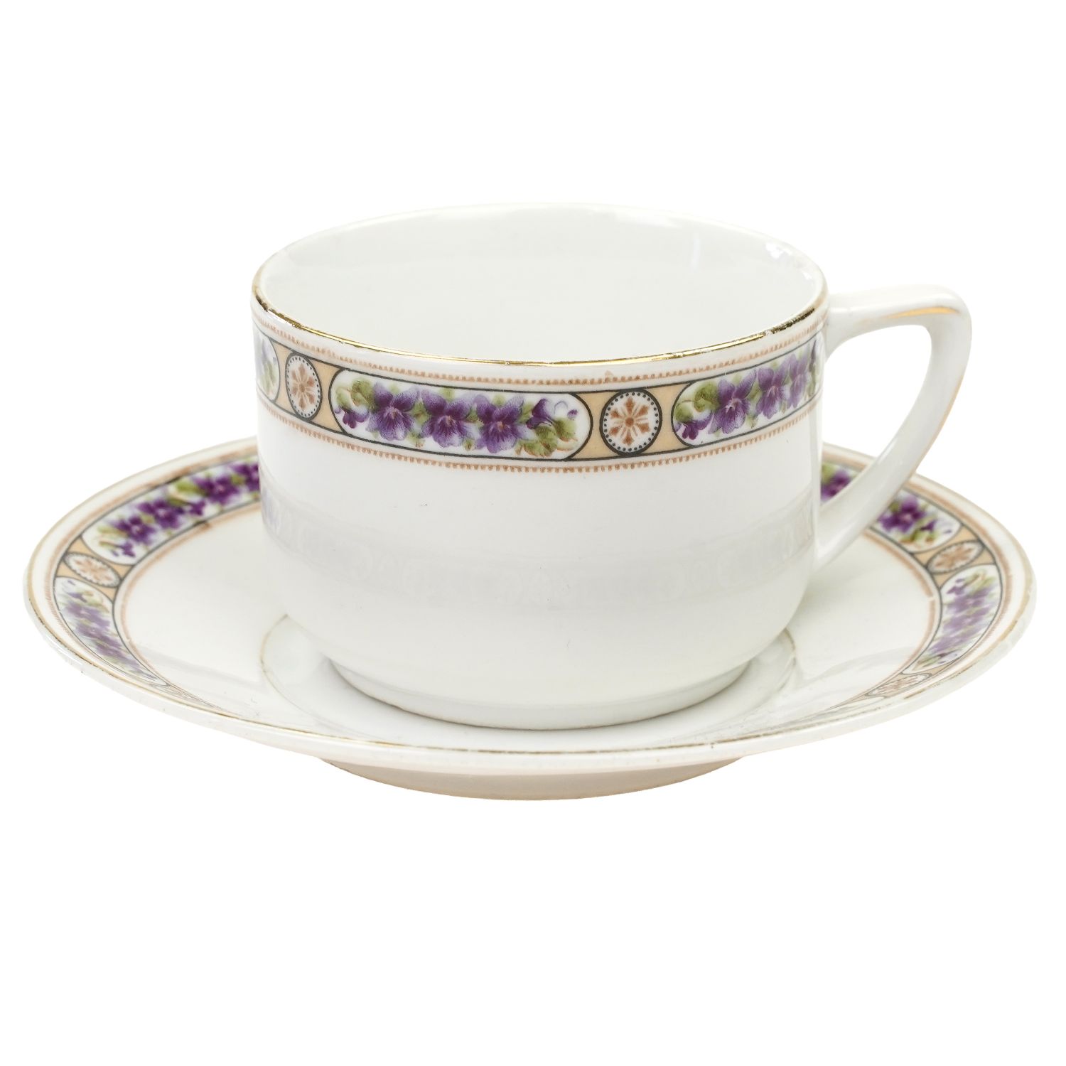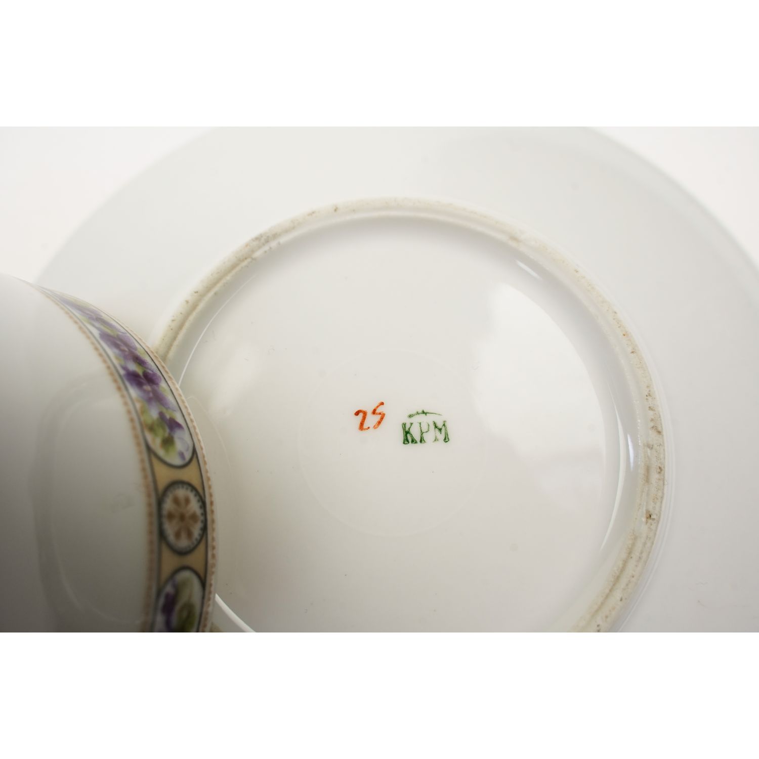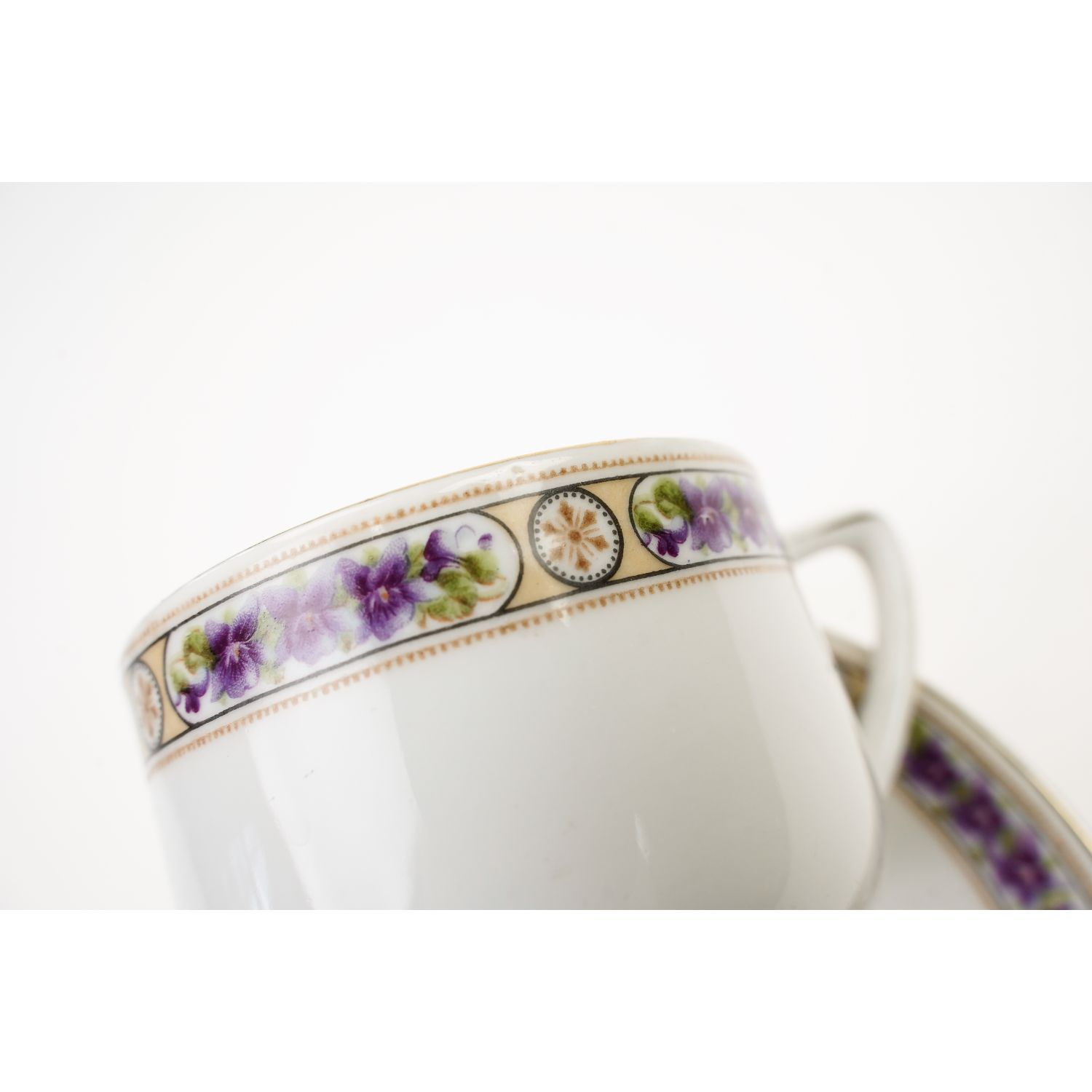 Pochodzi z Wałbrzycha (niem. Waldenburg), z Krister Porzellan-Manufaktur A.G. Sygnowana znakiem stosowanym od 1898 do 1926 roku. Porcelana w odcieniu bieli, grubsza. Filiżanka o intrygującym, prostym kształcie z prostym uszkiem. Porcelanę zdobi szlaczek z fiołeczkami przy krawędziach obu elementów. Kontury zdobione złoceniami.