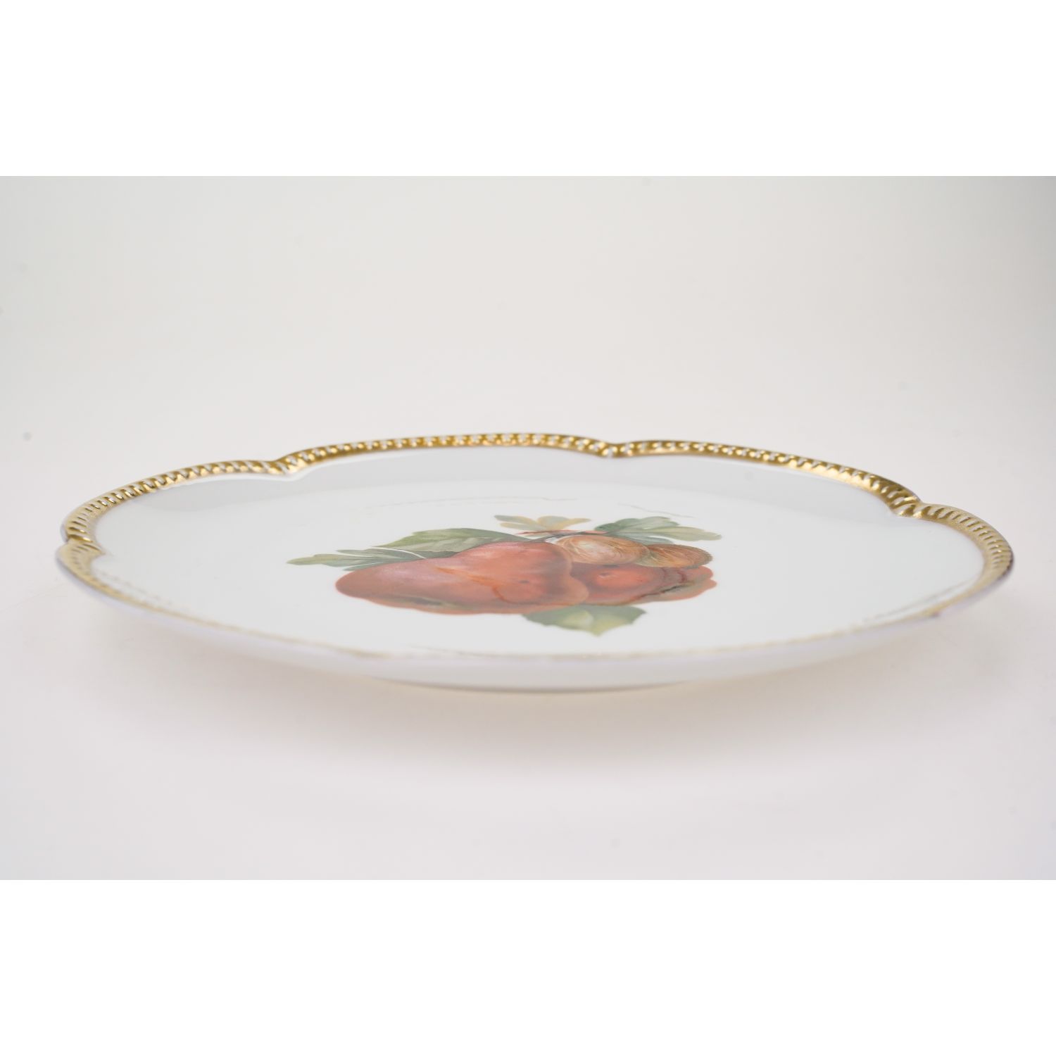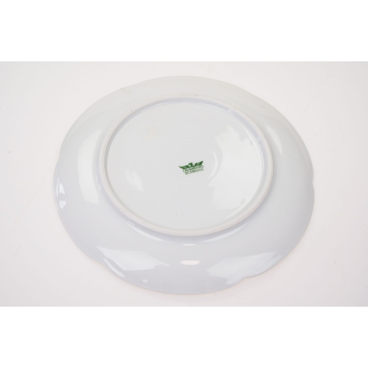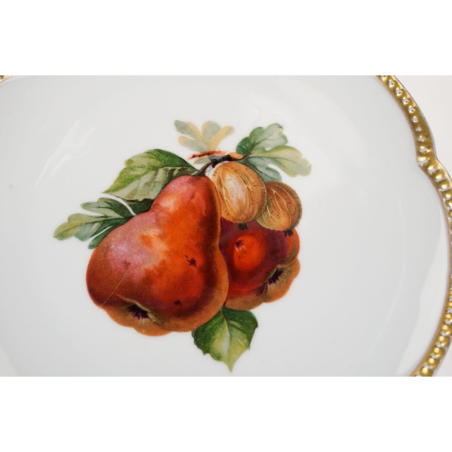 Pochodzi z Selb z Krautheim & Adalberg Porzellanfabrik. Sygnowana znakiem stosowanym od 1922 do 1945 roku. Porcelana biała z falowanym rantem wykończonym perlaturą. Perełki powleczone złotem już trochę przetartym. Na lustrze smakowity bukiet owoców: gruszki i agrest.