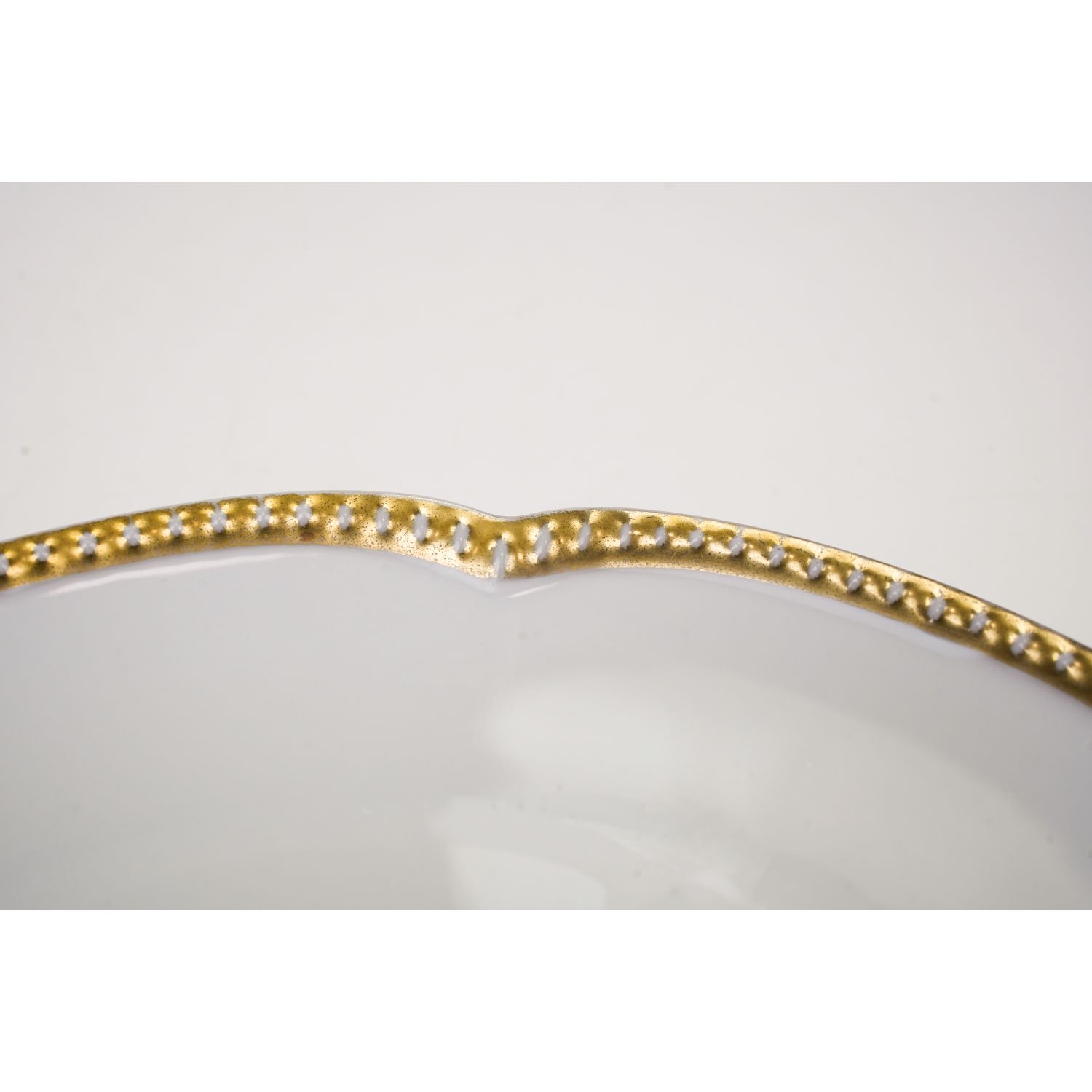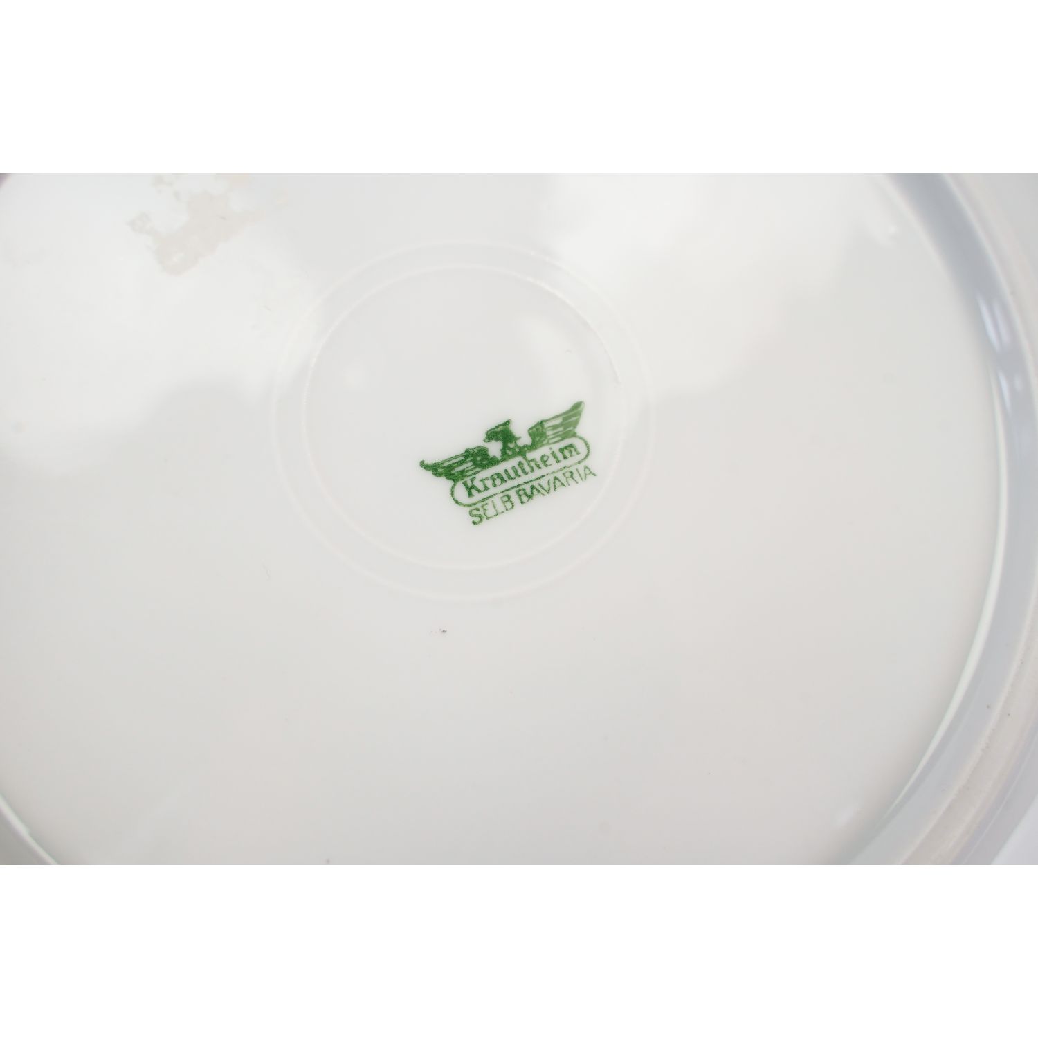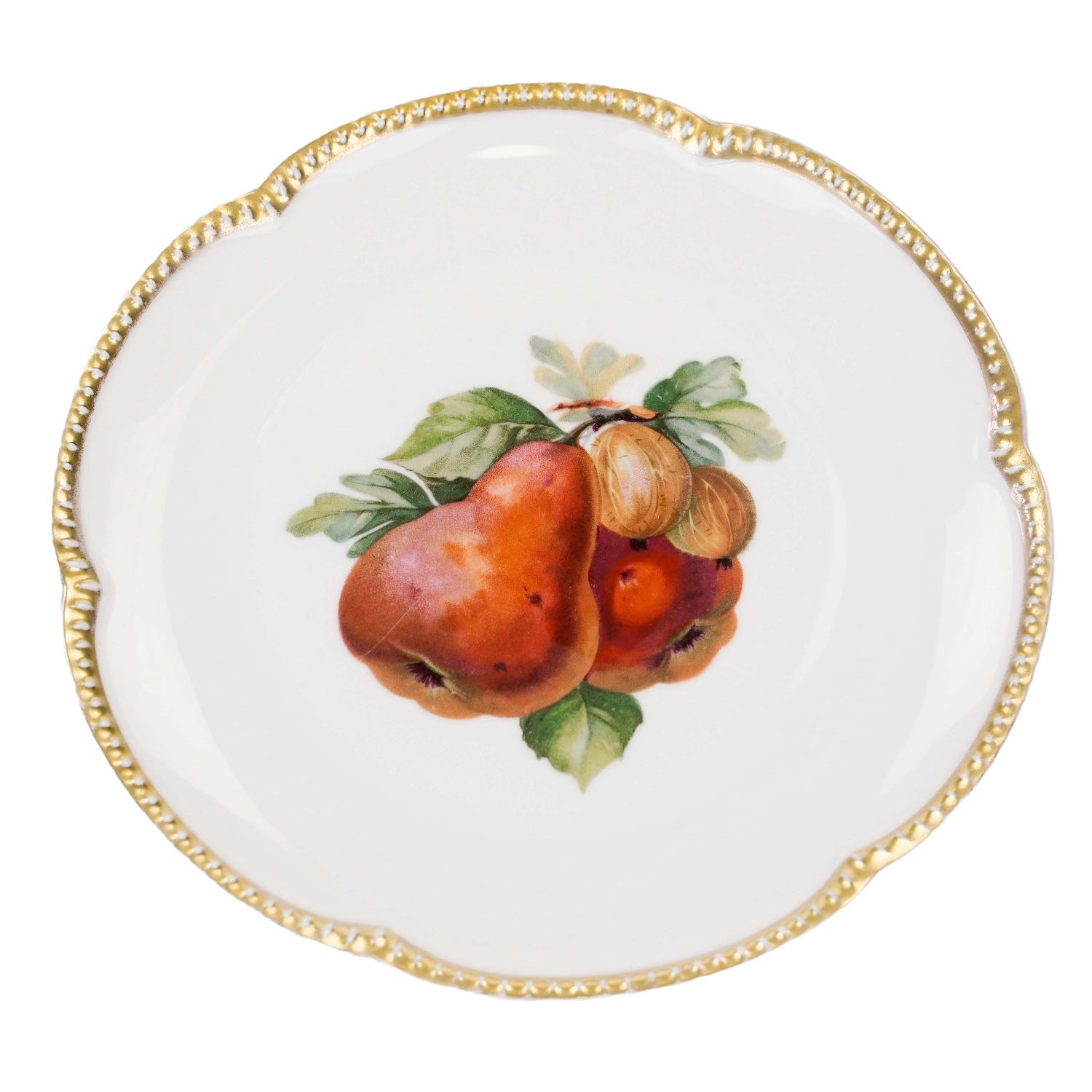 Pochodzi z Selb z Krautheim & Adalberg Porzellanfabrik. Sygnowana znakiem stosowanym od 1922 do 1945 roku. Porcelana biała z falowanym rantem wykończonym perlaturą. Perełki powleczone złotem już trochę przetartym. Na lustrze smakowity bukiet owoców: gruszki i agrest.