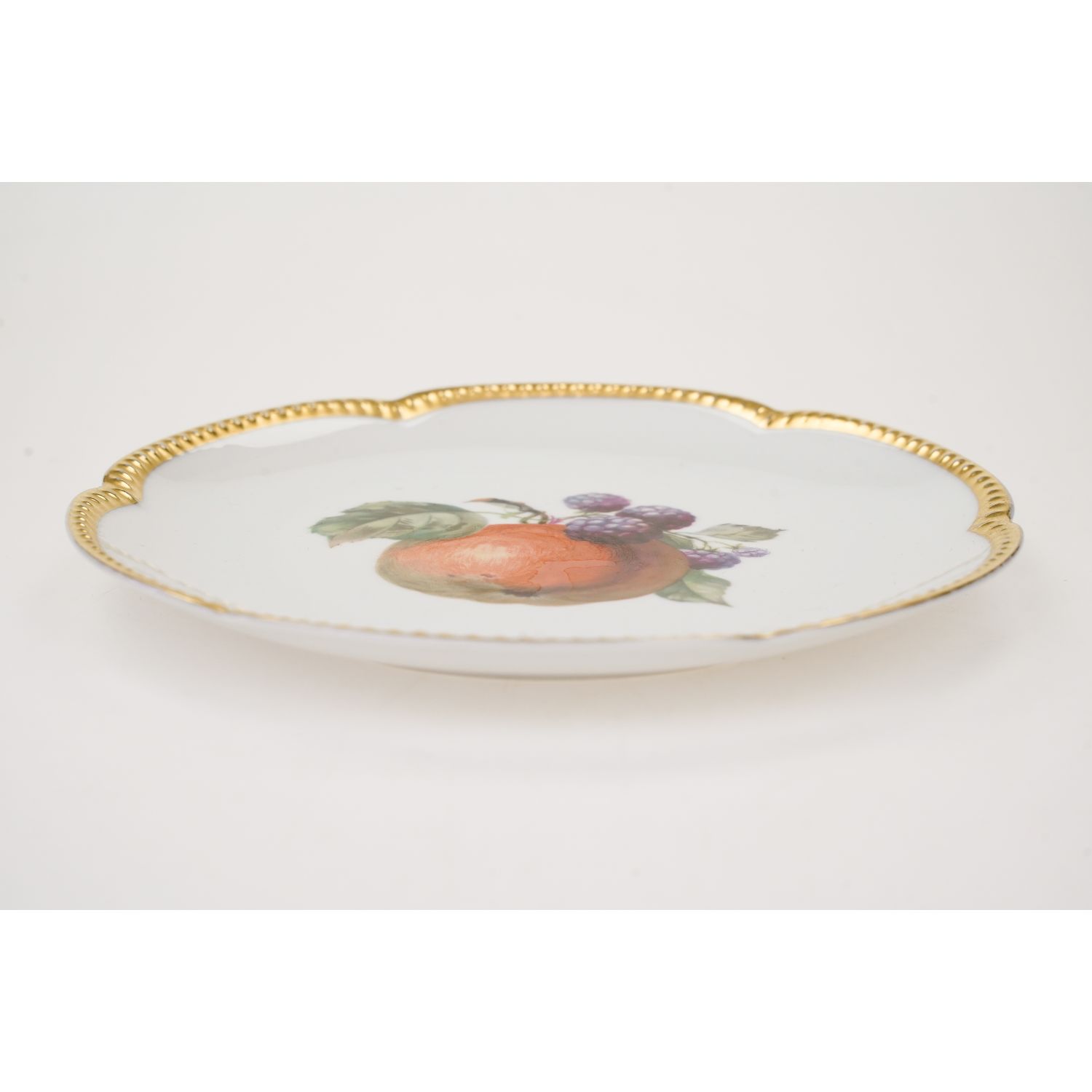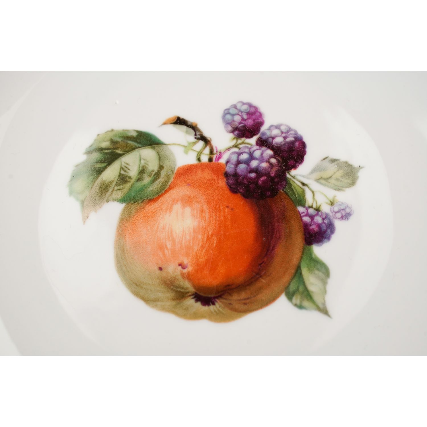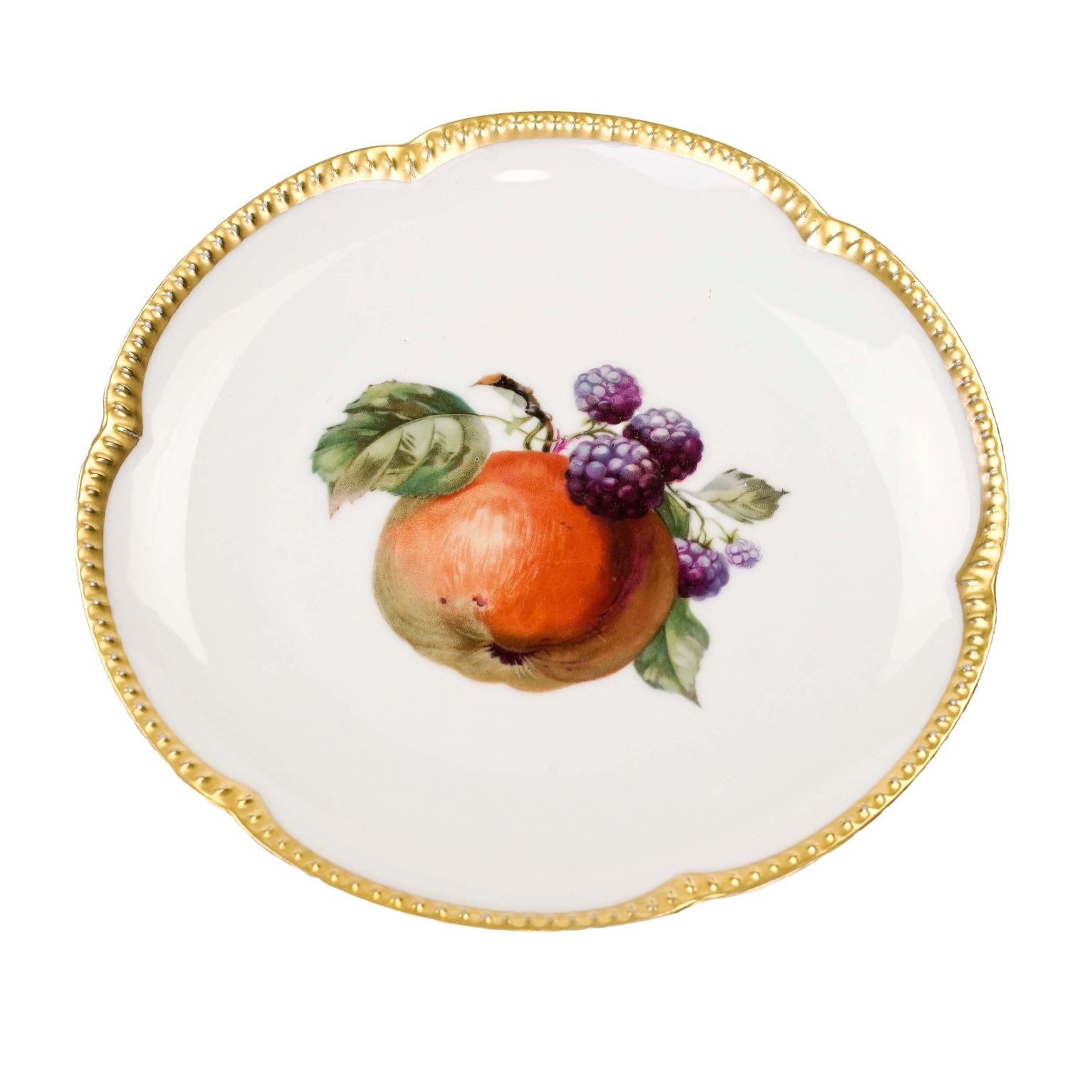 Pochodzi z Selb z Krautheim & Adalberg Porzellanfabrik. Sygnowana znakiem stosowanym od 1914 do 1922 roku. Porcelana biała z falowanym rantem wykończonym perlaturą pokrytą złotem. Na lustrze smakowity bukiet owoców: jabłuszko i jeżyny.