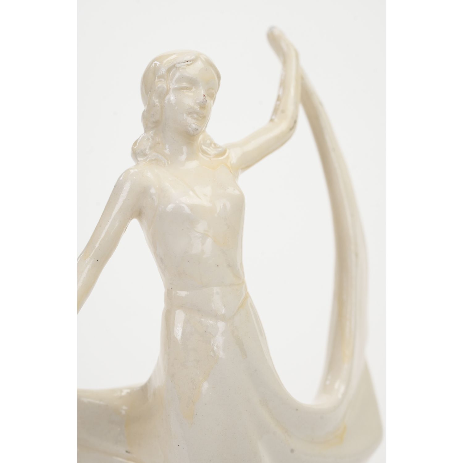 Wykonana z ceramiki w kolorze kości, szkliwiona. Sygnowana jedynie znakiem numerycznym na cokole. Utrzymana w stylu secesji - podłużna figura z pociągłym liniami formy, ale zapewne wykonania nieco później. Przedstawia damę w letniej wieczorowej sukni. Końce sukni trzymane są w dłoniach i uniesione w górę. Widzimy wyciągniętą prawą stopę ubraną w but na wysokim obcasie. Twarz ładnie wykonana, na głowie długie włosy ułożone w ładną fryzurę. Postać osadzona na okrągłym cokole z wypustem z tyłu. Całość prezentuje się dostojnie.