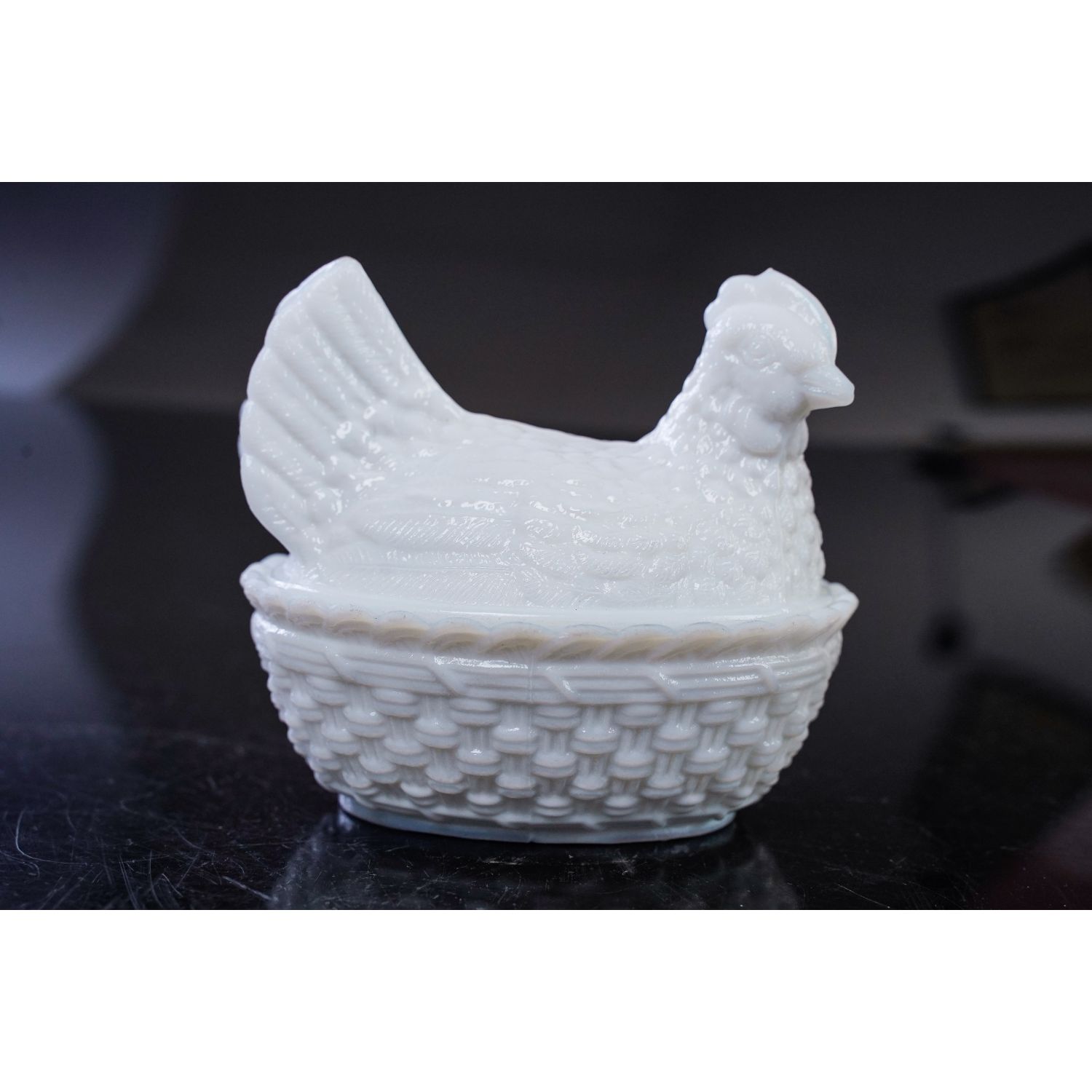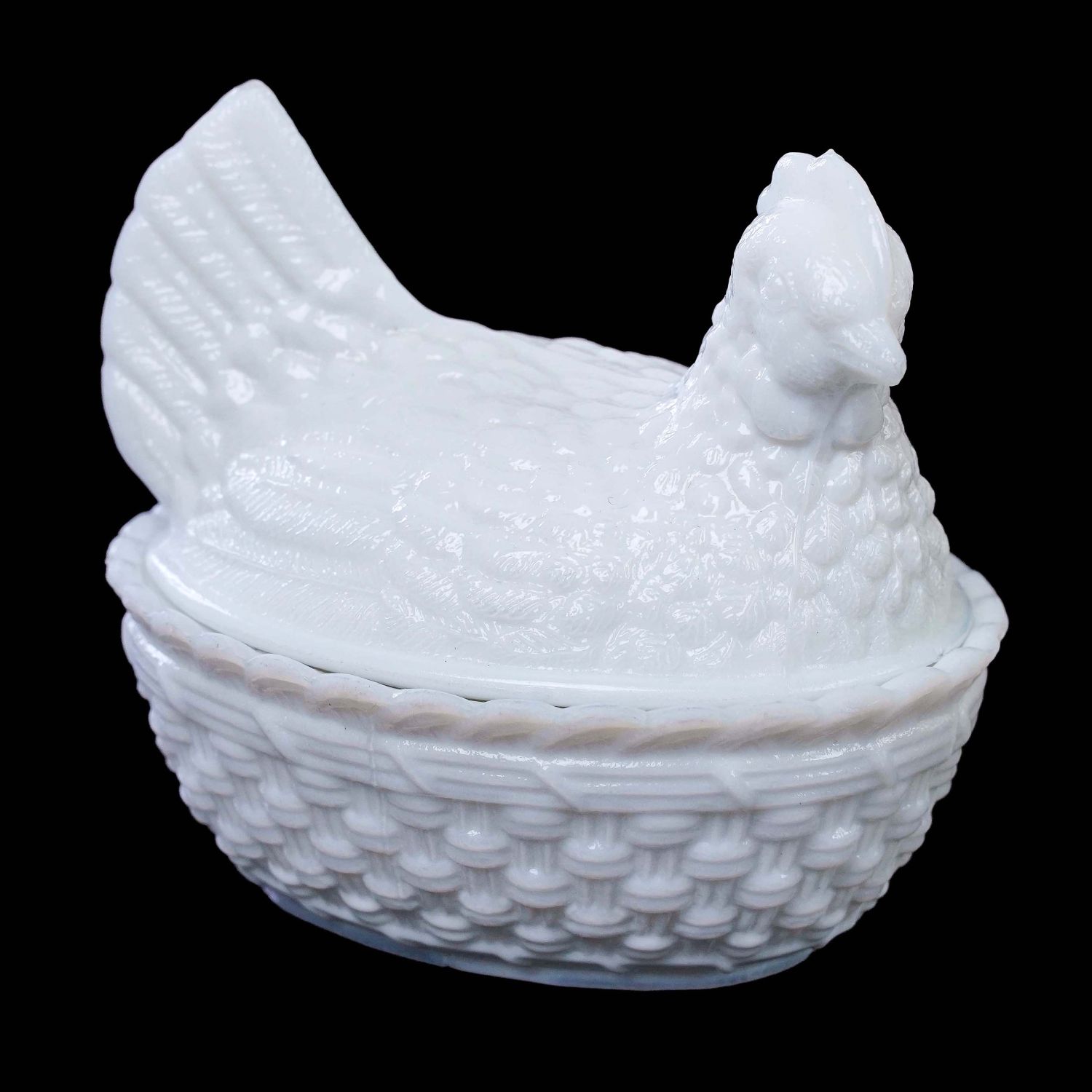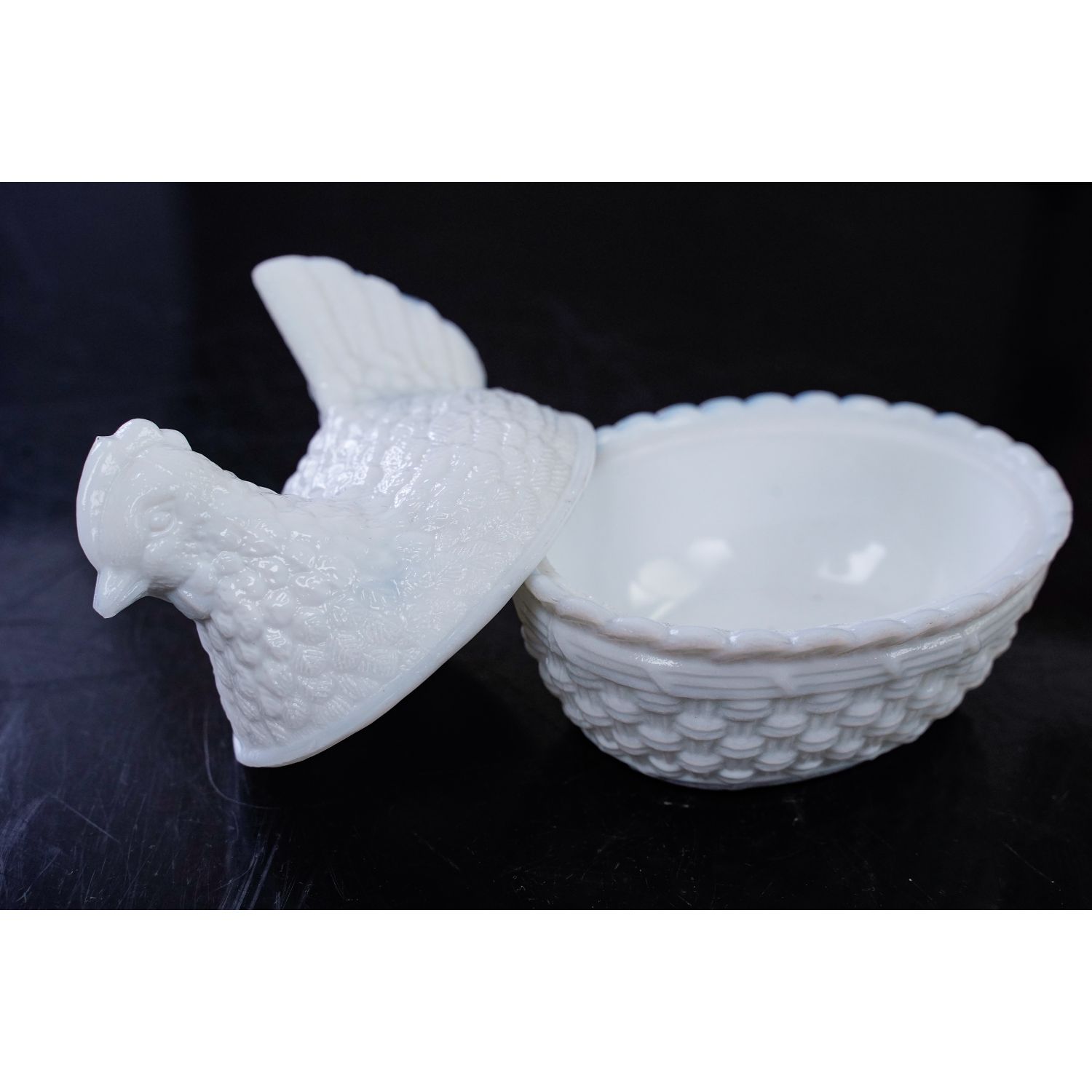 Wykonana ze szkła prasowanego, barwionego w masie na kolor mleka, biały. Góra ma kształt kwoki, dół to pleciony koszyczek. Kura siedzi w koszu. Przy krawędzi nie ma jaj, i nie ma XXX od spodu.