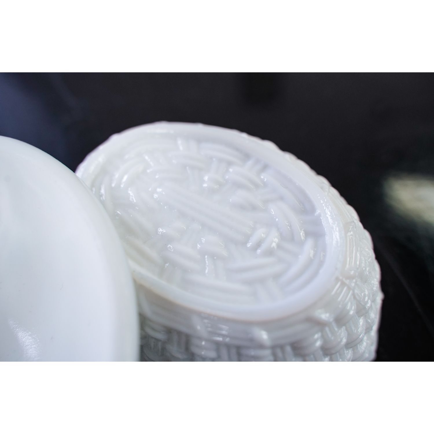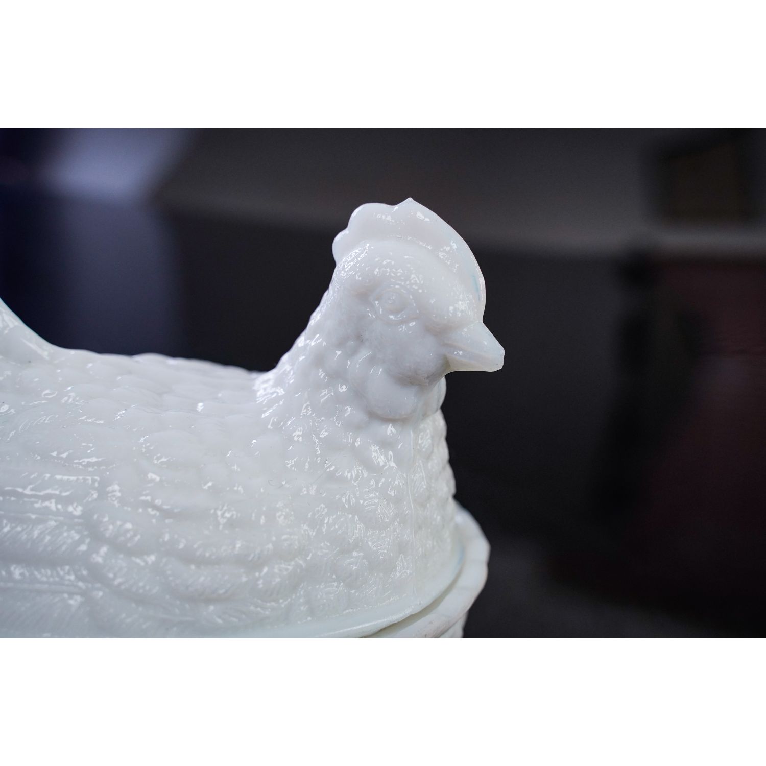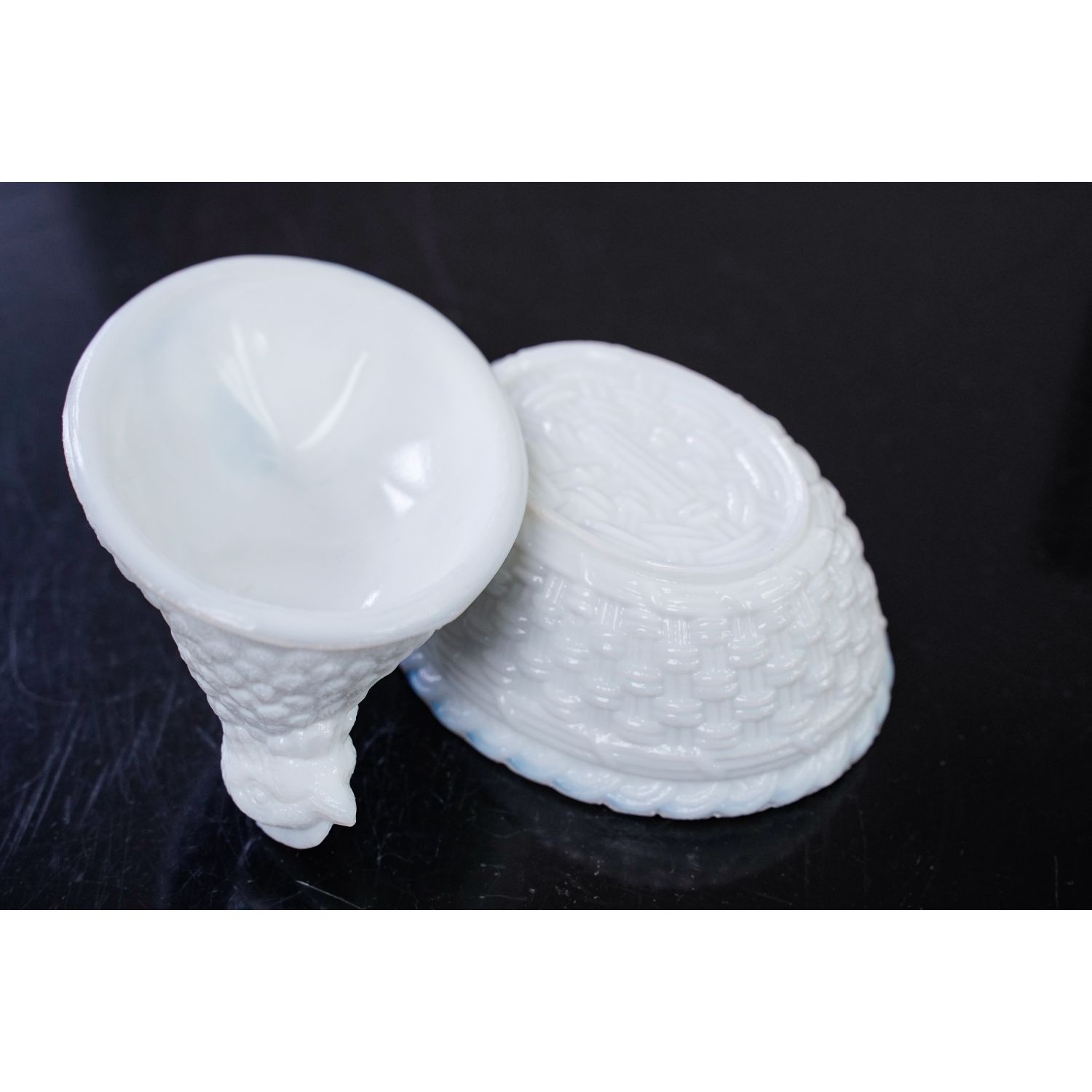 Wykonana ze szkła prasowanego, barwionego w masie na kolor mleka, biały. Góra ma kształt kwoki, dół to pleciony koszyczek. Kura siedzi w koszu. Przy krawędzi nie ma jaj, i nie ma XXX od spodu.