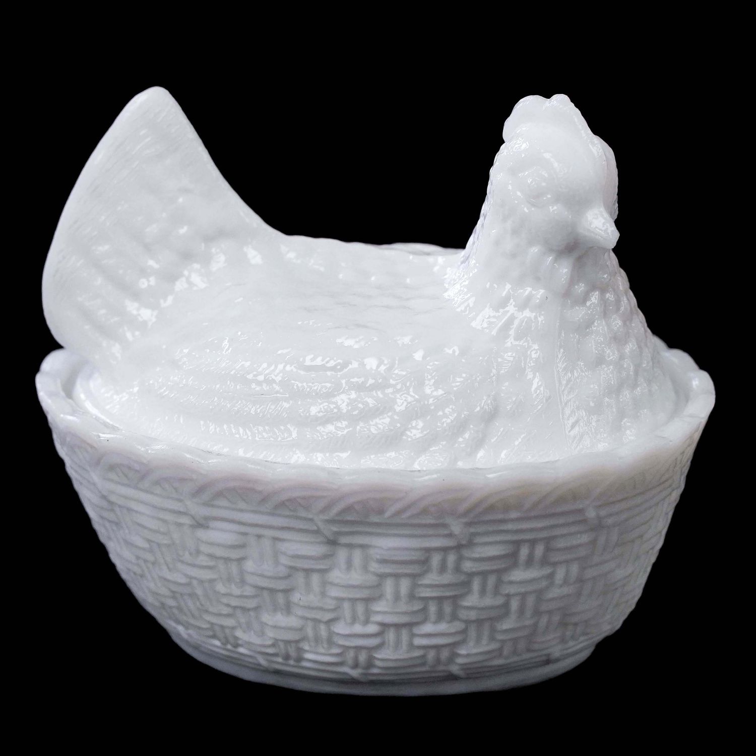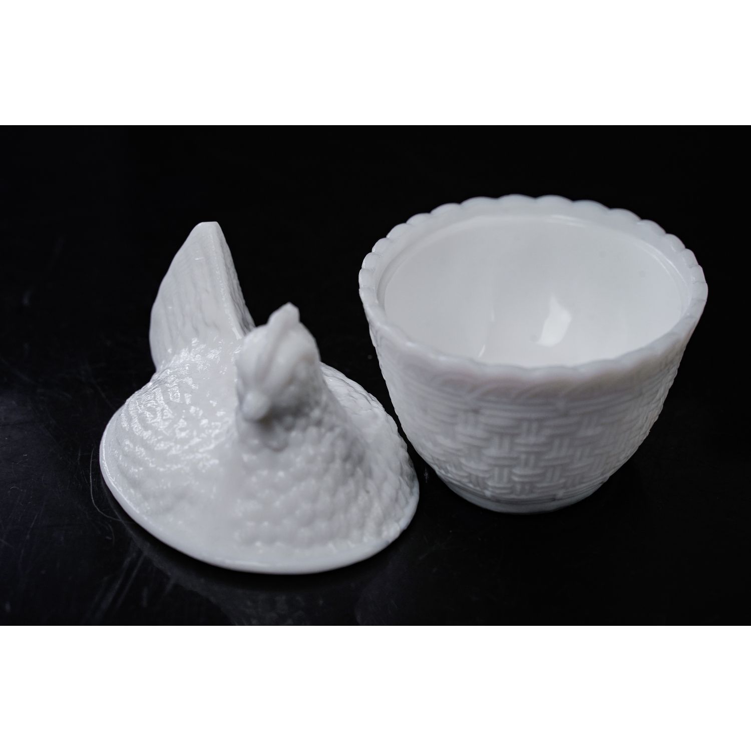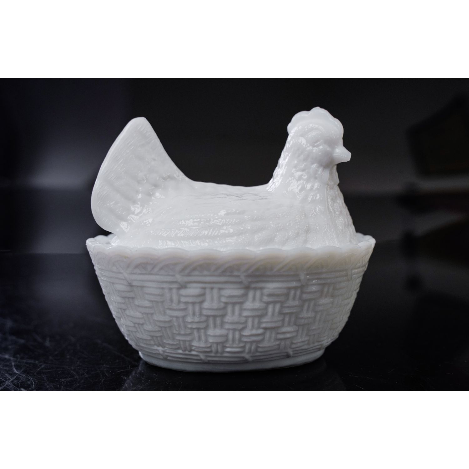 Wykonana ze szkła prasowanego, barwionego w masie na kolor mleka, biały. Góra ma kształt kwoki, dół to pleciony koszyczek. Kura siedzi w koszu. Przy krawędzi nie ma jaj, i nie ma XXX od spodu.