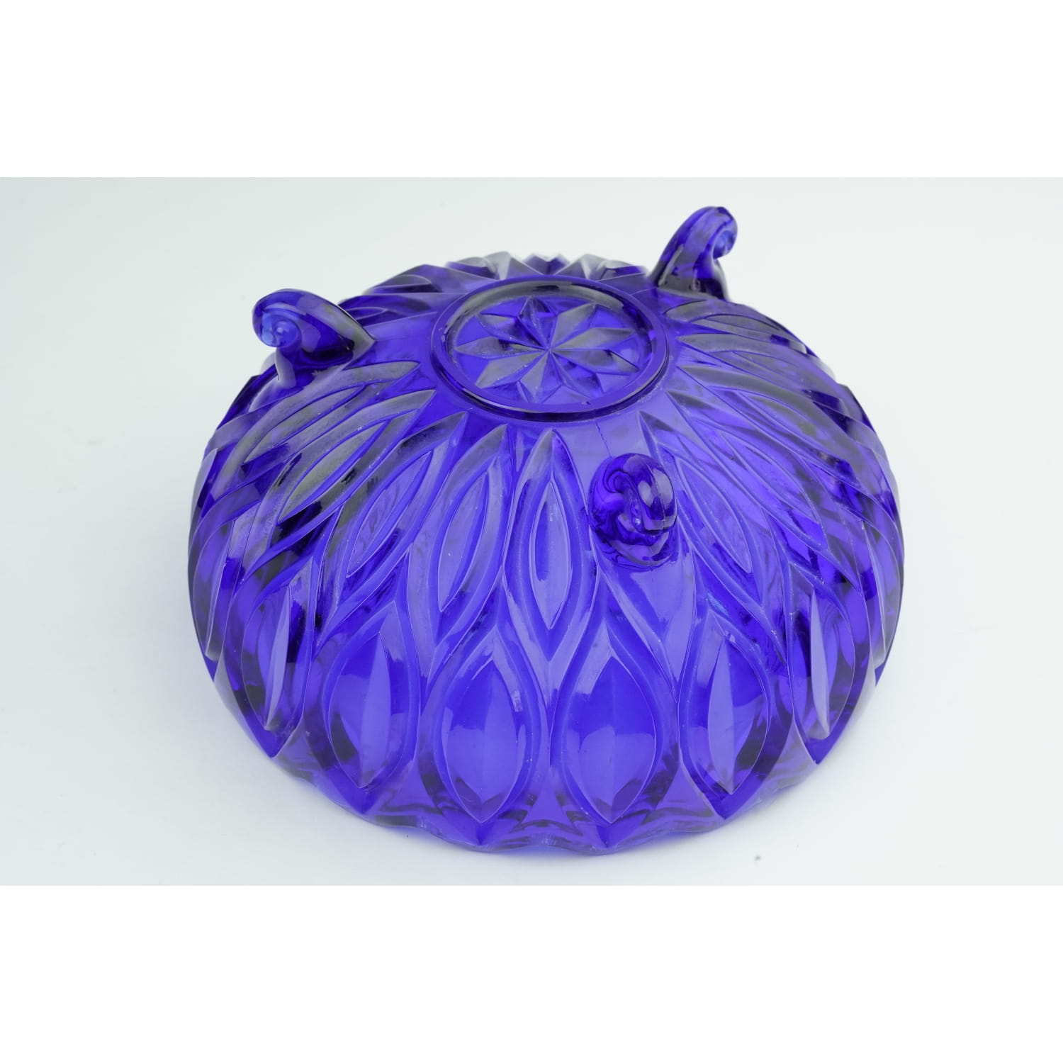 Pochodzi z Niemiec z Kombinat Lausitzer Glas Weisswasser, model Orion z 1969 roku. Szkło prasowane w odcieniu kobaltowym. Cała pokryta tłoczeniami w migdały, rant wykończony zębami, na dnie rozeta. Całość osadzona na trzech ślimaczych nóżkach. Kolor zdecydowanie ładniejszy niż na zdjęciach!