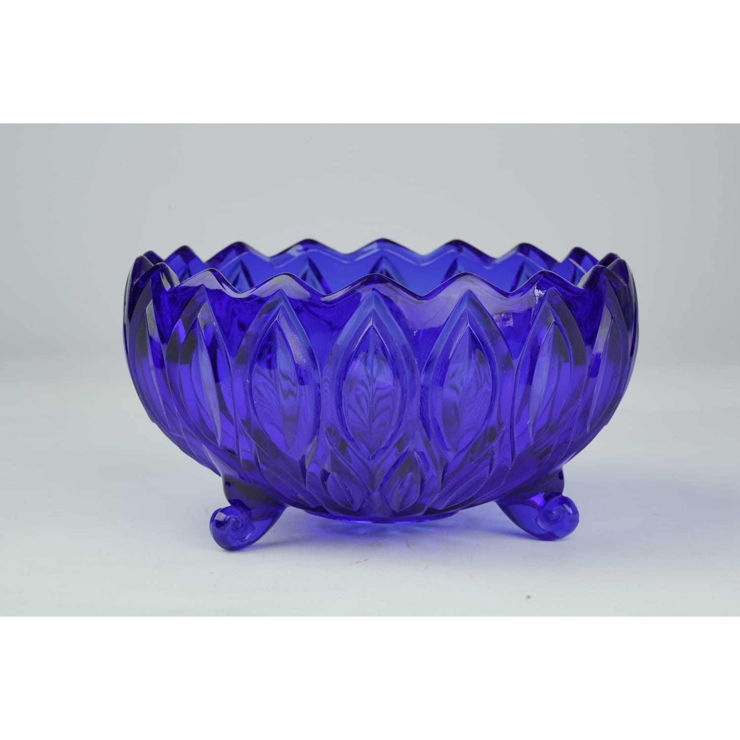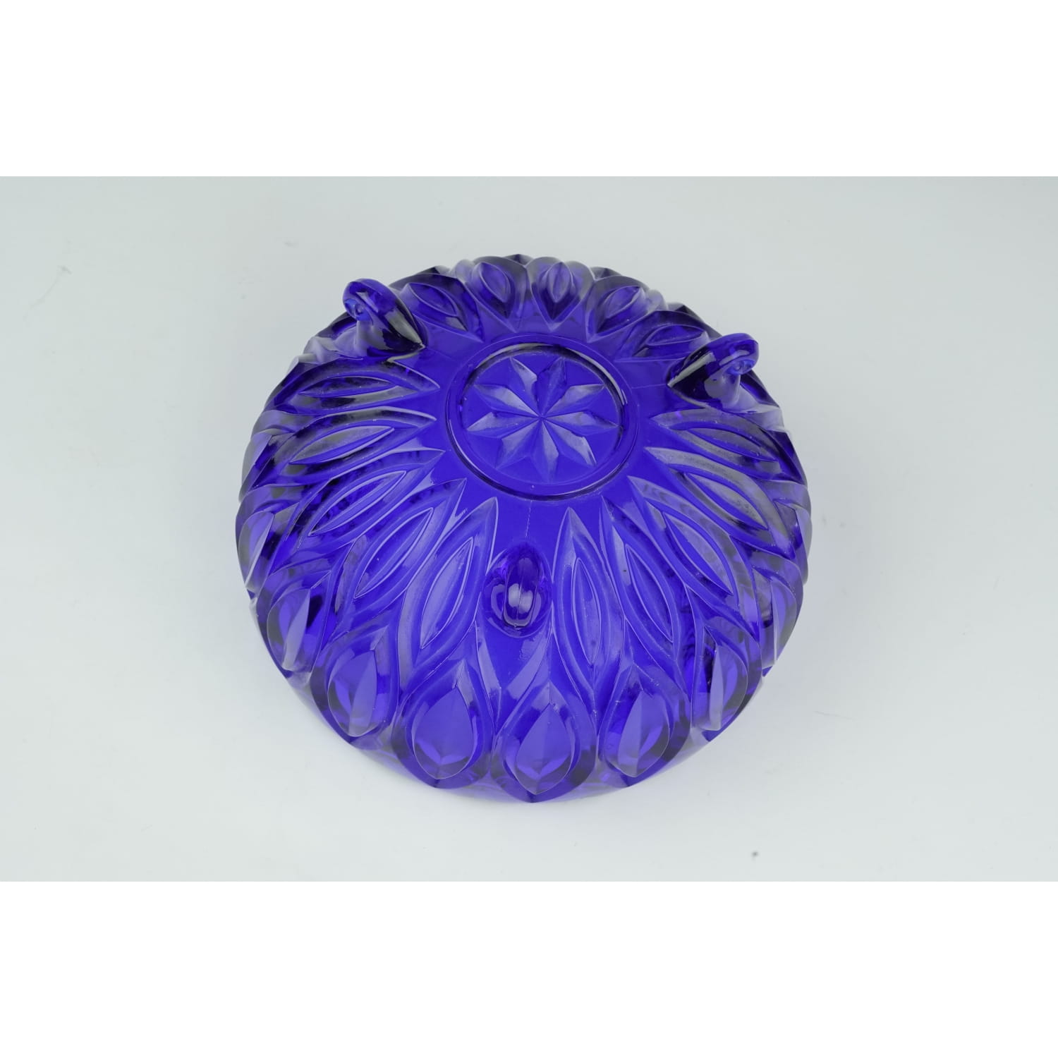 Pochodzi z Niemiec z Kombinat Lausitzer Glas Weisswasser, model Orion z 1969 roku. Szkło prasowane w odcieniu kobaltowym. Cała pokryta tłoczeniami w migdały, rant wykończony zębami, na dnie rozeta. Całość osadzona na trzech ślimaczych nóżkach. Kolor zdecydowanie ładniejszy niż na zdjęciach!