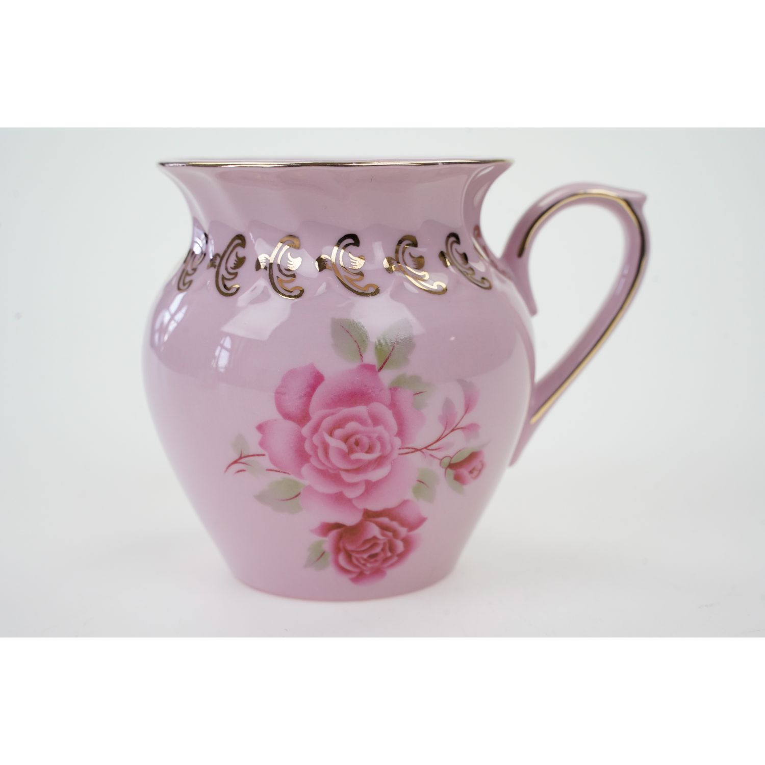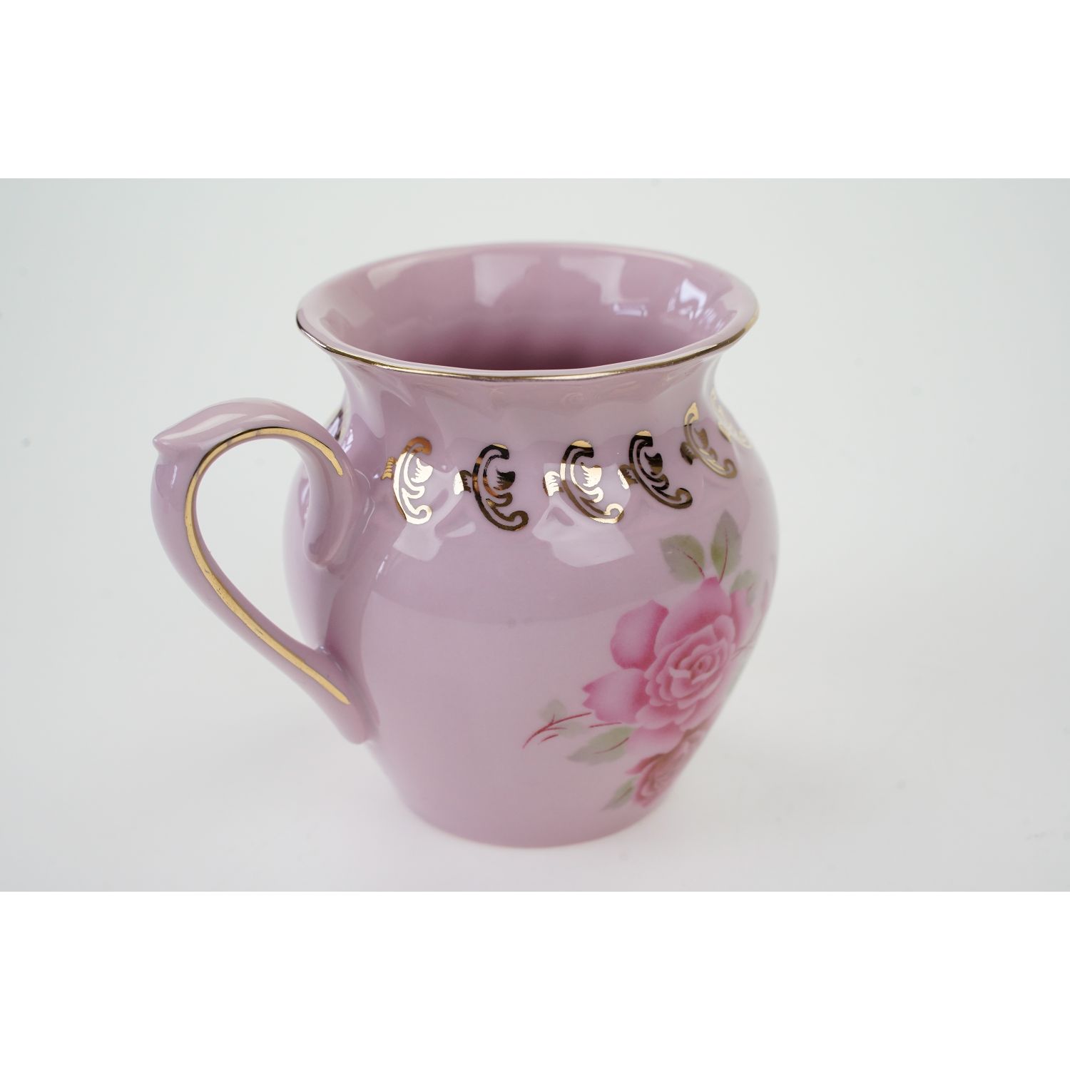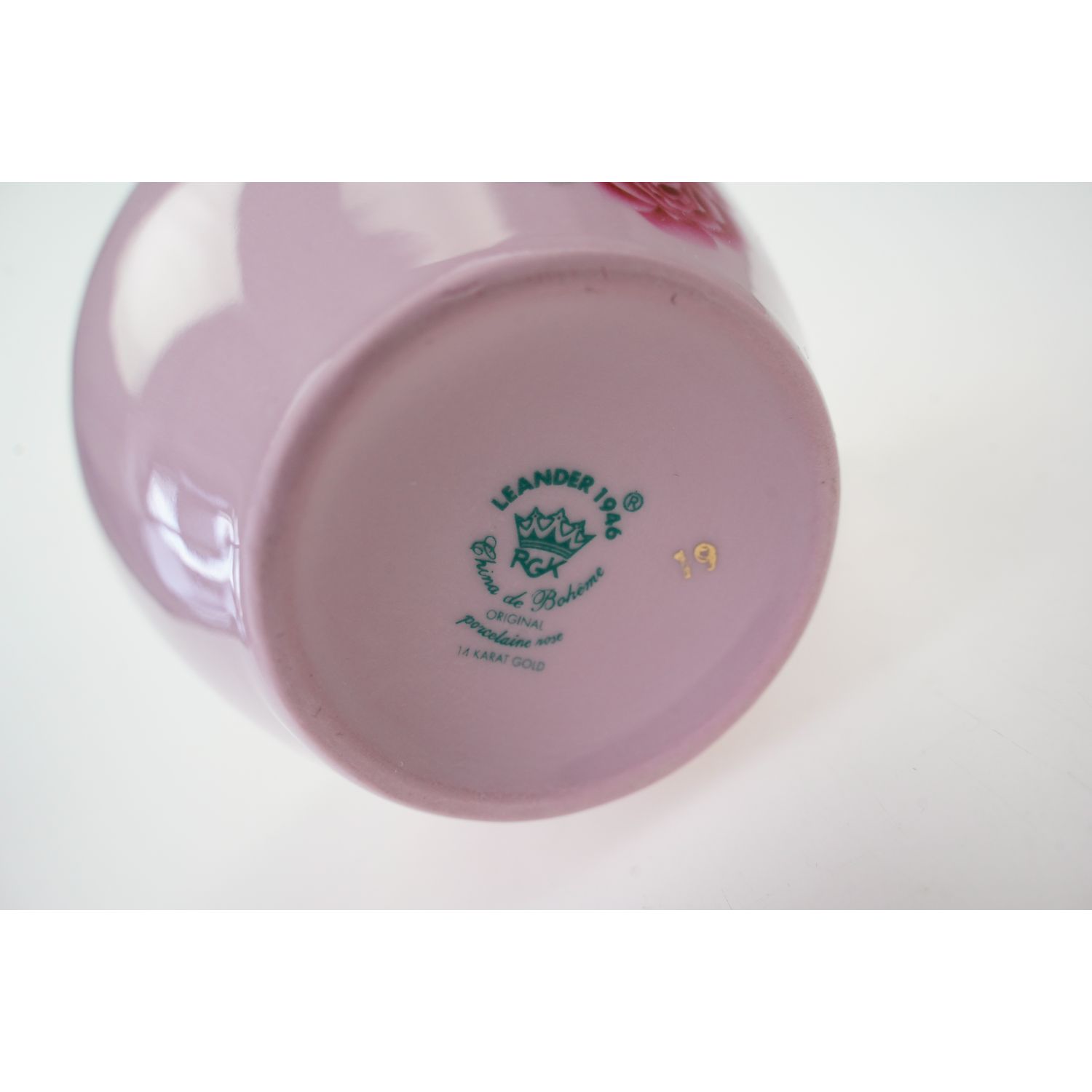 Pochodzi z Czech z miejscowości Loučky, (Leander Porcelán Loučky s.r.o.). Sygnatura z dopiskiem "Handgemalt i 14 karat gold". Fason Alba. Porcelana różowa, którą otrzymuje się dzięki dodatkowi złota. Śliczna, pękata forma dekorowana delikatnymi reliefami w górnej części, podkreślonymi złoceniami. Na porcelanie bukiety różowych róż. Cudowny kształt i zachwycająca forma. Wykończona złoceniami na konturach.