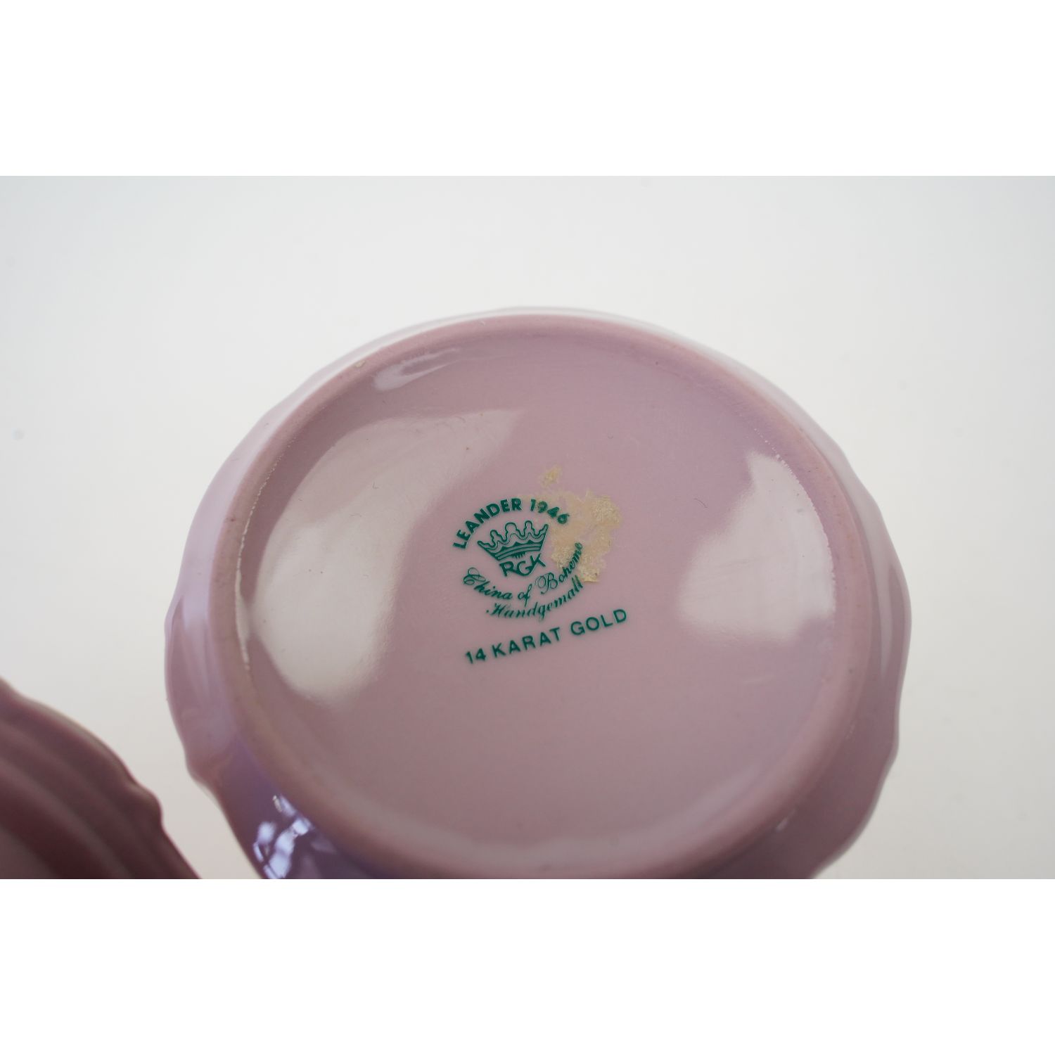 Pochodzi z Czech z miejscowości Loučky z Leander Porcelán Loučky s.r.o. Sygnatura z dopiskiem "Hand Painted 14 karat gold". Fason Amis. Porcelana w kolorze różowym, którą to barwę otrzymuje się przez dodatek złota. Ma prostą formę z pionowymi kanelowaniami i falowaną górną krawędzią podkreśloną złoceniem. Ozdobione różowo-białymi kwiatuszkami. Sterczynka w kształcie płomienia.
